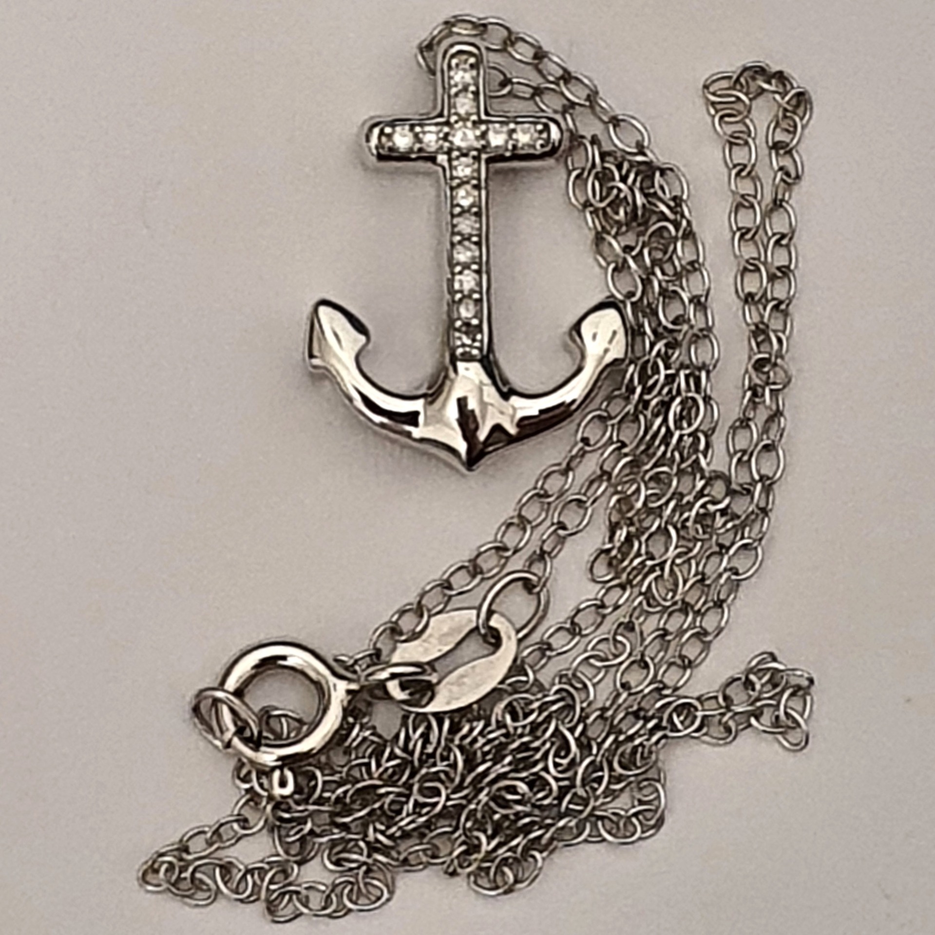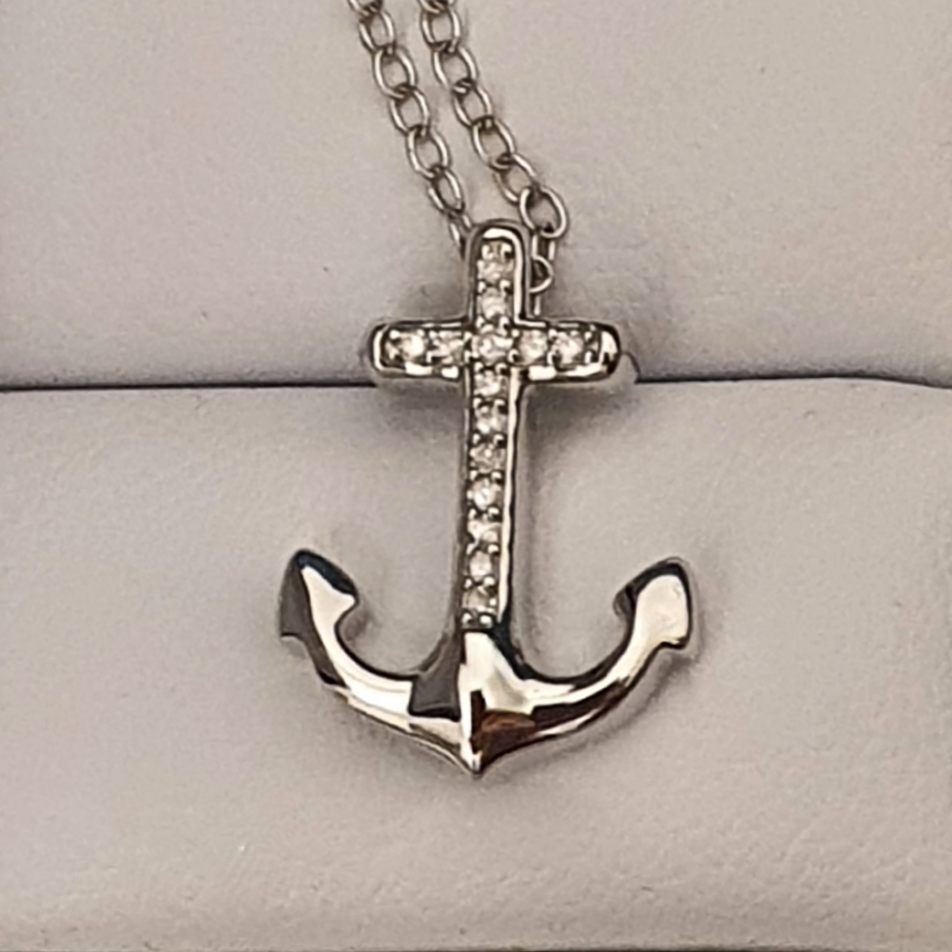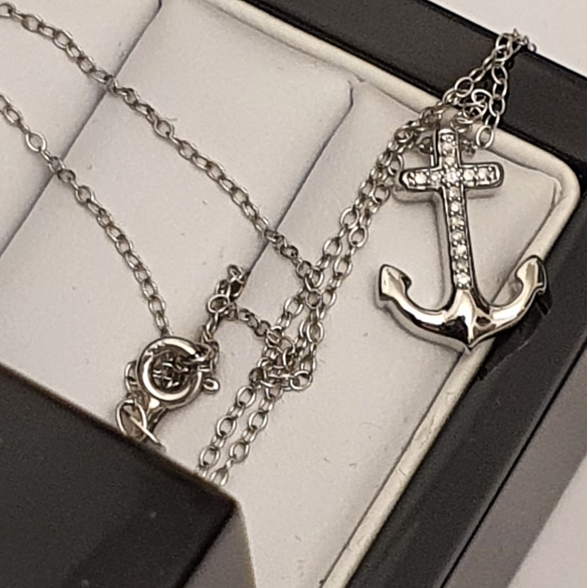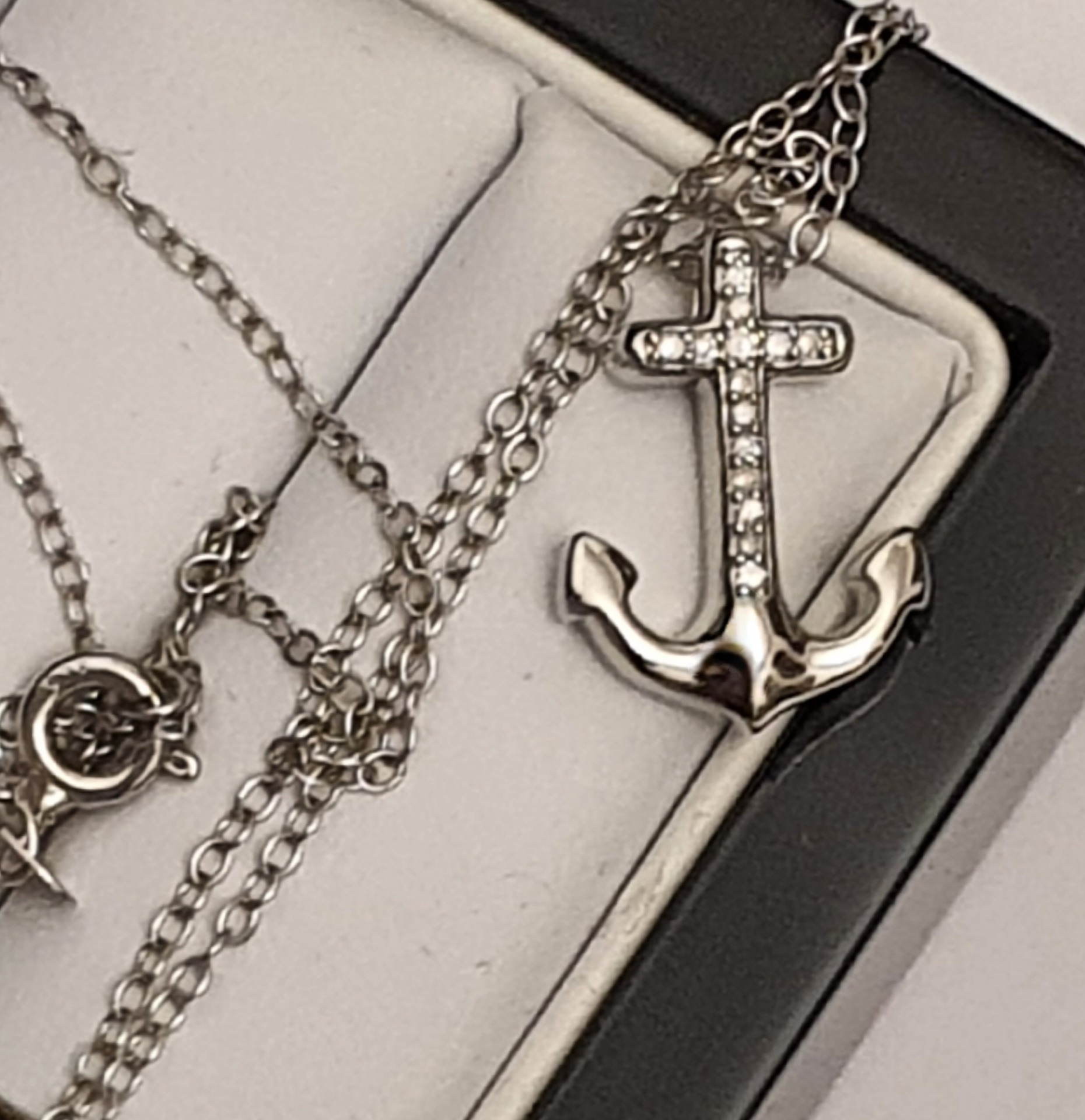 amuleta calatorului - lant cu pandantiv argint 925 rodiat, in greutate de 2.12 grame, ornat cu 14 diamante naturale H/SI3 de 0.10ct; lantisorul are lungimea de 45cm si cruciulita-ancora are dimensiunile: 1.6 x 1.2cm