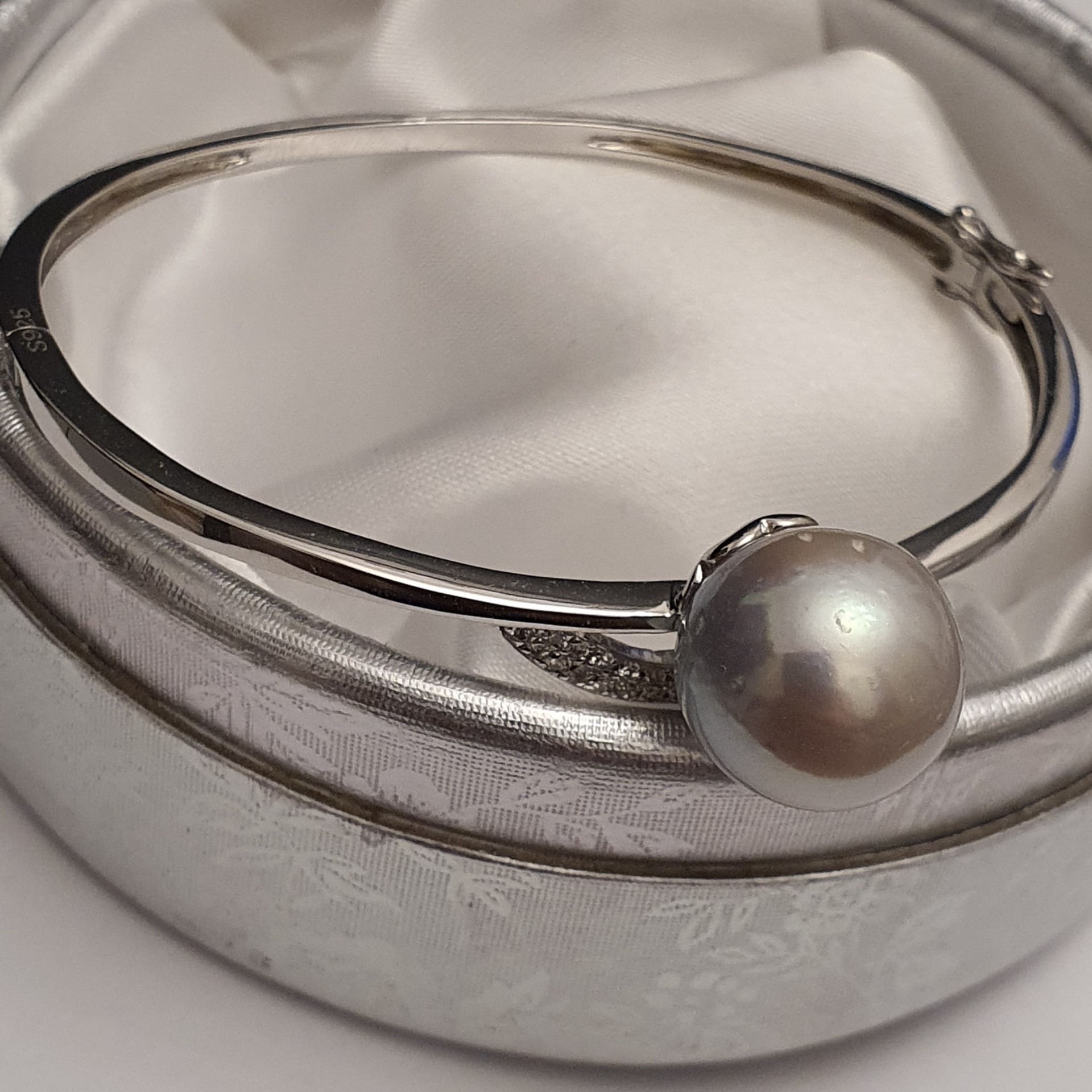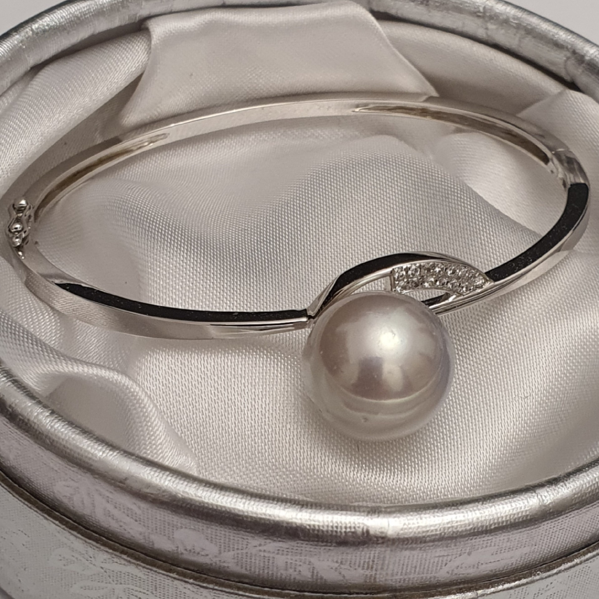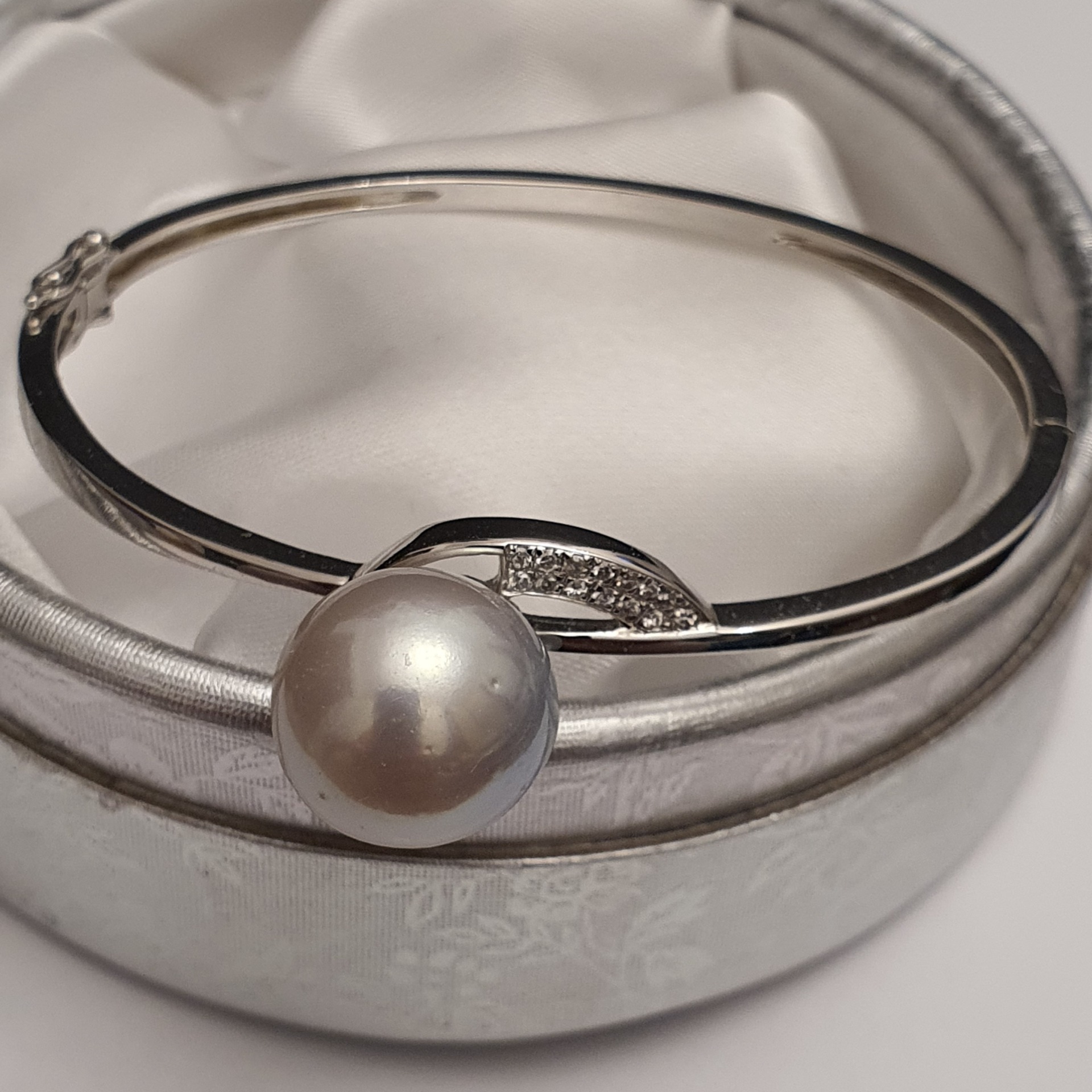 bratara argint 925 vermeil aur alb 18k, in greutate de 11.65grame, ornata cu cristale incolore si o perla naturala South Sea alb-argintie, cu imperfectiuni vizibile (vedeti pozele), rotunda de 13.3 - 13.5mm; dimensiuni la interior: 5,5 x 4,7cm (pentru o incheietura fina)