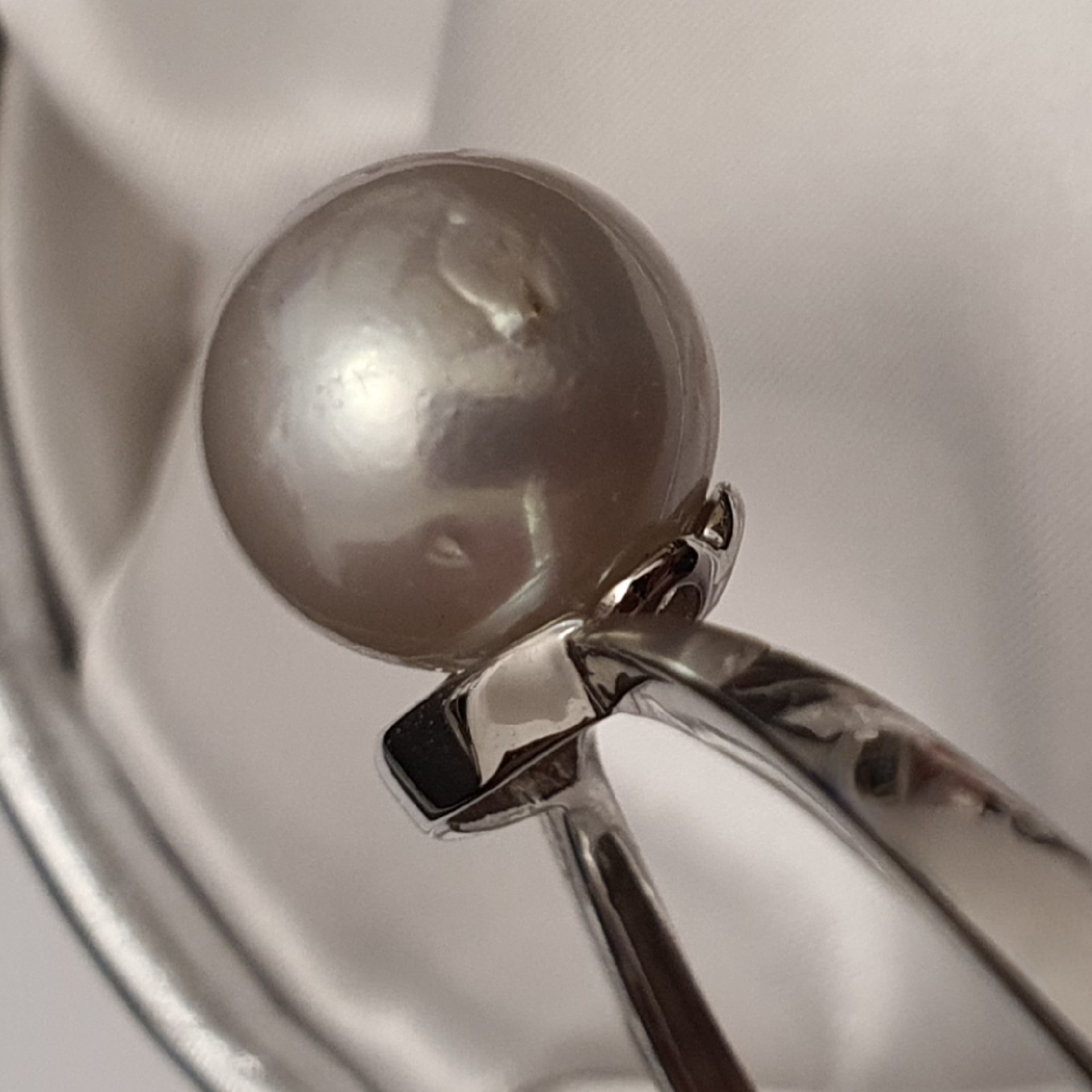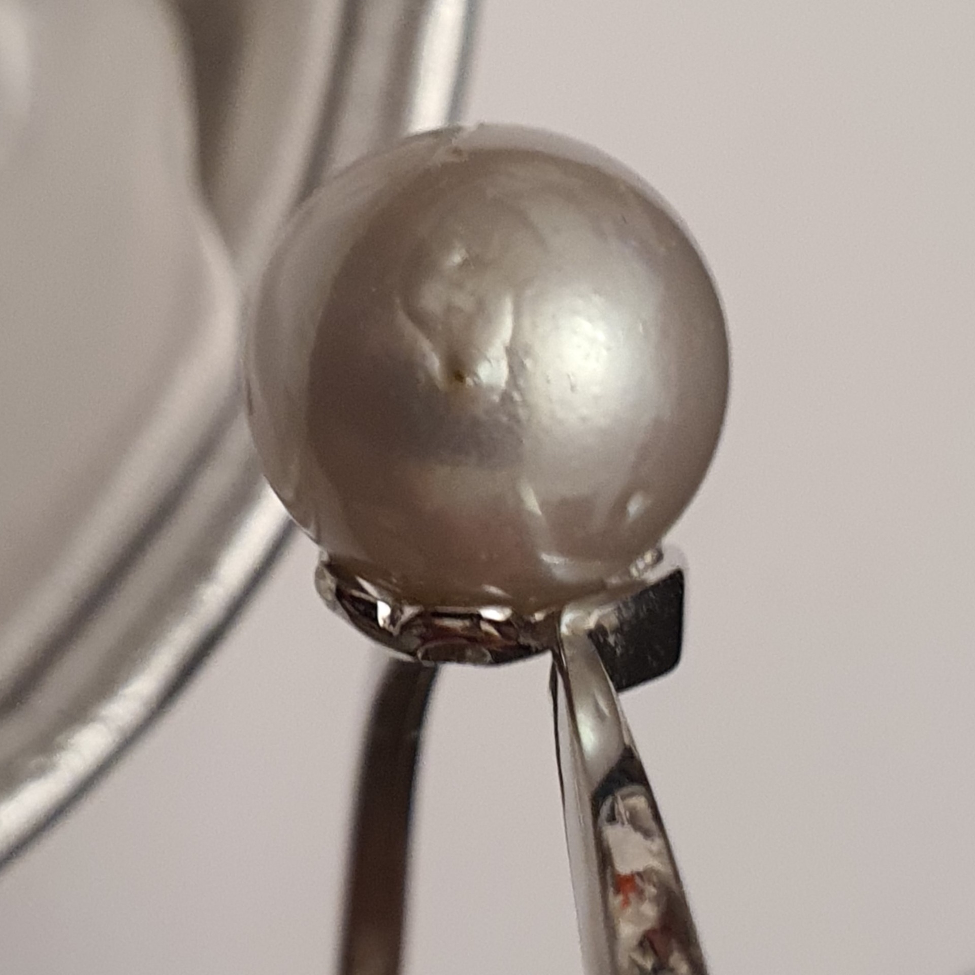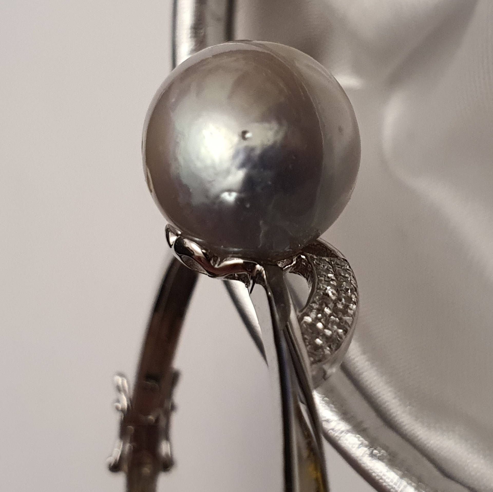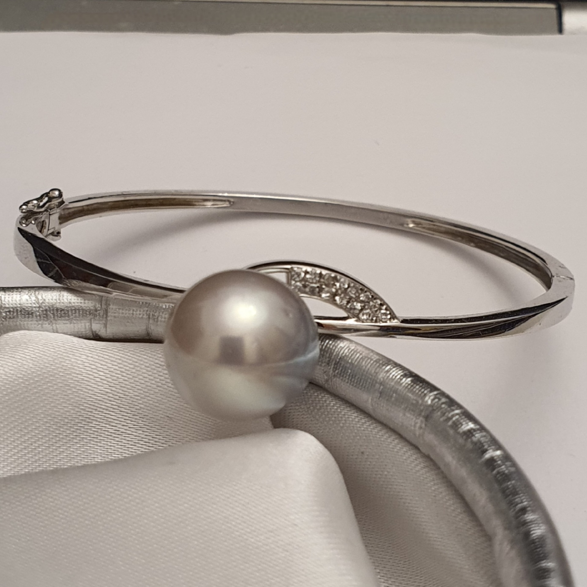 bratara argint 925 vermeil aur alb 18k, in greutate de 11.65grame, ornata cu cristale incolore si o perla naturala South Sea alb-argintie, cu imperfectiuni vizibile (vedeti pozele), rotunda de 13.3 - 13.5mm; dimensiuni la interior: 5,5 x 4,7cm (pentru o incheietura fina)