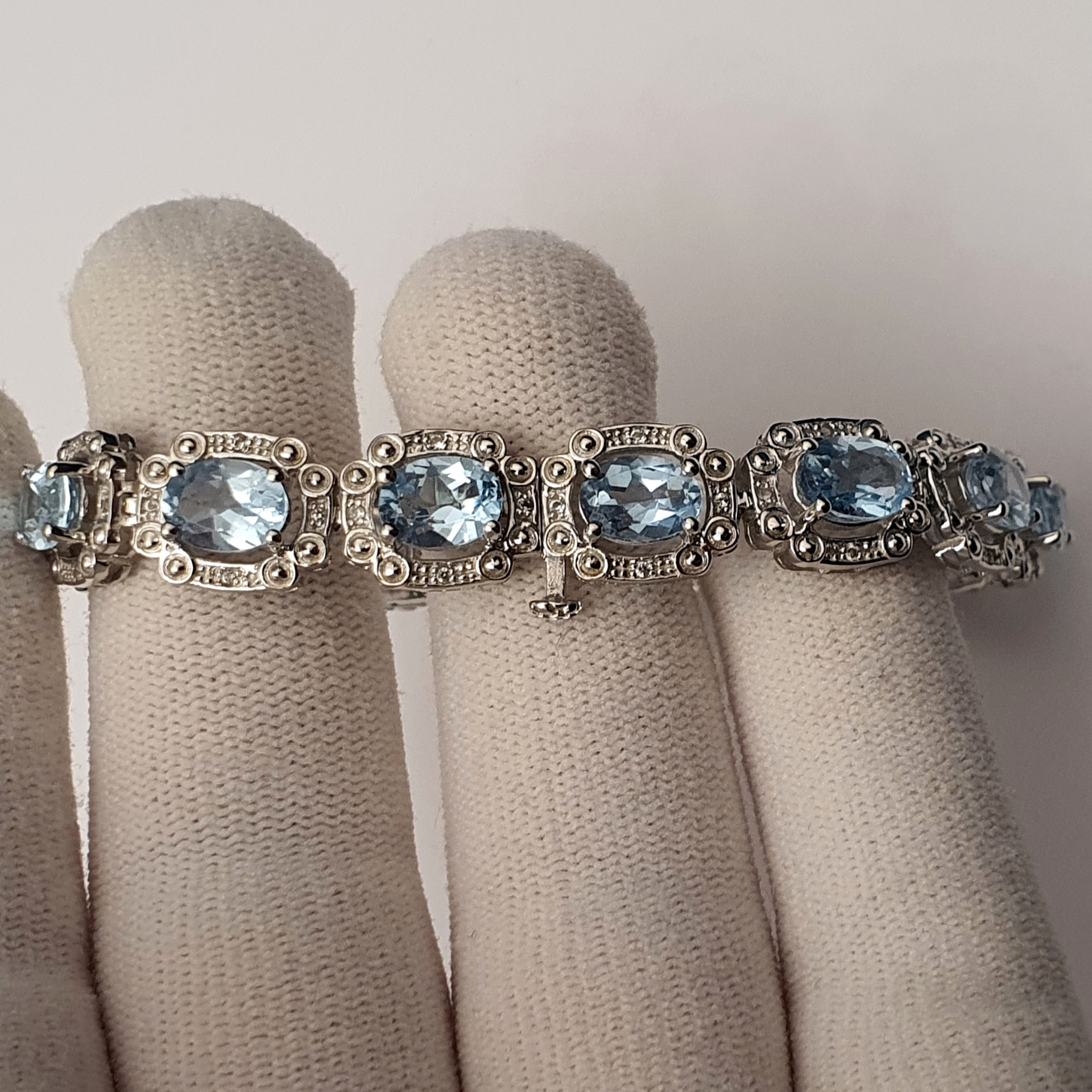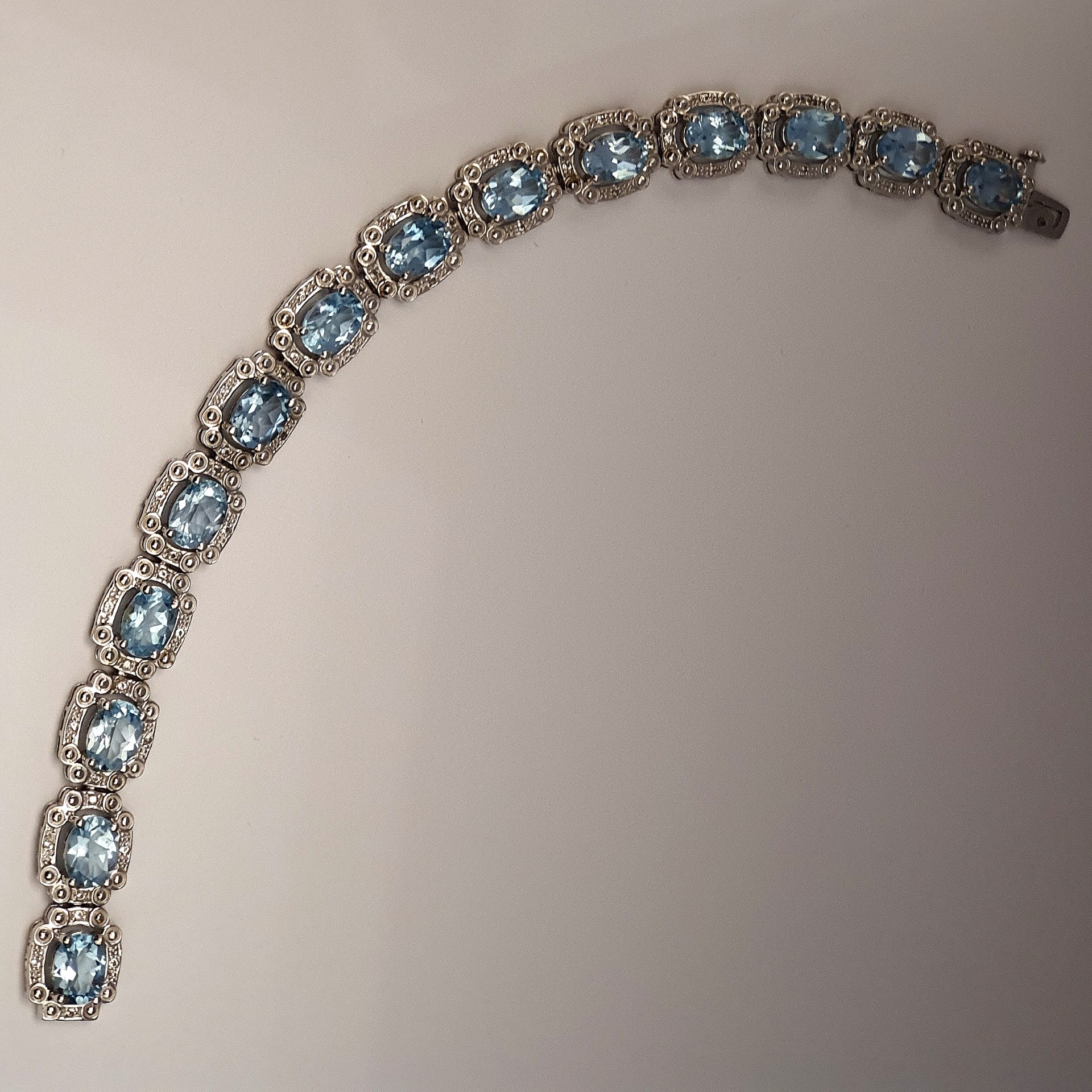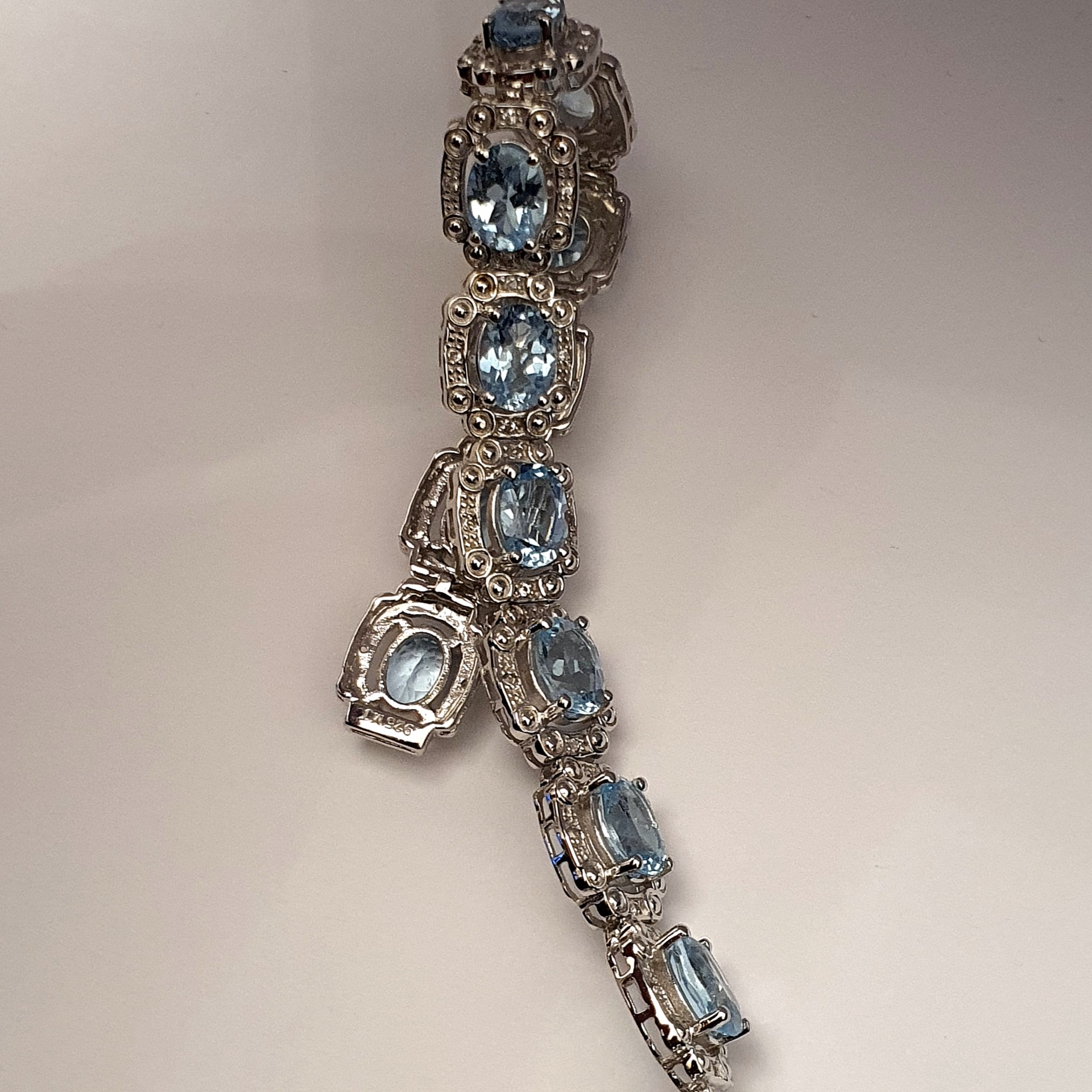 frumoasa bratara realizata din argint 925 rodiat, in greutate de 21.04 grame, ornata cu 14 topaze naturale albastre, cu tratament standard, ovale de 8x6mm, si 56 topaze naturale incolore; fiecare element din cele 14 masoara 13x10.5mm; bratara are 18.25mm lungime si 10.50mm latime: sistemul de inchidere nu are siguranta si se actioneaza astfel: se trage usor de butonul lateral inainte de a inchide bratara si se apasa usor cand se doreste deschiderea bratarii