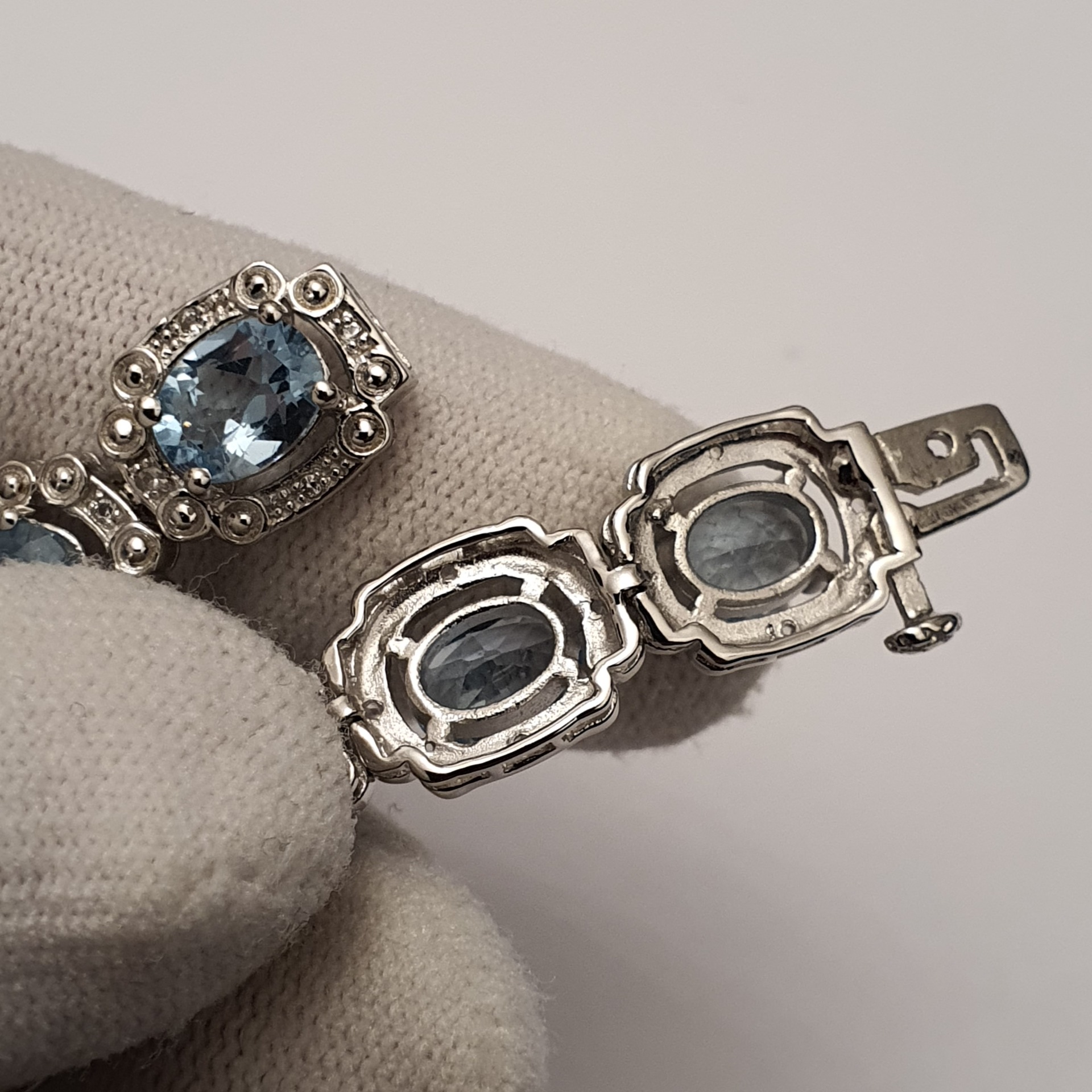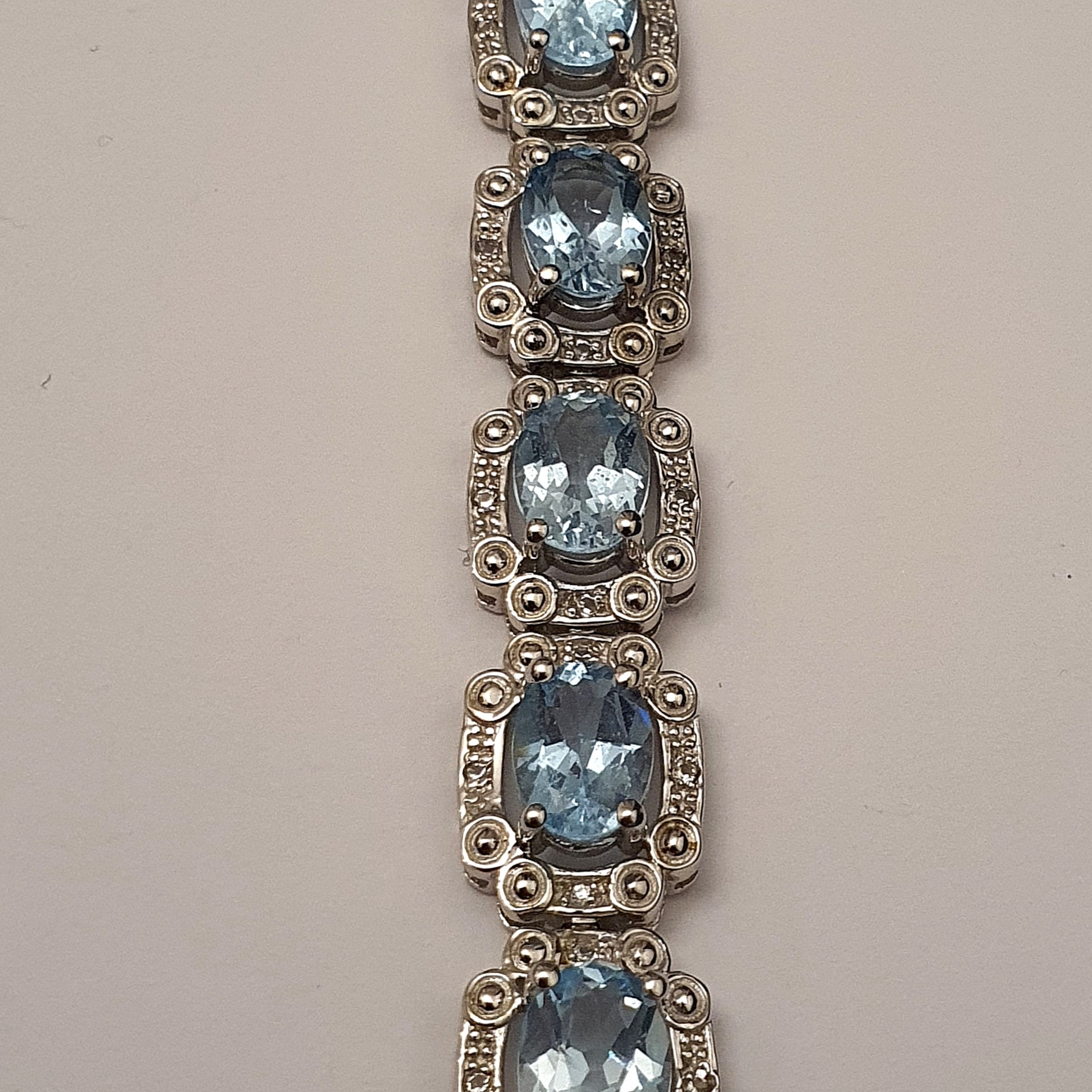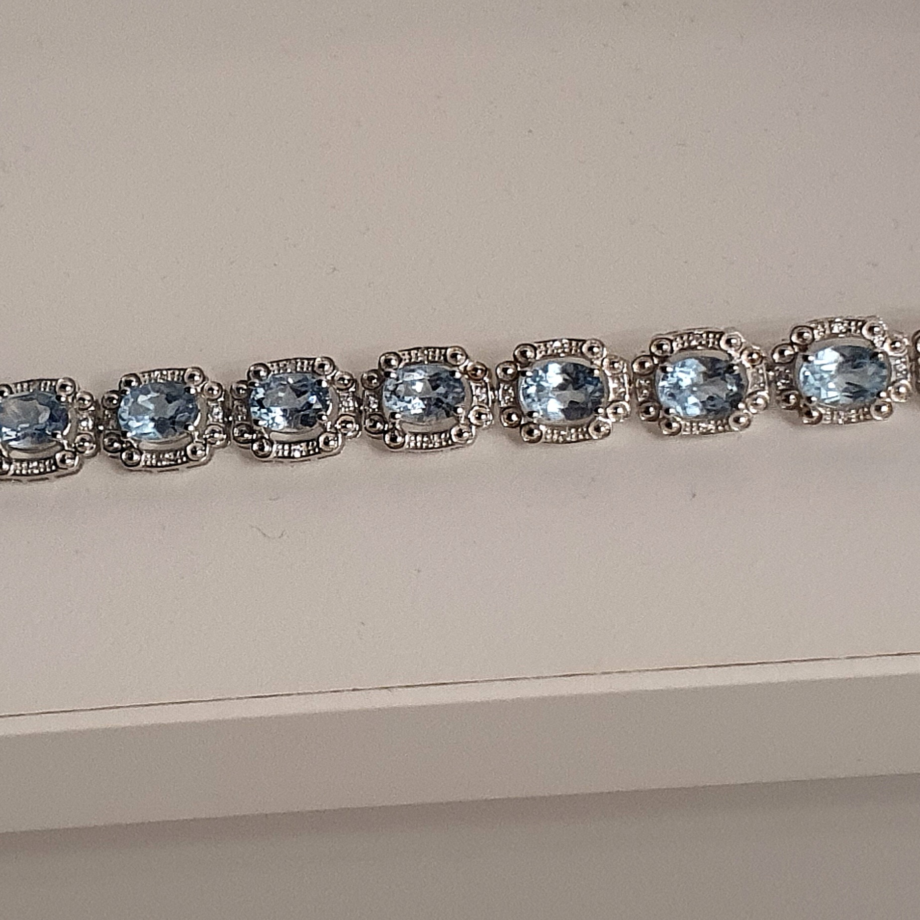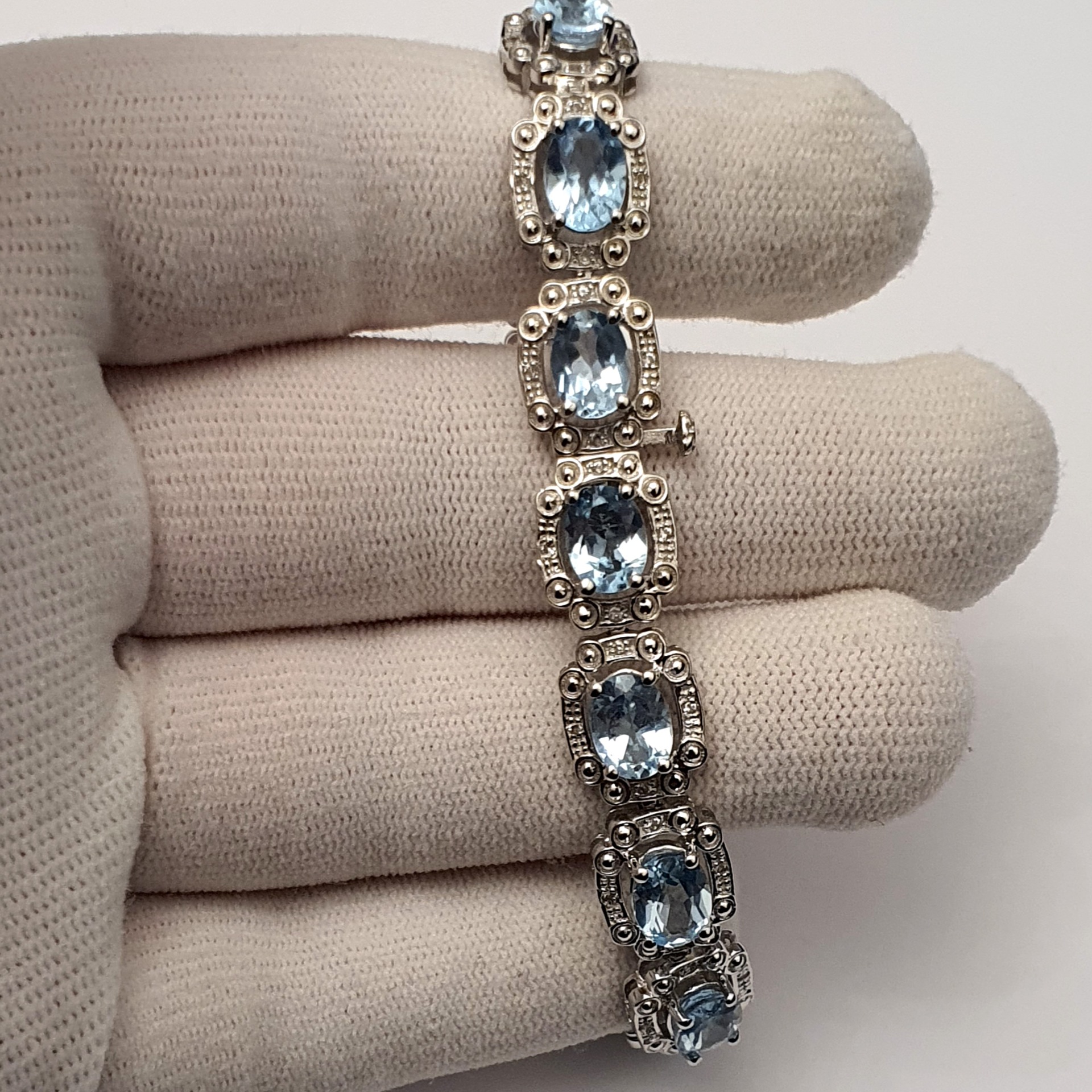 frumoasa bratara realizata din argint 925 rodiat, in greutate de 21.04 grame, ornata cu 14 topaze naturale albastre, cu tratament standard, ovale de 8x6mm, si 56 topaze naturale incolore; fiecare element din cele 14 masoara 13x10.5mm; bratara are 18.25mm lungime si 10.50mm latime: sistemul de inchidere nu are siguranta si se actioneaza astfel: se trage usor de butonul lateral inainte de a inchide bratara si se apasa usor cand se doreste deschiderea bratarii