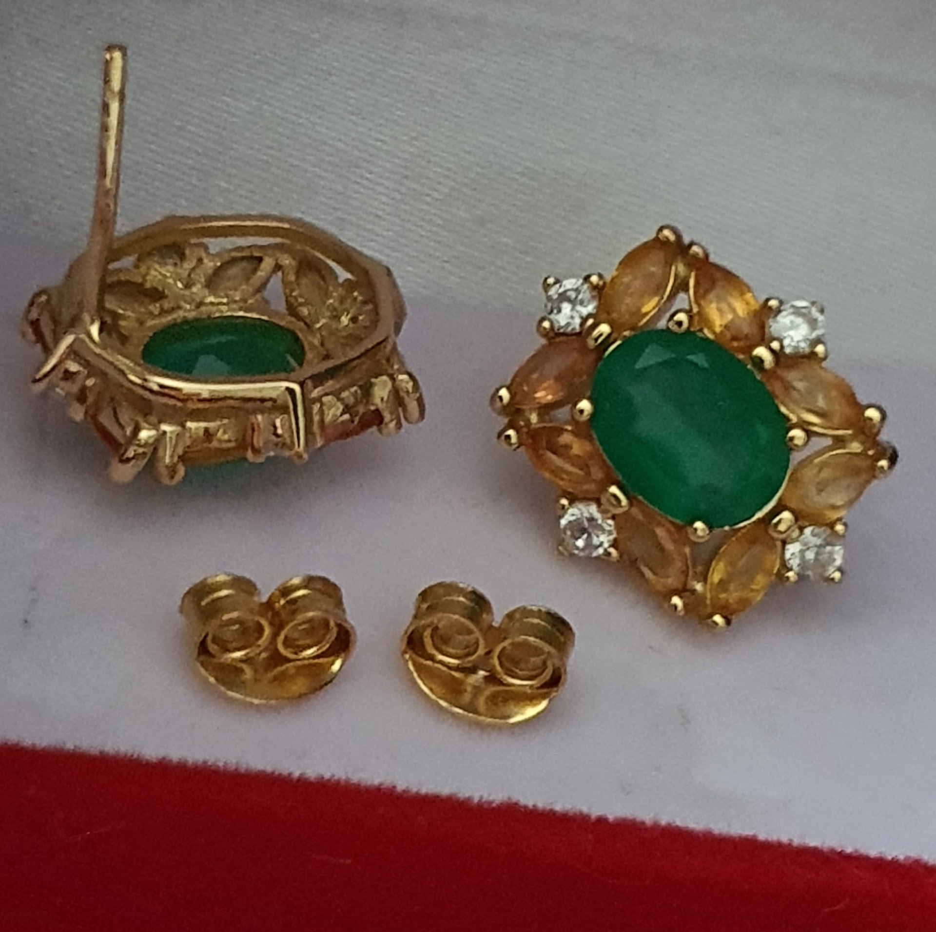 cercei argint 925 vermeil aur galben 14k, 3.45 grame, ornati cu pietre naturale tratate (agate verde-smarald si safire galbene) si cubic zirconia; dimensiuni: 15 x 13mm