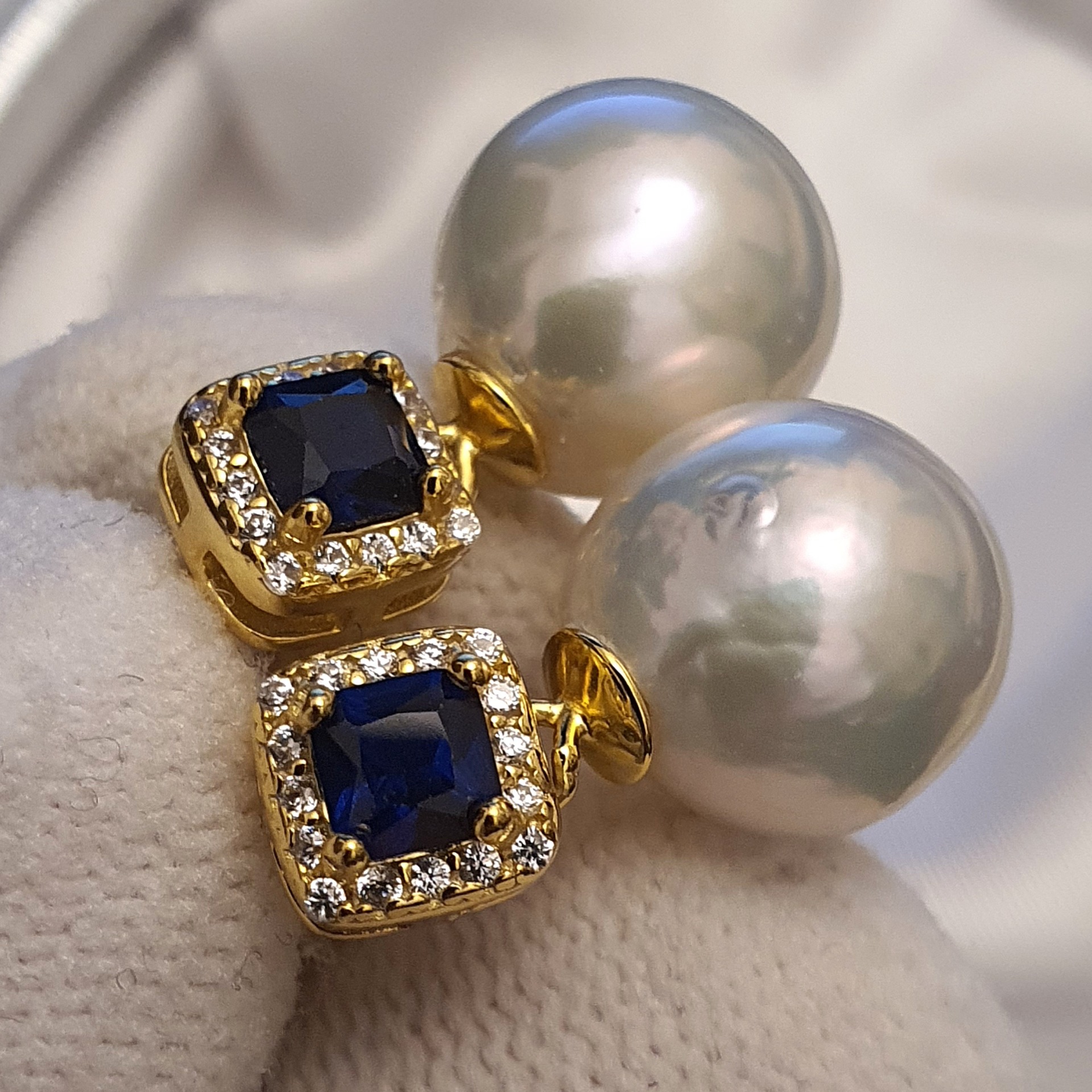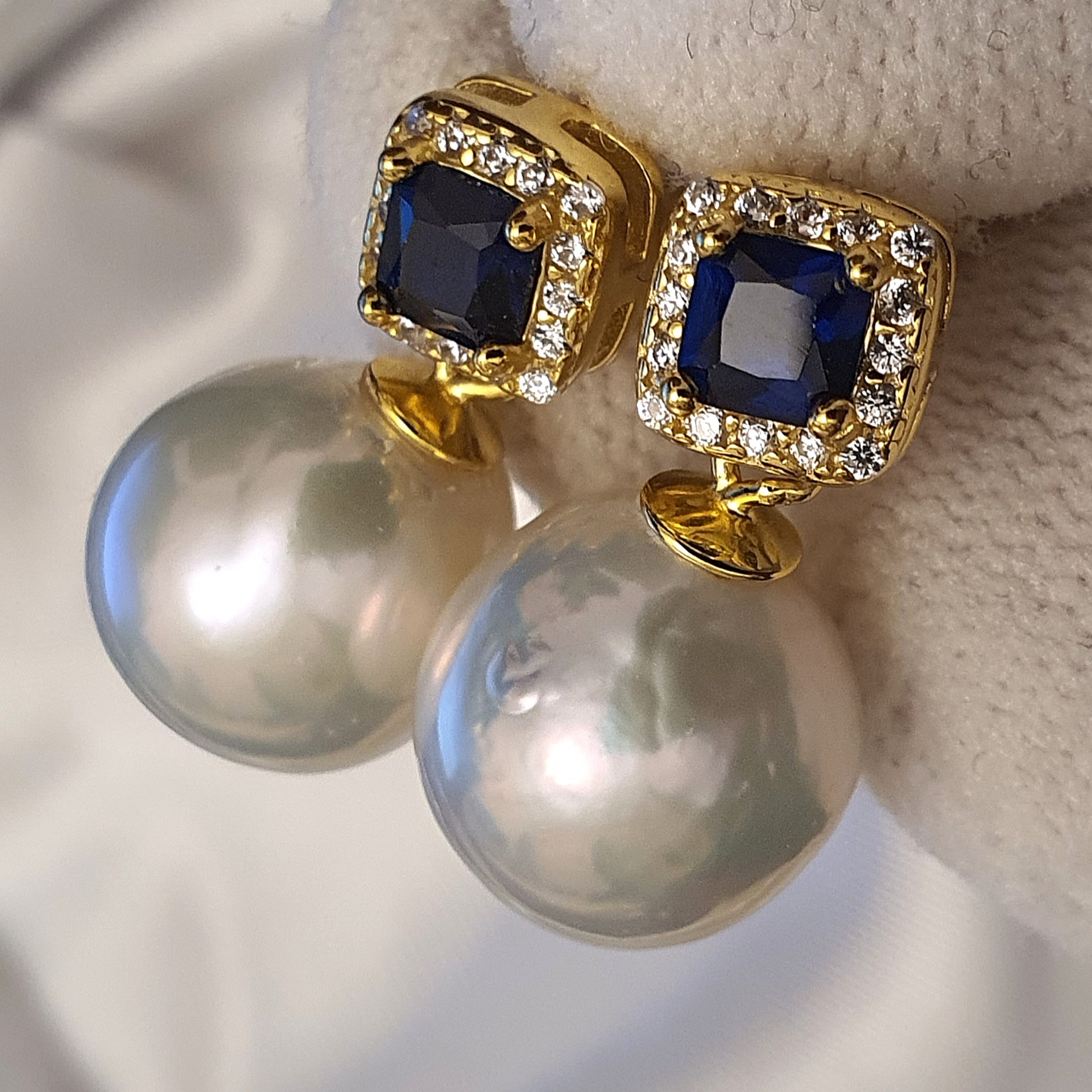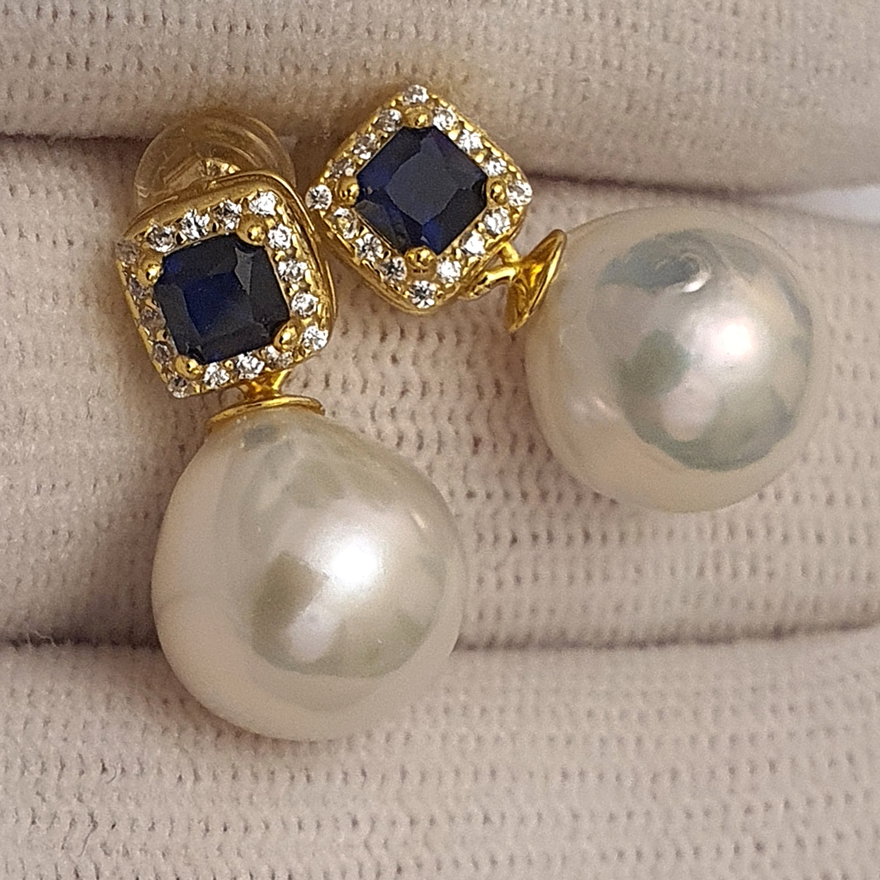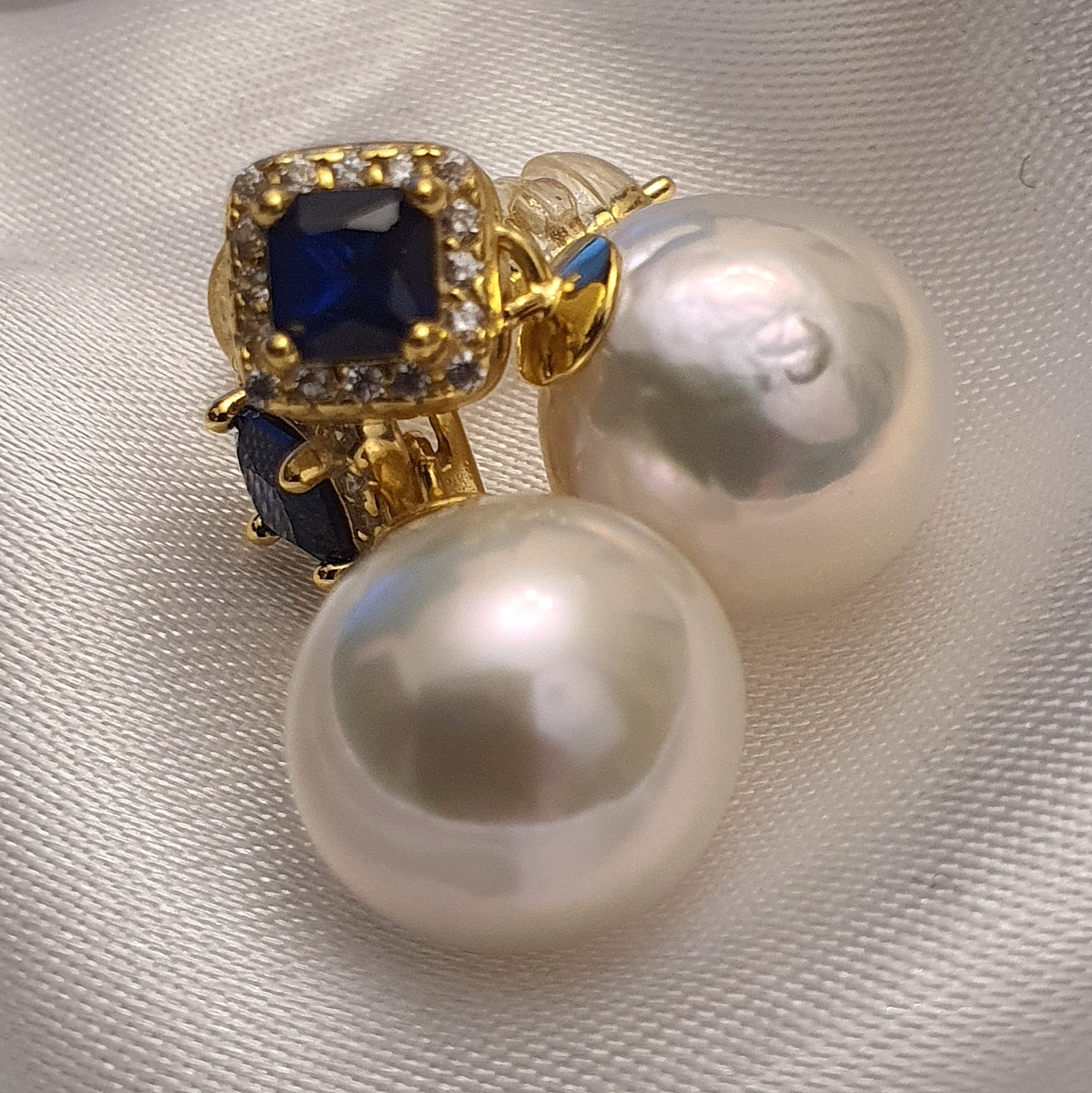 cercei argint 925 vermeil aur galben 18k, in greutate de 4.99 grame, ornati cu cristale incolore si albastre, si cu perle naturale Edison off-round / baroce cu dimensiunile 11x11.7 si 10.65x11mm, albe, cu luciu excelent; dimensiuni aprox.: 19.7 x 11 mm