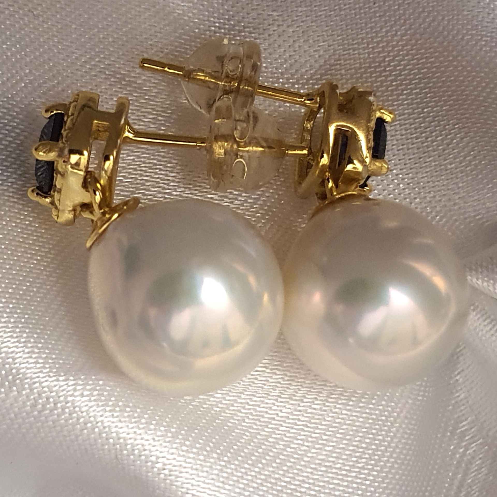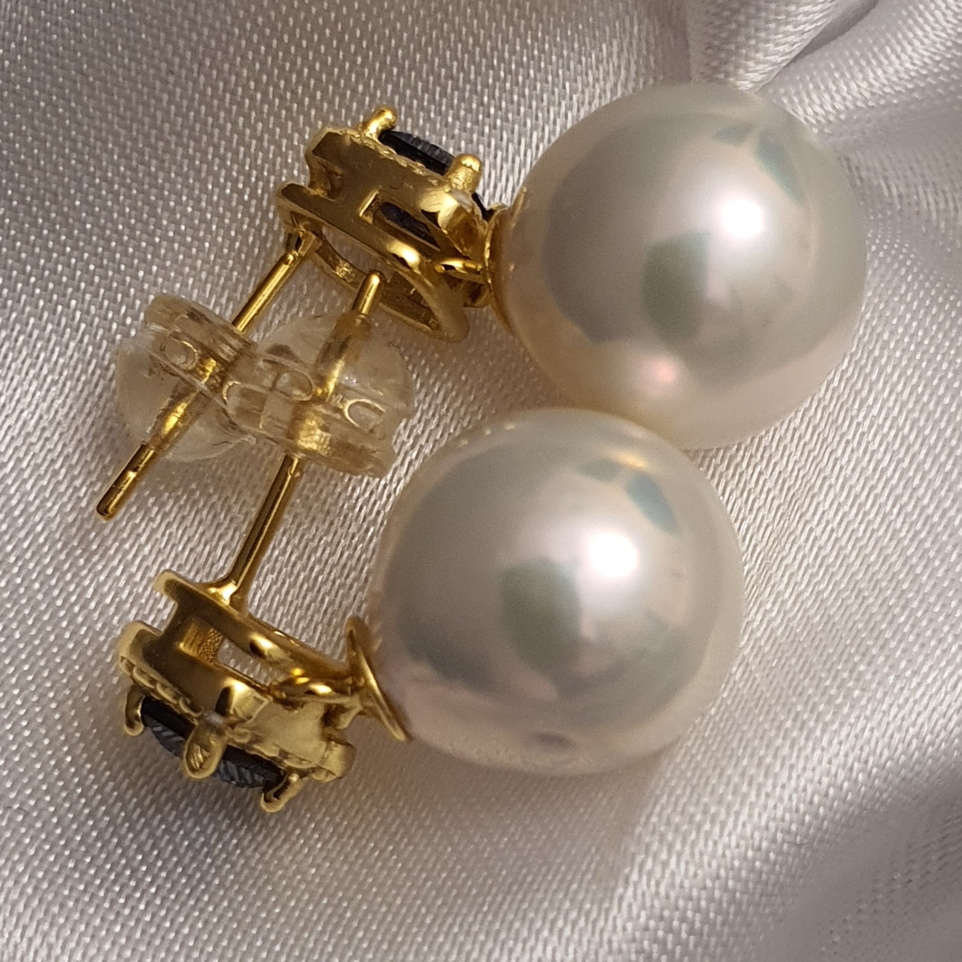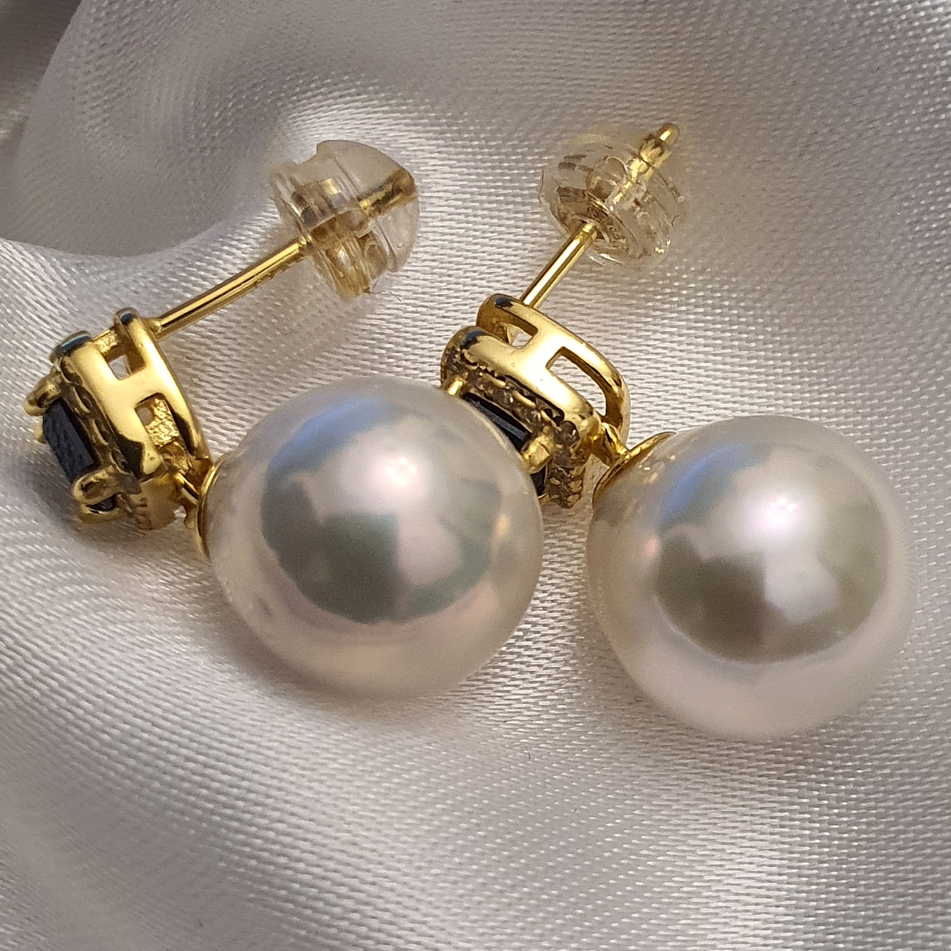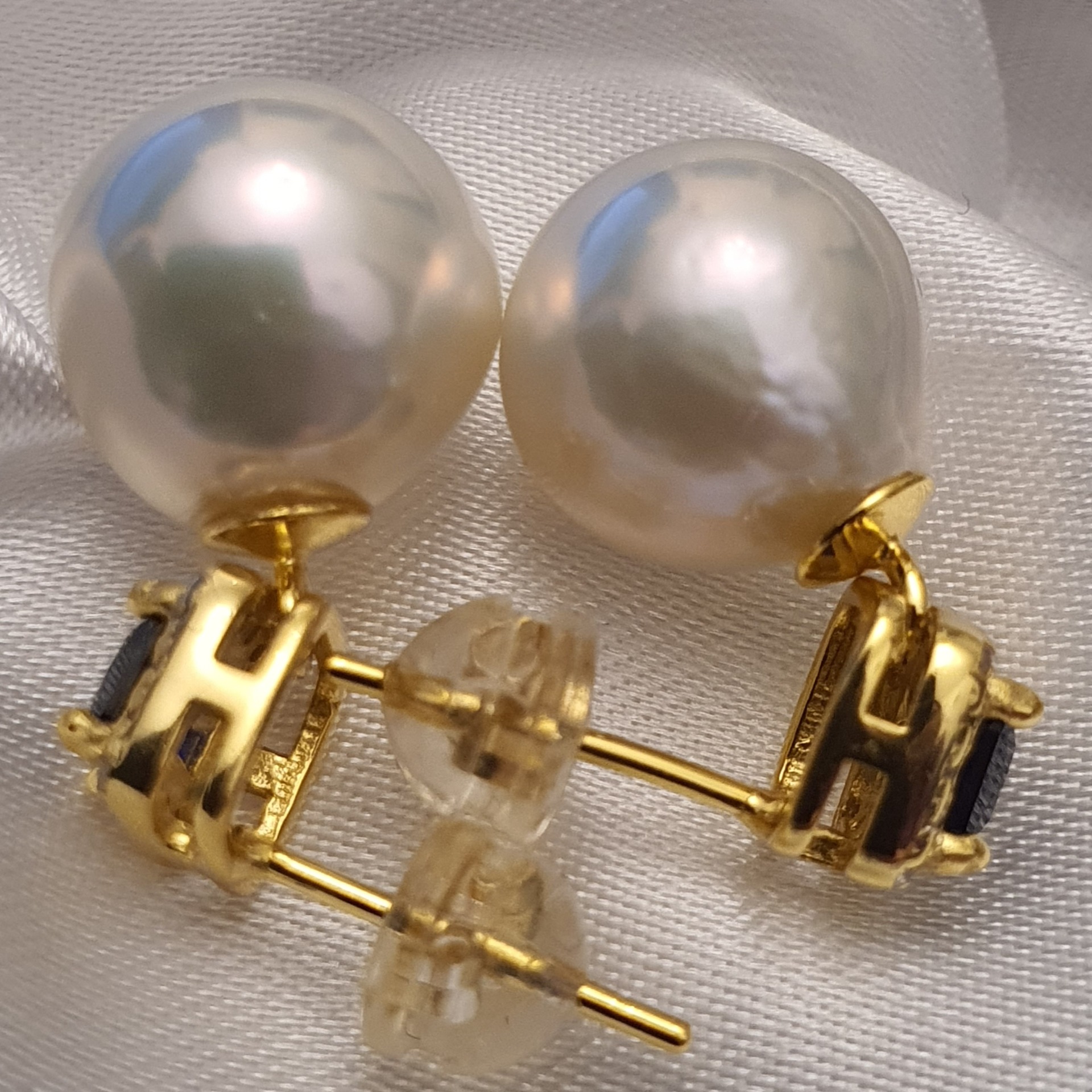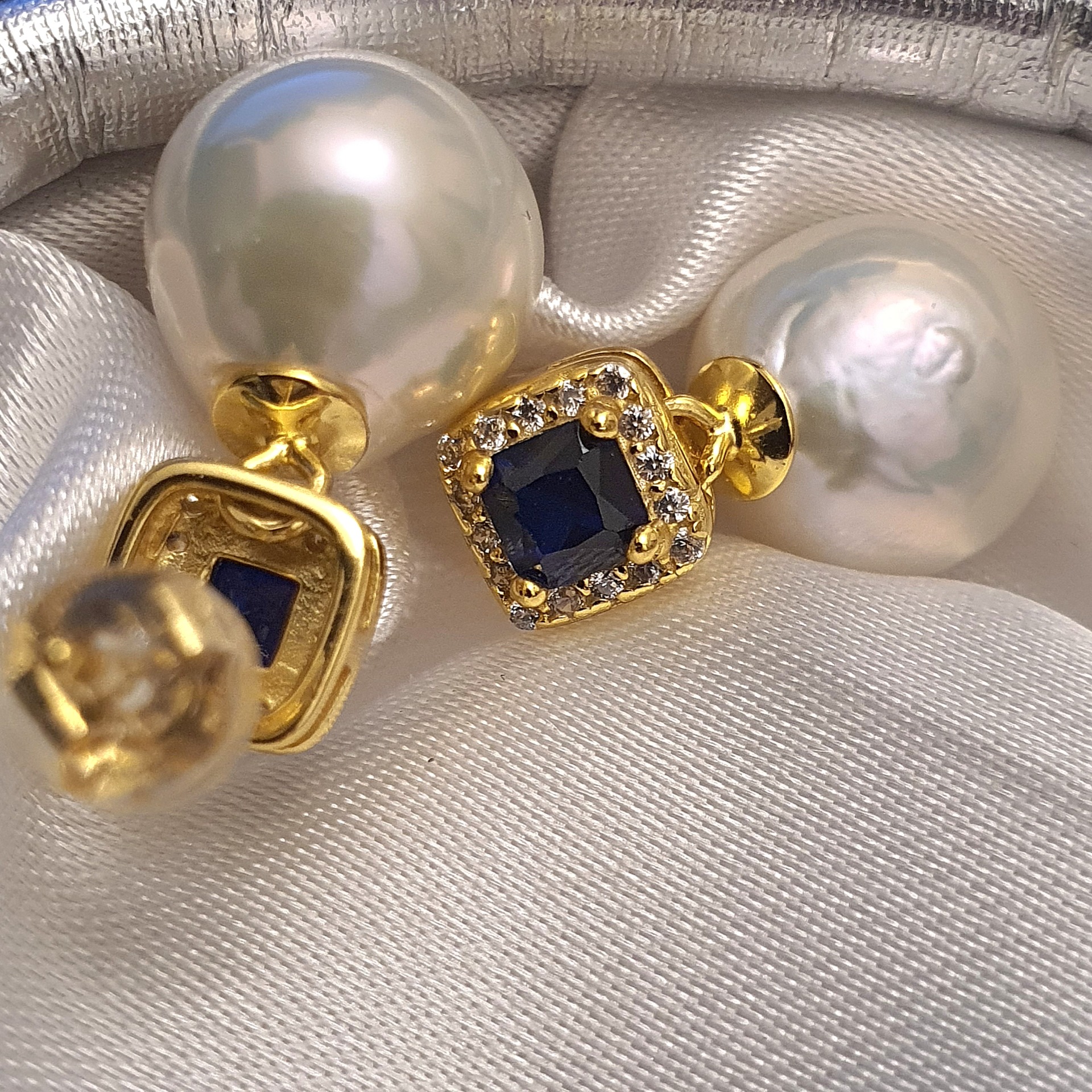 cercei argint 925 vermeil aur galben 18k, in greutate de 4.99 grame, ornati cu cristale incolore si albastre, si cu perle naturale Edison off-round / baroce cu dimensiunile 11x11.7 si 10.65x11mm, albe, cu luciu excelent; dimensiuni aprox.: 19.7 x 11 mm