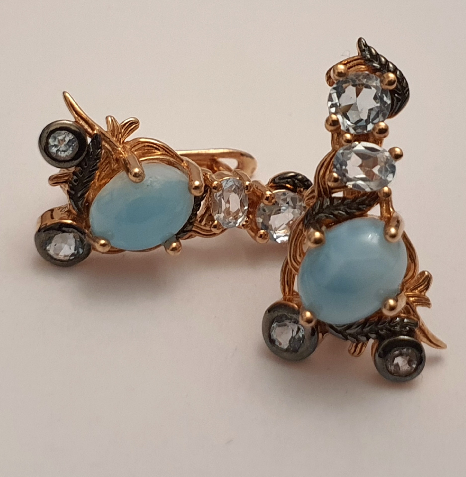cercei argint 925 vermeil aur roz 14k, partial placati cu rodiu negru, 5.89 grame, ornati cu larimar (cabosoane de 8x6mm) si topaze (tratate standard); dimensiuni: 23.06 x 12.94mm