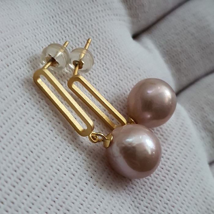 cercei argint 925 vermeil aur galben 18k (metal cu efect sablat, mat), 4.67 grame, ornati cu perle naturale mari, tip edison, lustru excelent, sidef gros, culoare crem-roze-sampanie, semi-rotunde / semi-baroc de 10.87-11mm; dimensiuni: 31 x 11mm