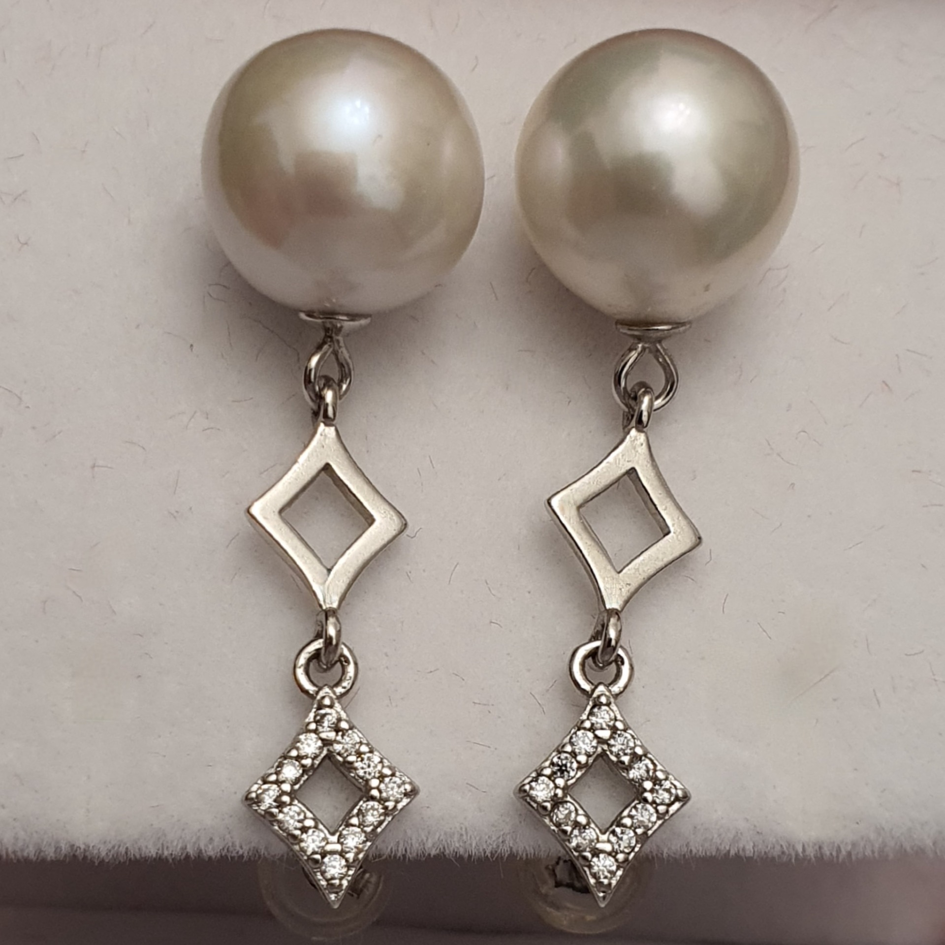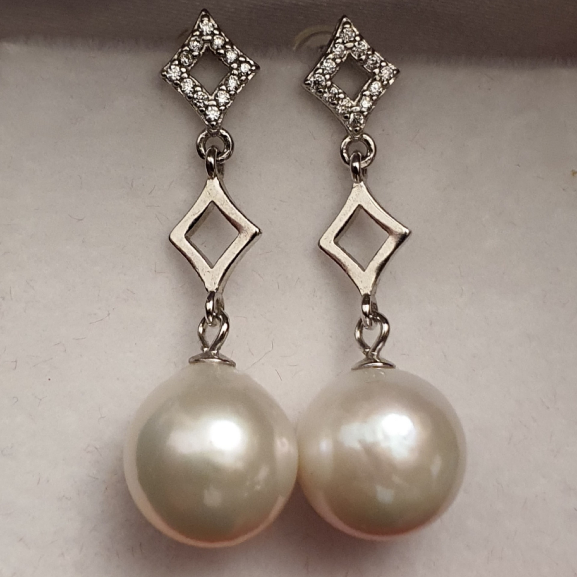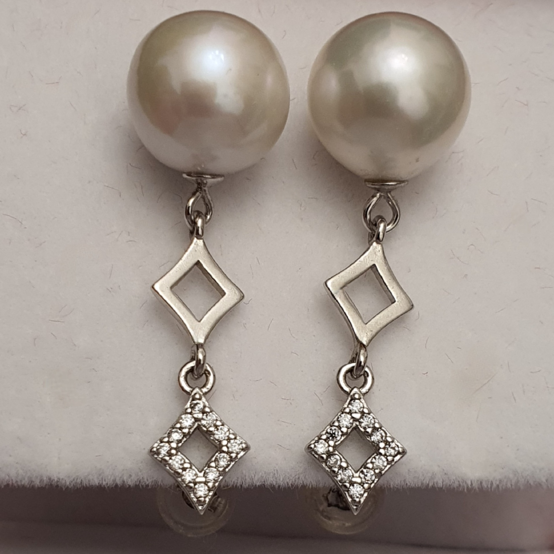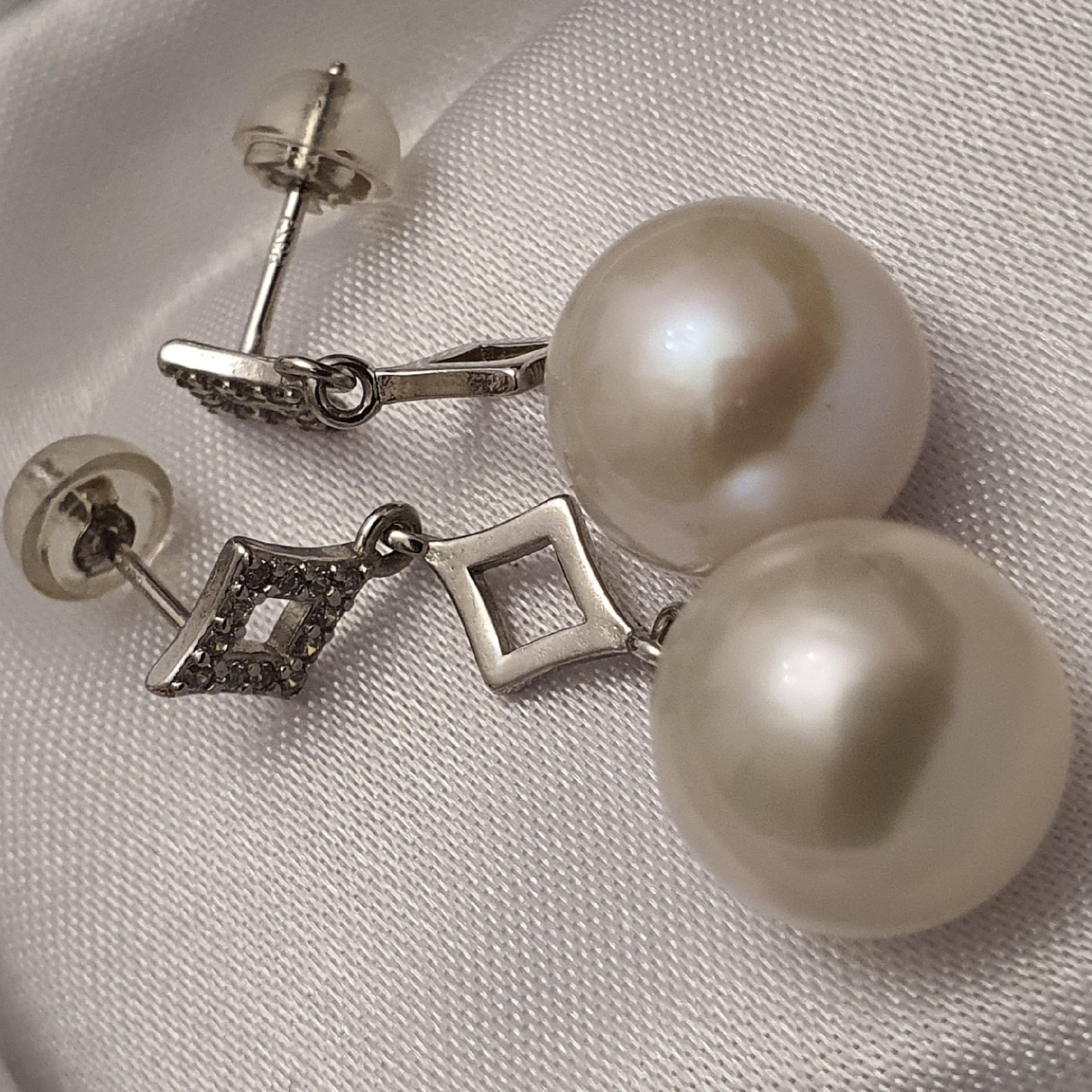 cercei argint 925 vermeil aur alb 18k, 4.72 grame, cu dimensiunile 34 x 11mm, prindere stift cu fluturas silicon, ornati cu cristale incolore si frumoase perle naturale albe edison, rotunde de aprox. 11mm
