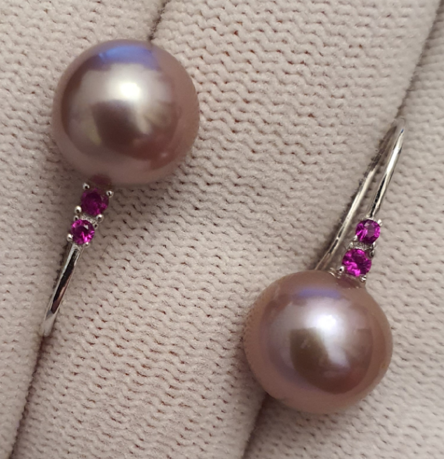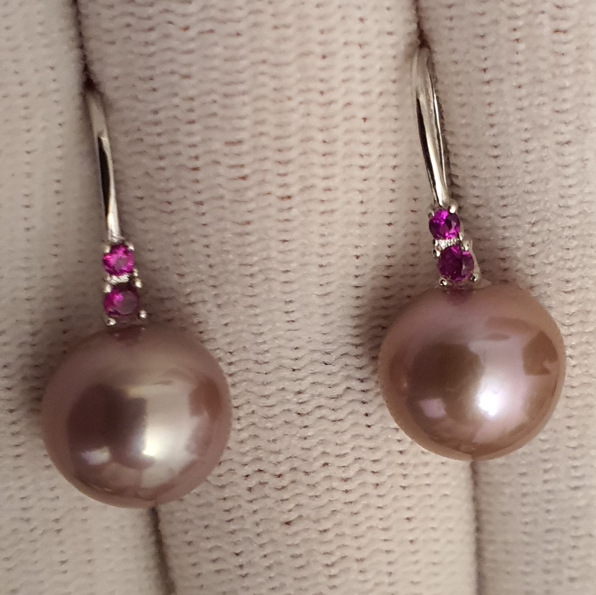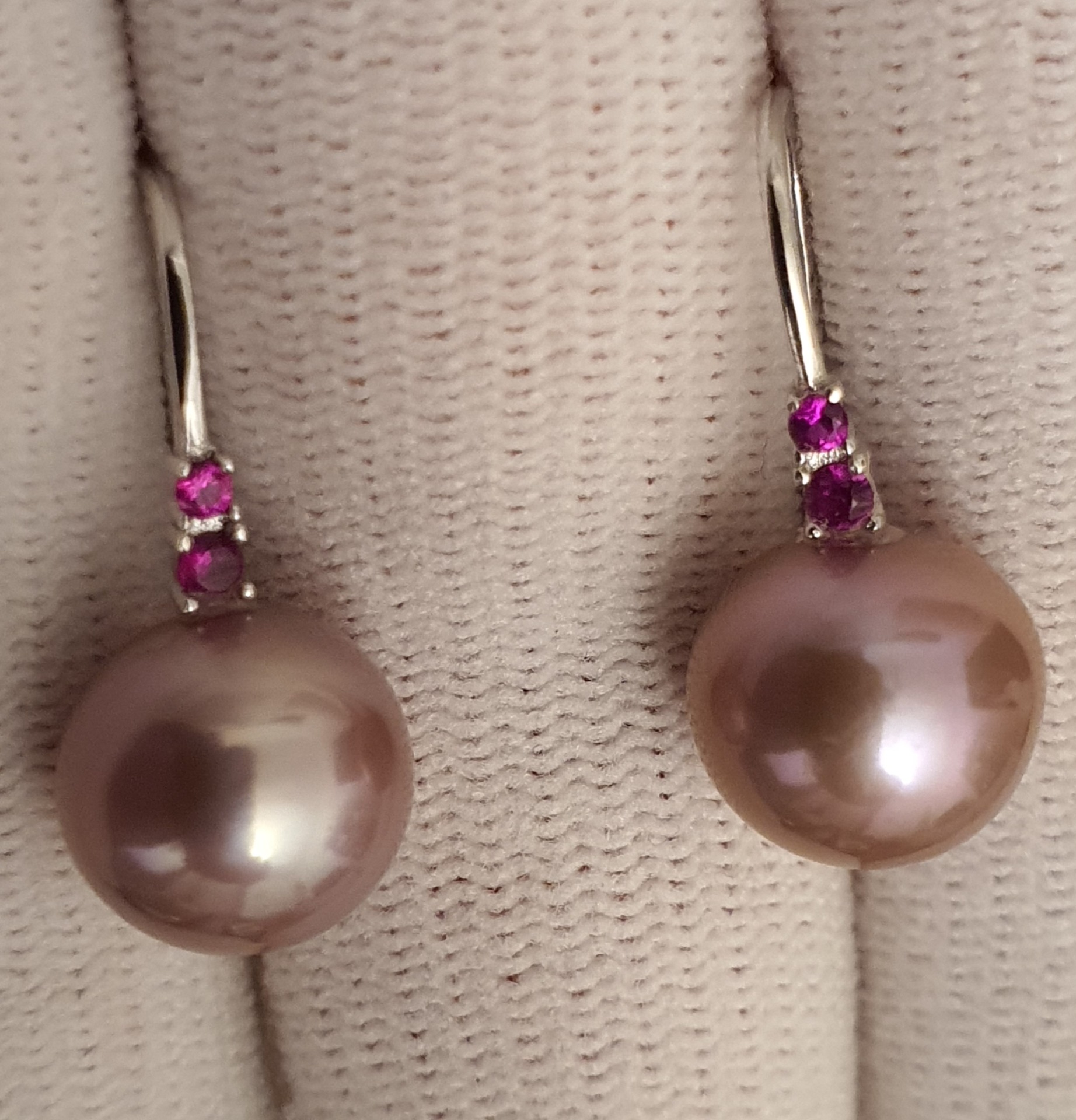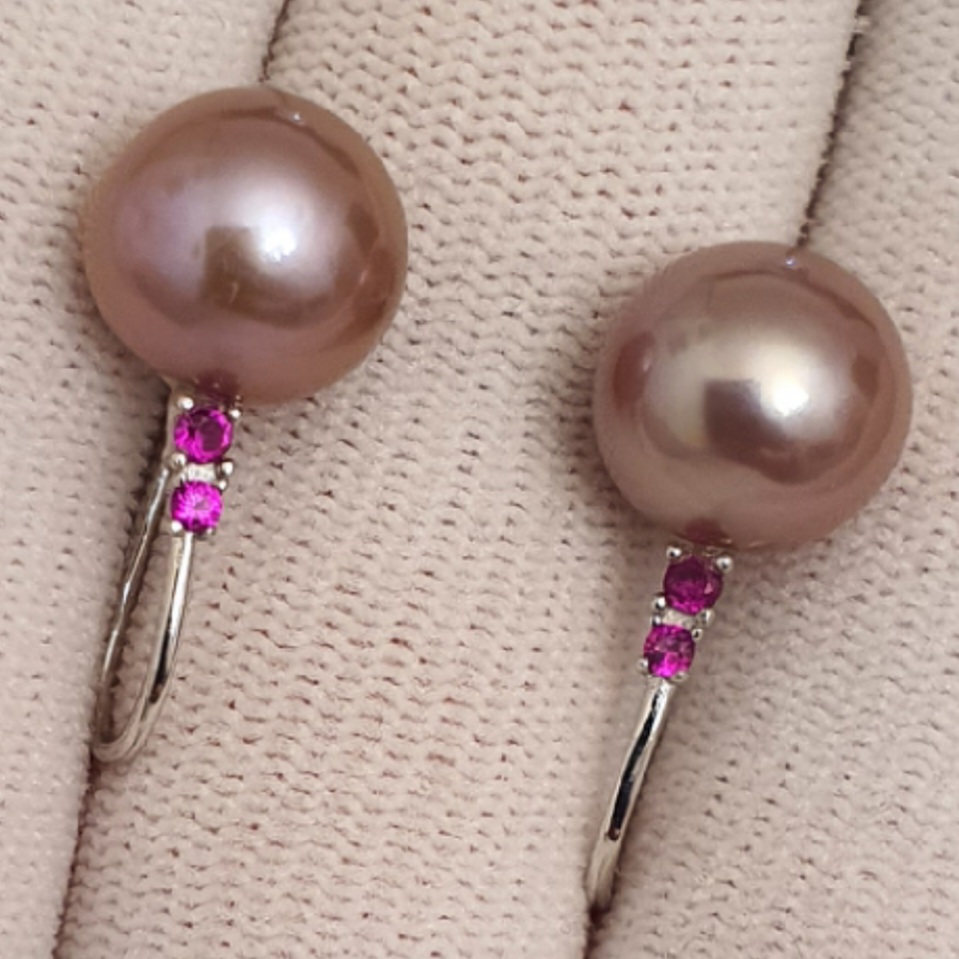 cercei argint 925 vermeil aur alb 18k, in greutate de 3.57 grame, ornati cu cristale roz-rosii si perle naturale edison de calitate superioara, rotunde de aprox. 10.3-10.5mm, cu luciu tip oglinda, de culoare roz-lavanda; dimensiuni cercei: 22.75x10.30mm