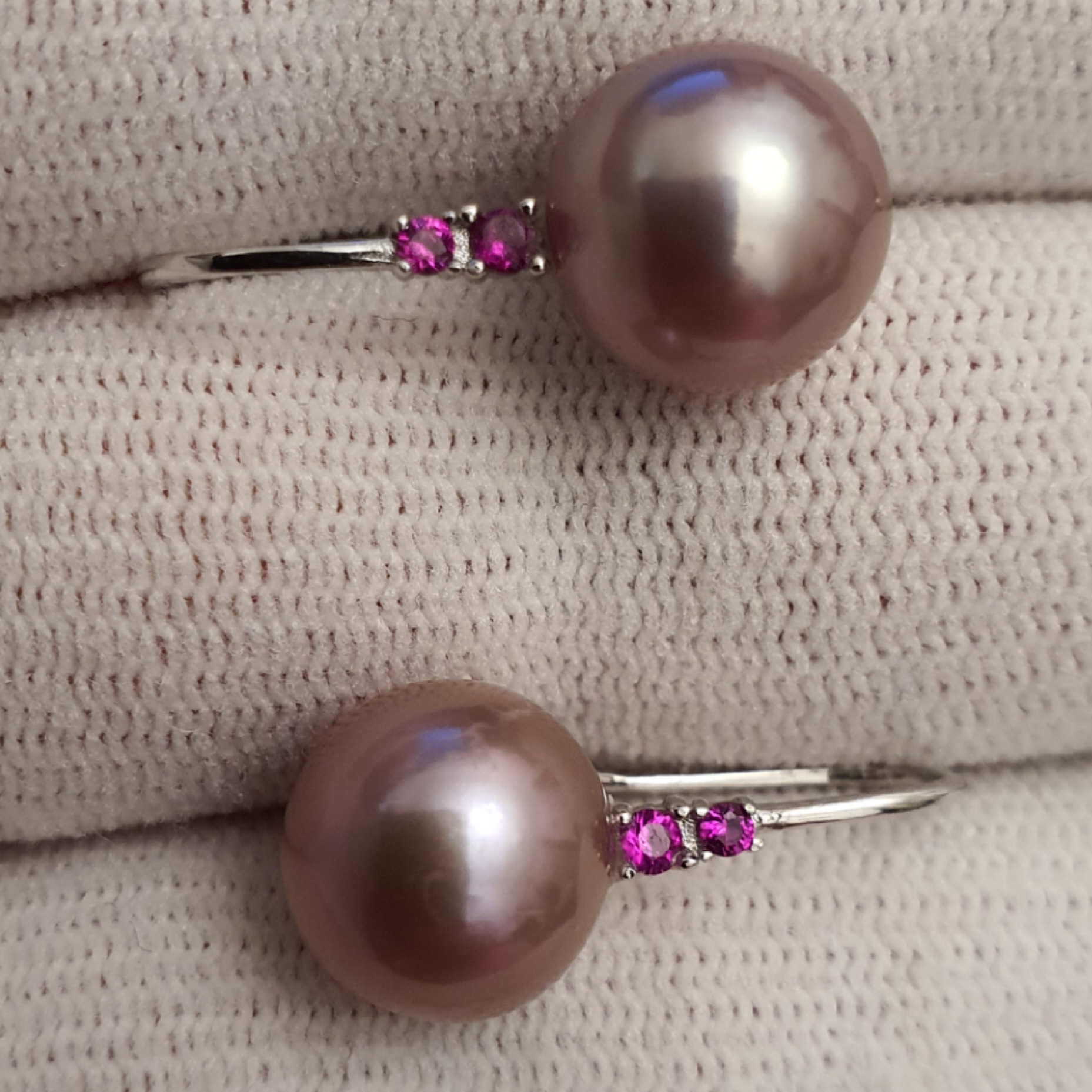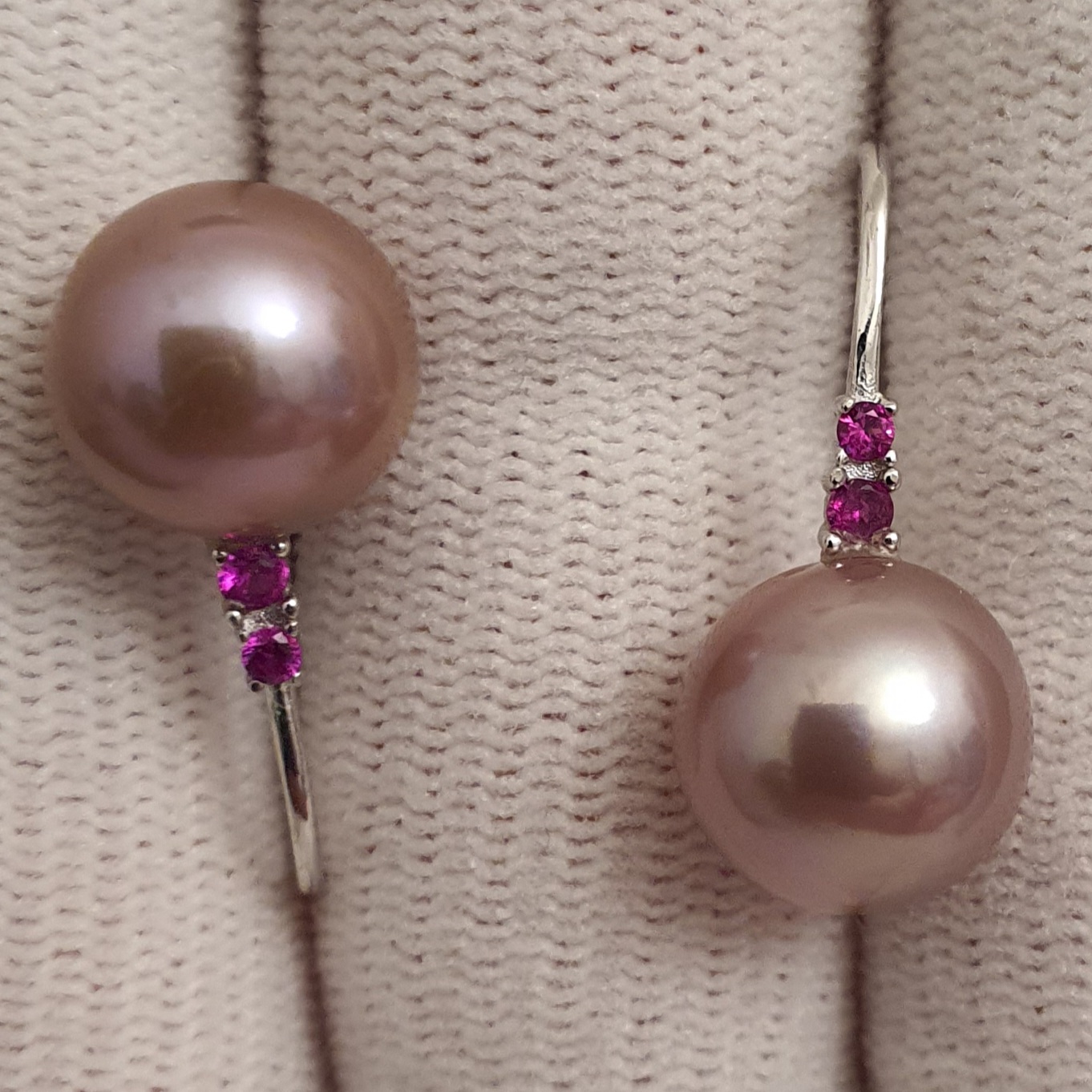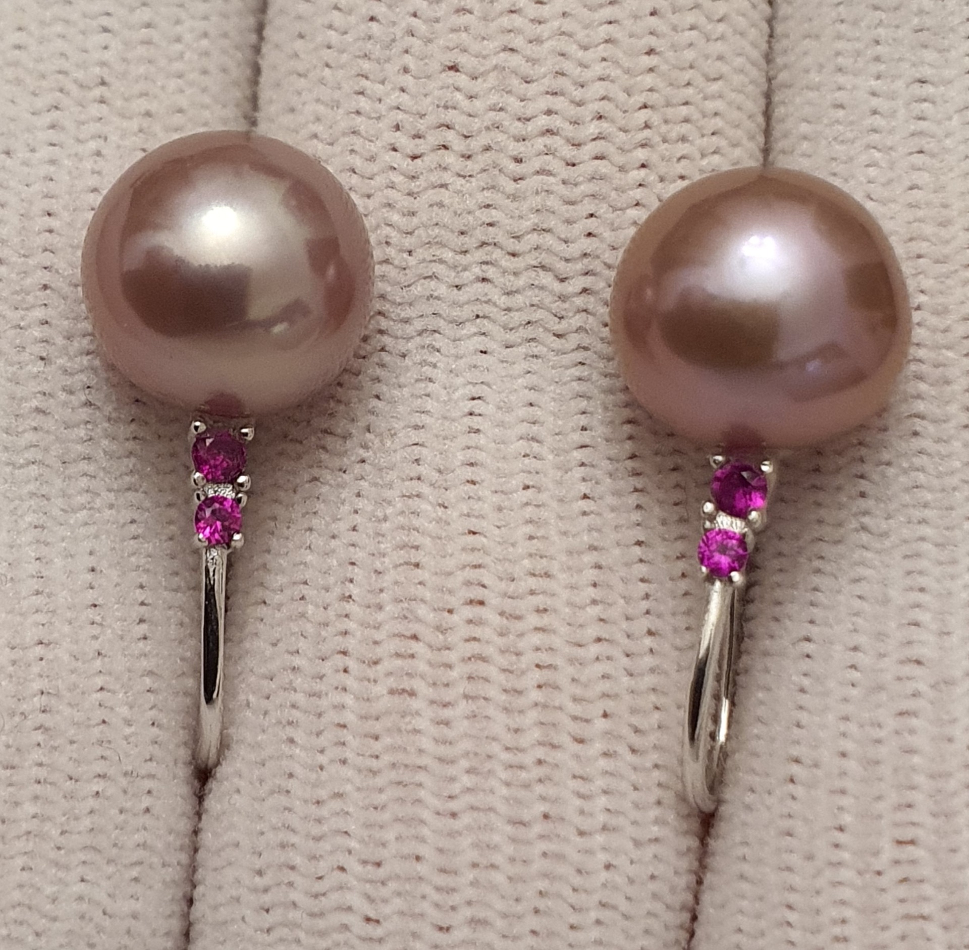 cercei argint 925 vermeil aur alb 18k, in greutate de 3.57 grame, ornati cu cristale roz-rosii si perle naturale edison de calitate superioara, rotunde de aprox. 10.3-10.5mm, cu luciu tip oglinda, de culoare roz-lavanda; dimensiuni cercei: 22.75x10.30mm