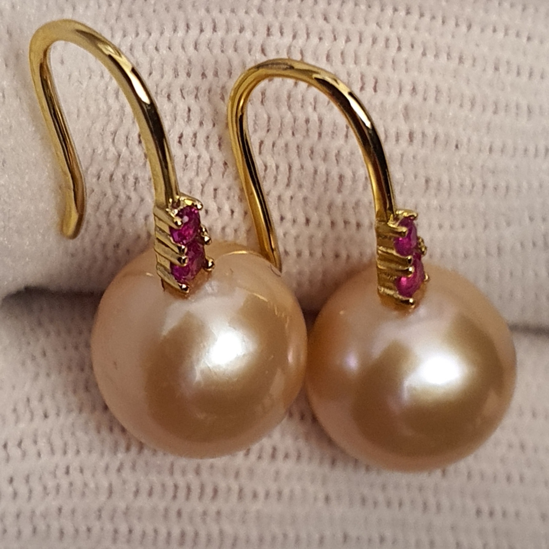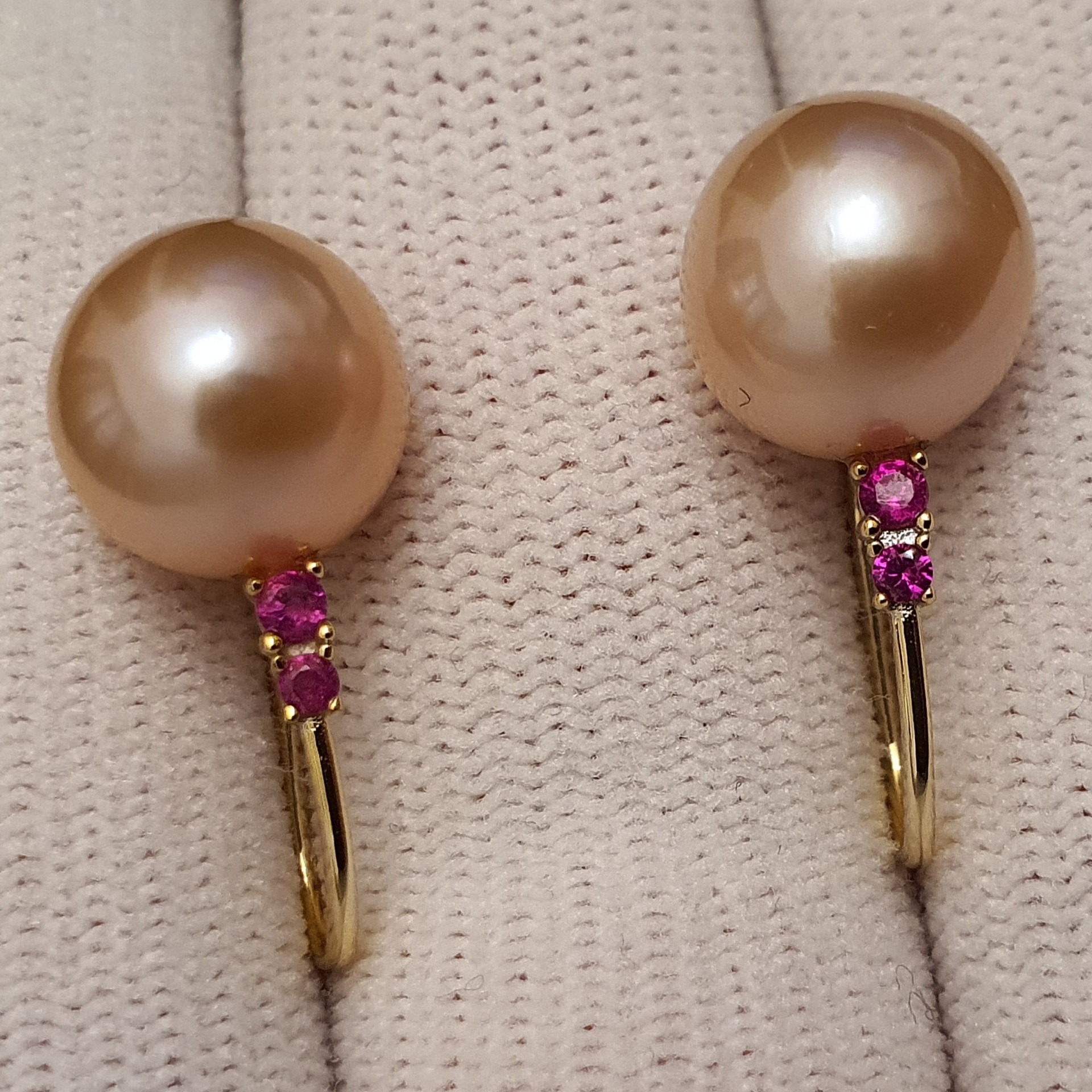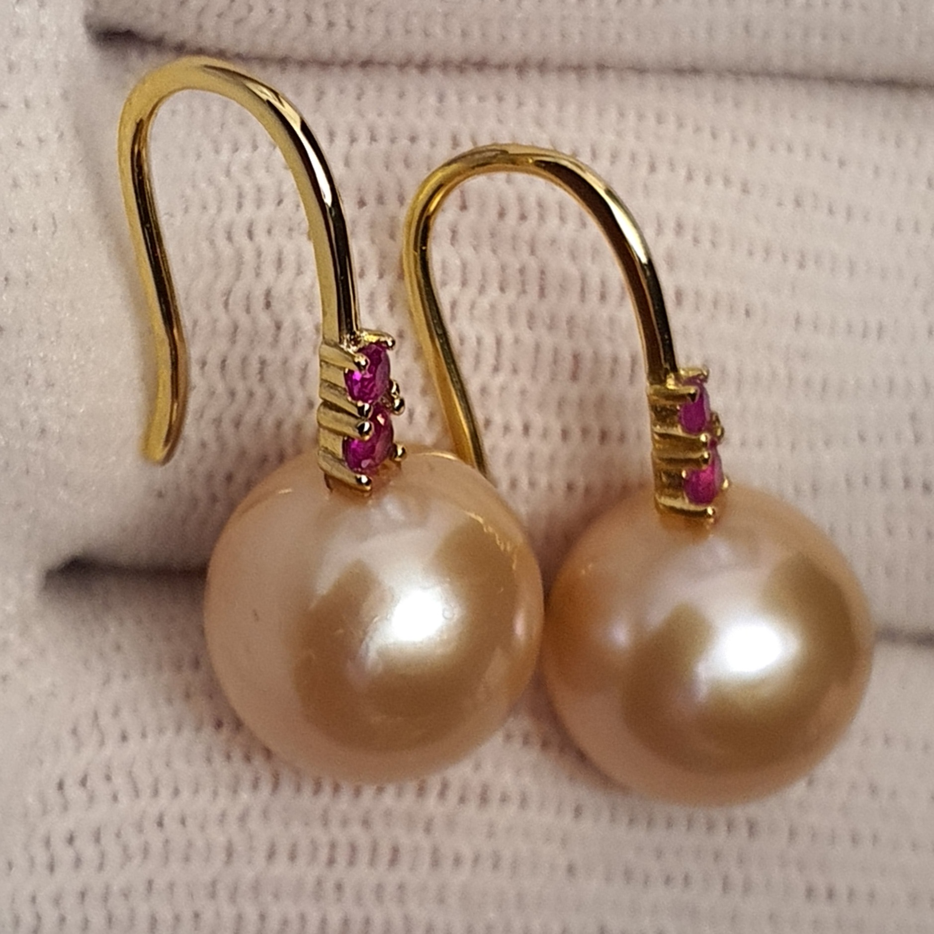 cercei argint 925 vermeil aur galben 18k, in greutate de 3.88 grame, ornati cu cristale roz-rosii si perle naturale edison de calitate superioara, rotunde de aprox. 10.5mm, cu luciu excelent, de culoarea piersicii roz-oranj; dimensiuni cercei: 23x10.5mm