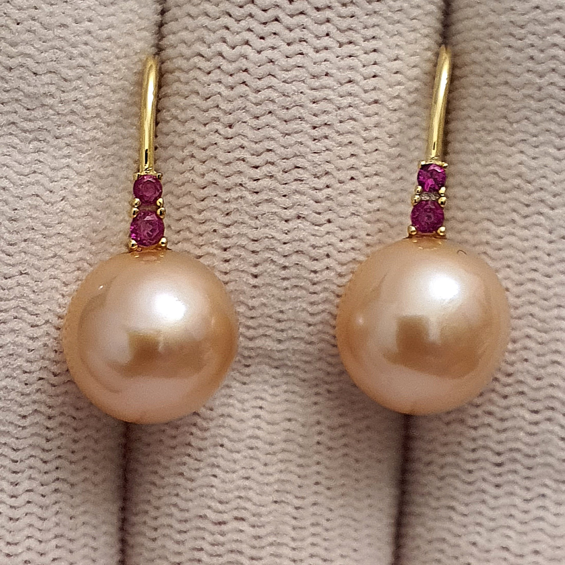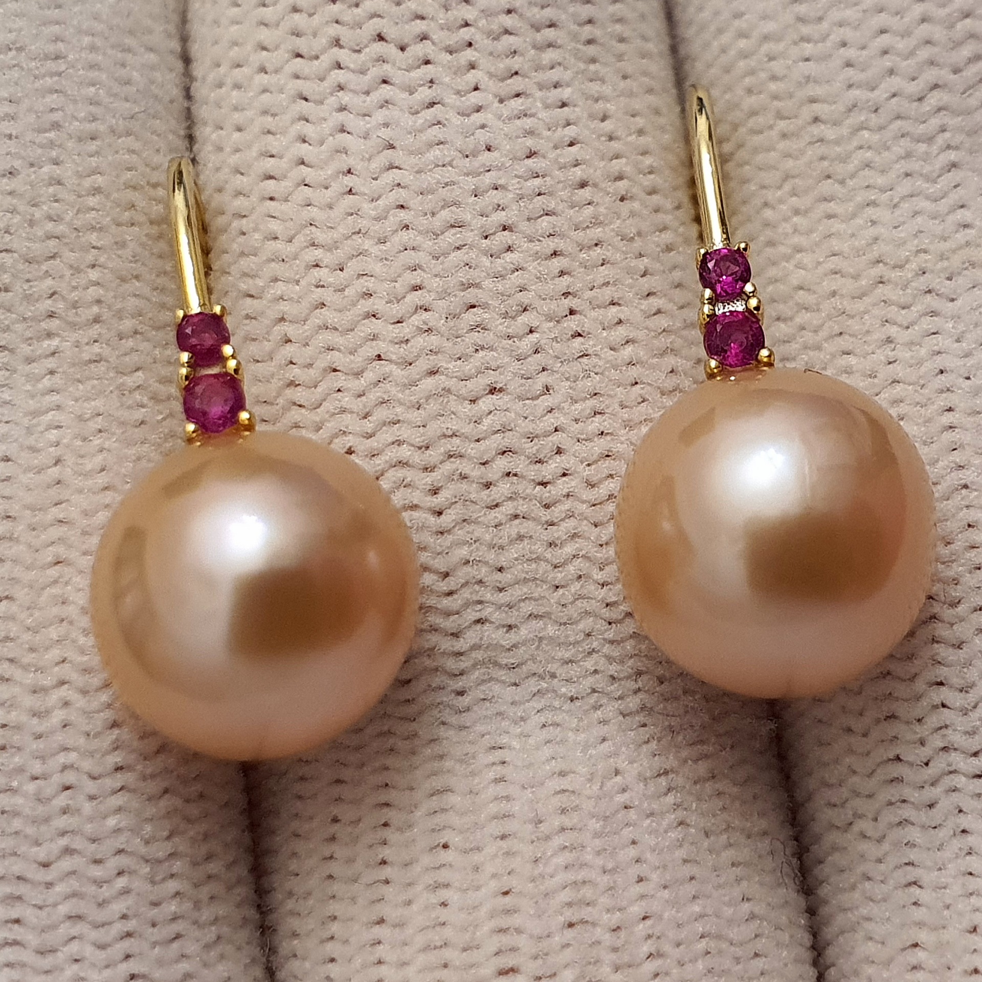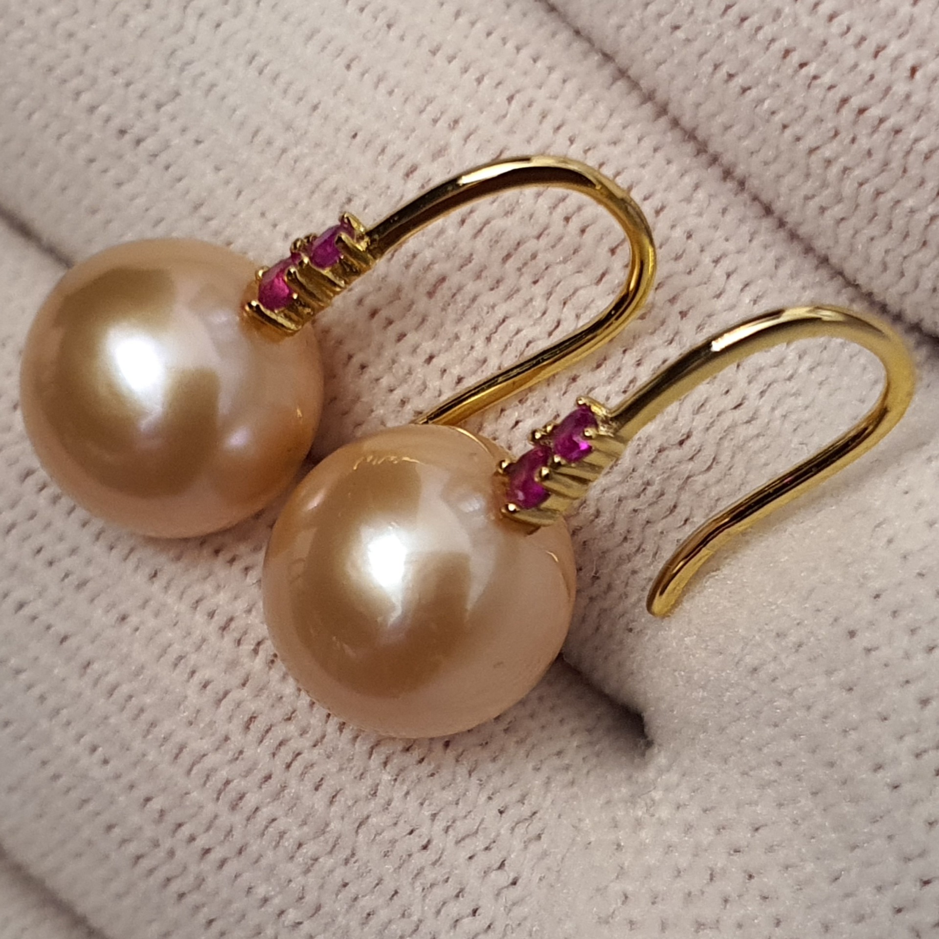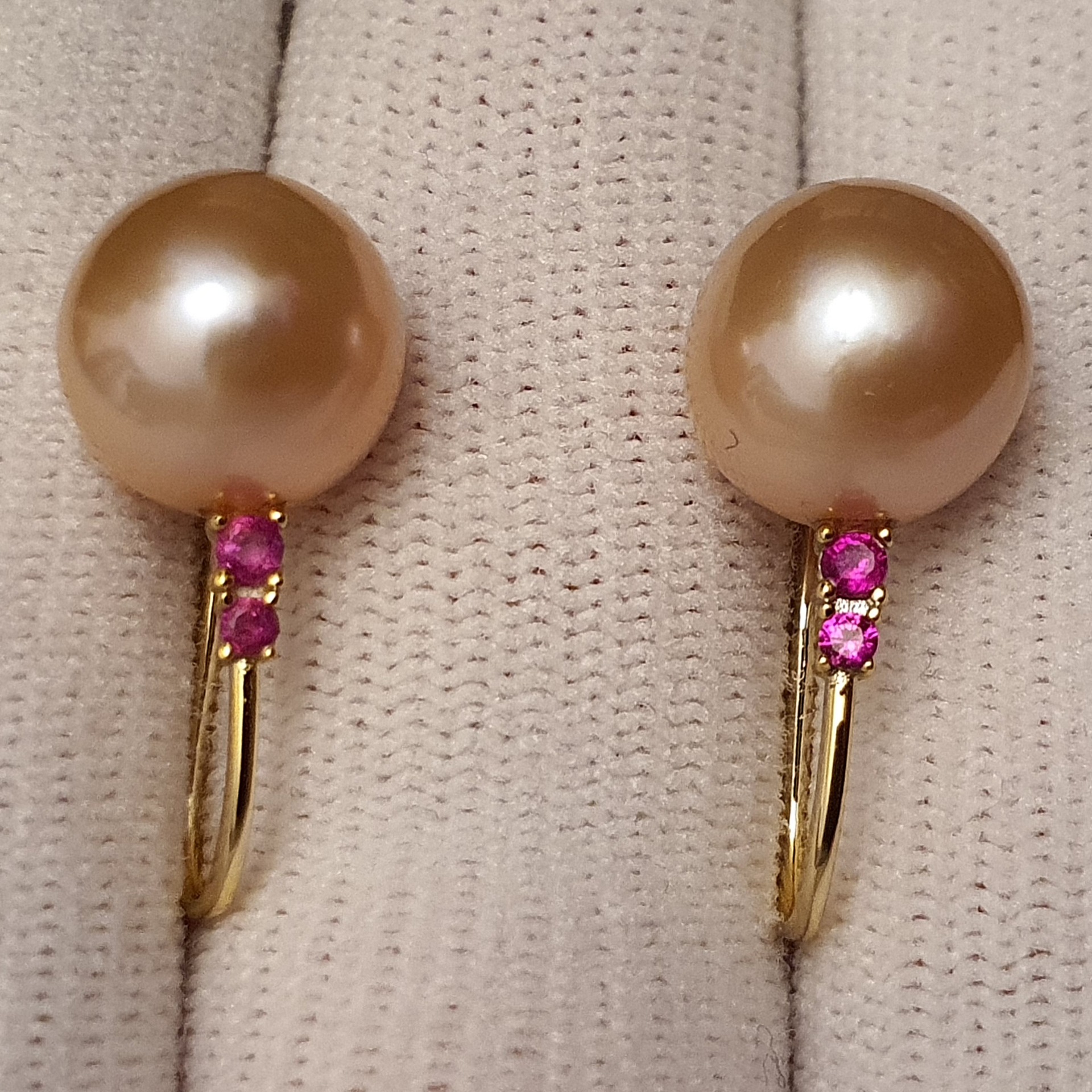 cercei argint 925 vermeil aur galben 18k, in greutate de 3.88 grame, ornati cu cristale roz-rosii si perle naturale edison de calitate superioara, rotunde de aprox. 10.5mm, cu luciu excelent, de culoarea piersicii roz-oranj; dimensiuni cercei: 23x10.5mm