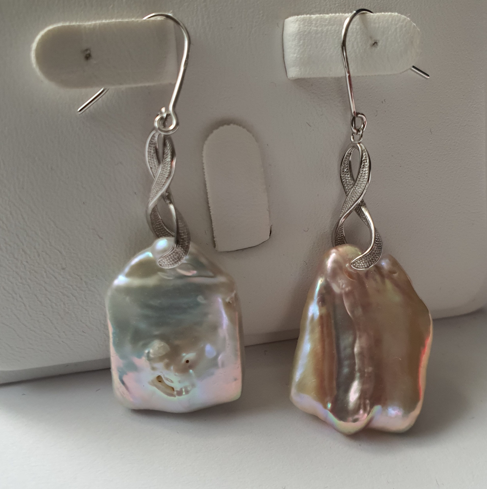 cercei argint 925 vermeil aur alb 18k, 8.81gr, cu perle de cultura uriase, cu aspect raw, cu imperfectiuni naturale; perlele masoara aprox. 21x18mm, iar cerceii sunt de aprox. 50x18mm