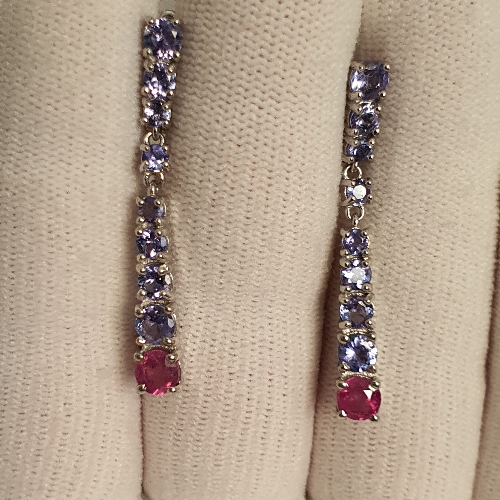 cercei argint 925 vermeil aur alb 14k, 5.96 grame, cu dimensiunile 38 x 5 mm, ornati cu tanzanite si rubine, pietre naturale cu tratament standard; cerceii se vad foarte frumos pe ureche