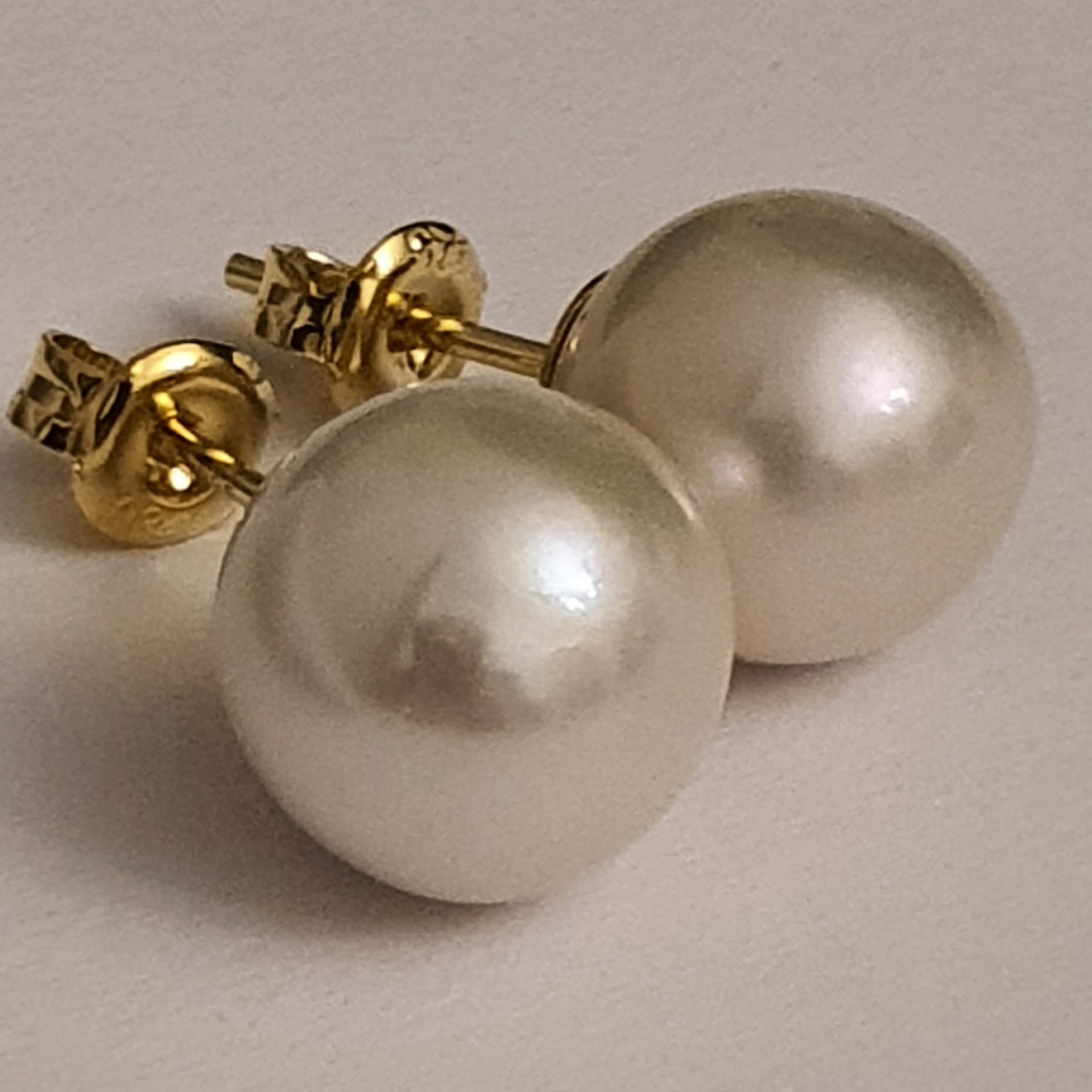 cercei stud argint 925 vermeil aur galben 18k, 3.43gr, ornati cu perle naturale de tip Edison de aprox. 10 si 10.5mm; pusi alaturi, perlele se vad usor diferite ca dimensiune si nuanta de alb, dar pusi in ureche acest lucru nu mai este vizibil; pretul afisat este cel redus pentru acest motiv