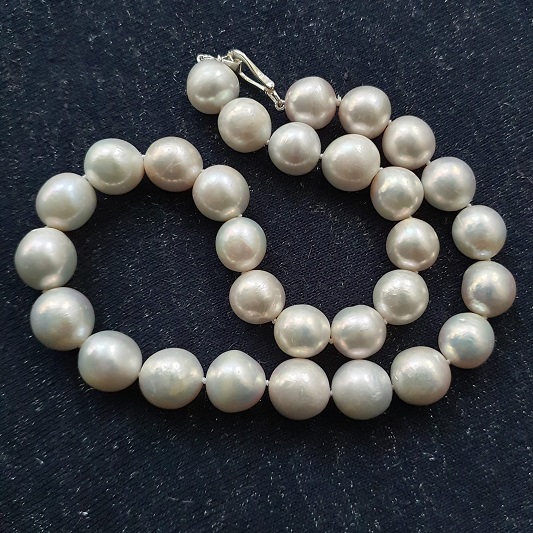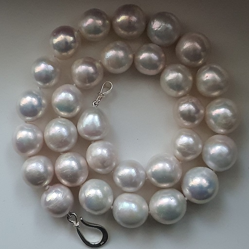 colier perle naturale edison, albe, cu luciu foarte bun si bun, de mari dimensiuni (13.5 - 14.8mm), rotunde si semi-rotunde, cu imperfectiuni naturale, cu impact nesemnificativ asupra imaginii de ansamblu, montate pe fir dublu de matase alba, cu inchizatoare open din argint 925 vermeil aur alb 18k, in greutate totala de 111,75 grame; greutatea mare a colierului permite folosirea sigura a acestui tip de inchizatoare; lungime este de 47cm cu tot cu inchizatoare