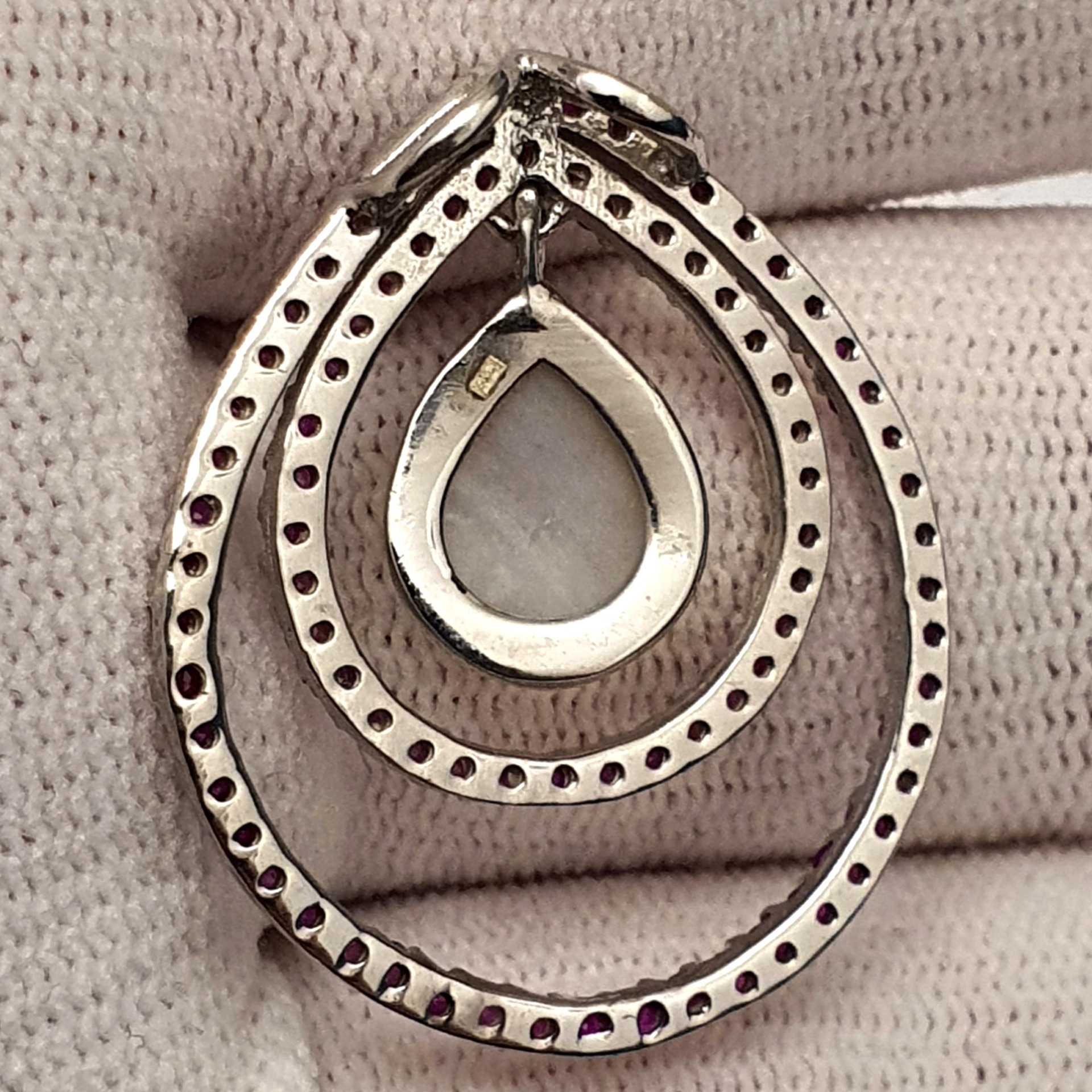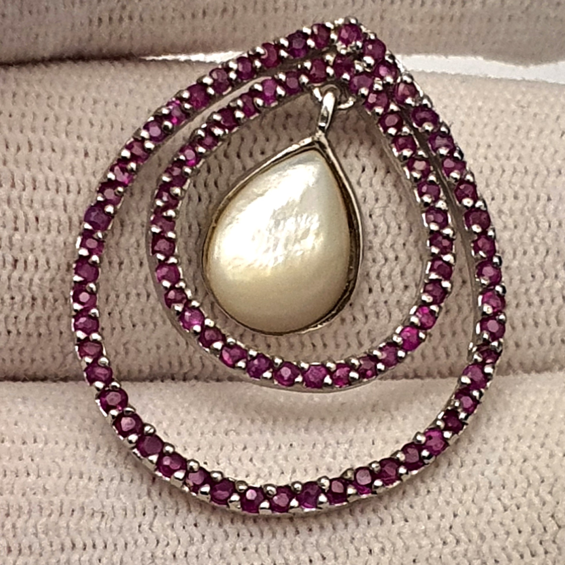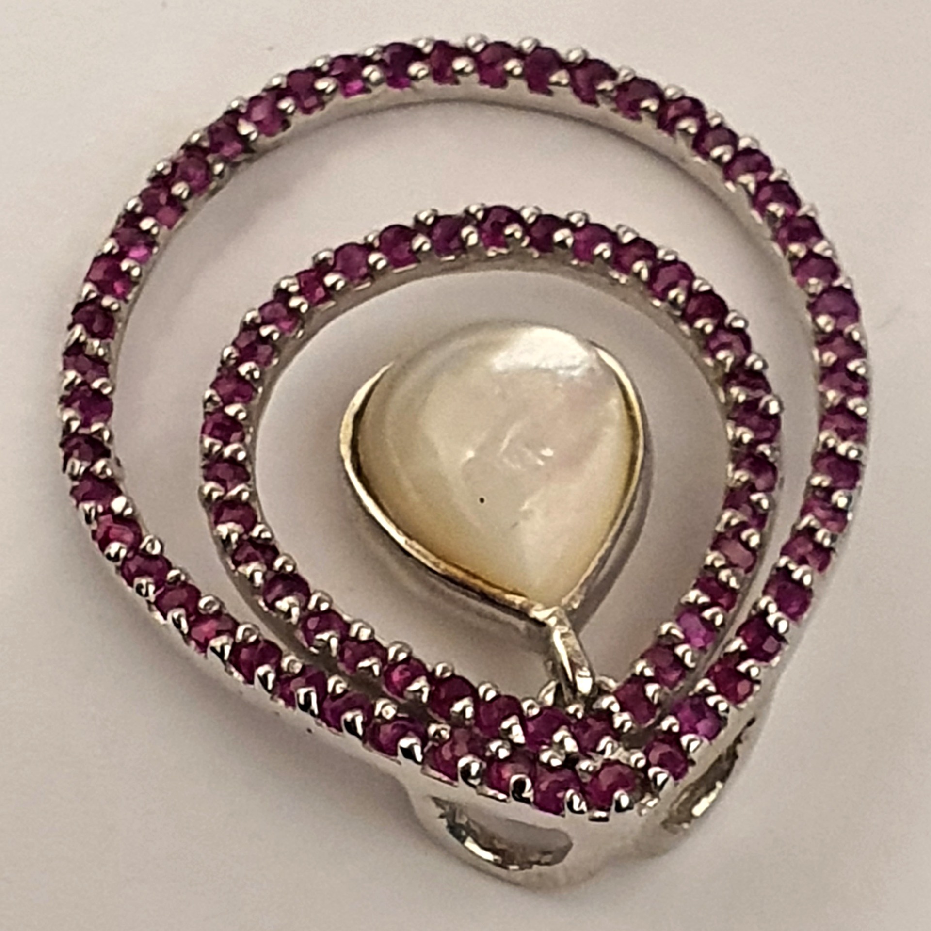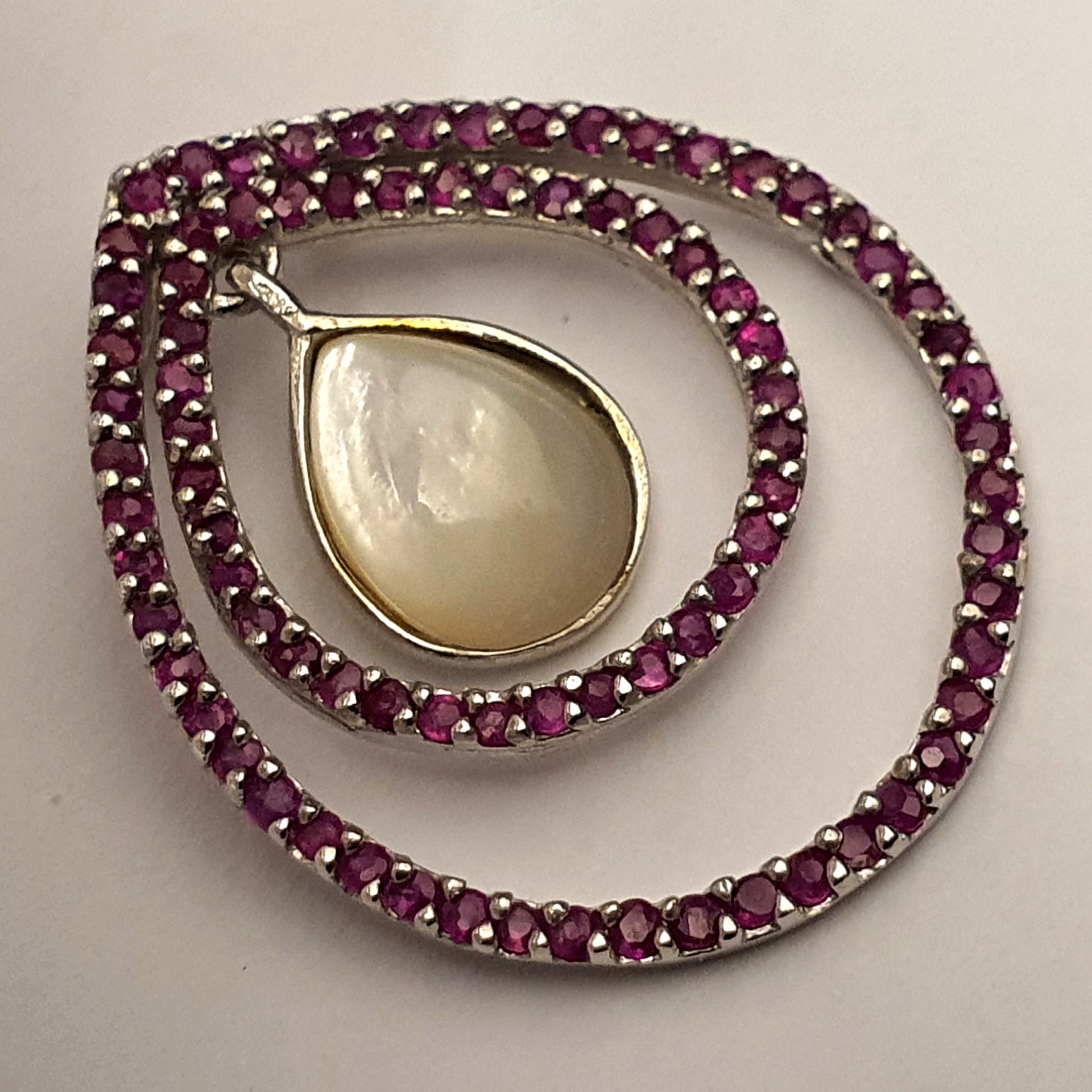 frumos pandantiv argint 925 cu sidef si rubine naturale tratate, in greutate de 3.79 grame, cu dimensiunile 30x25mm; partea mobila pune foarte frumos in evidenta sideful, care capteaza lumina la fiecare miscare