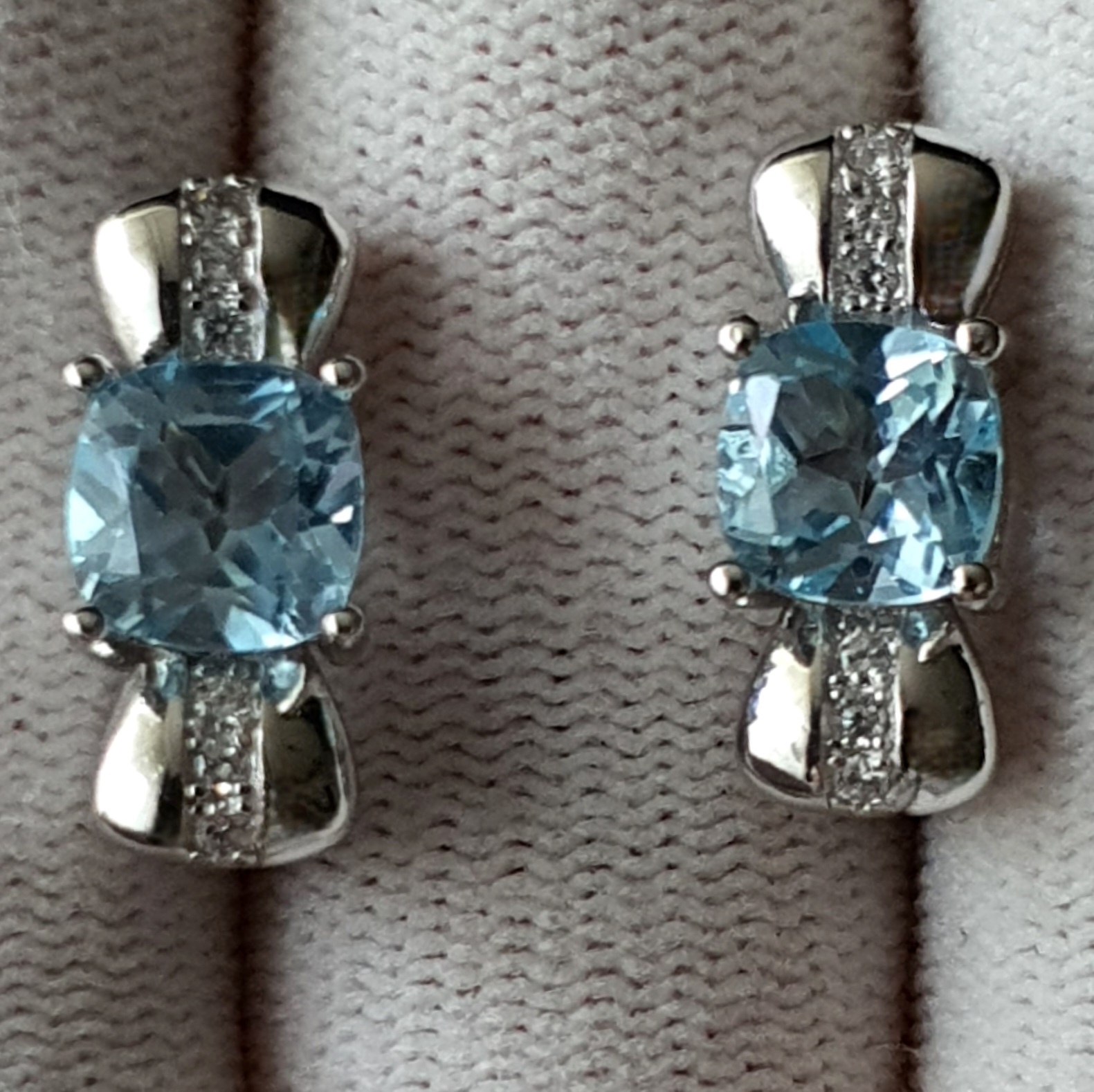 frumosi cercei argint 925 vermeil aur alb 14k, 5.70 grame, ornati cu topaze naturale bleu tratate standard, pernite de 7.5mm, si cubic zirconia; dimensiuni: 17.70 x 7.50mm