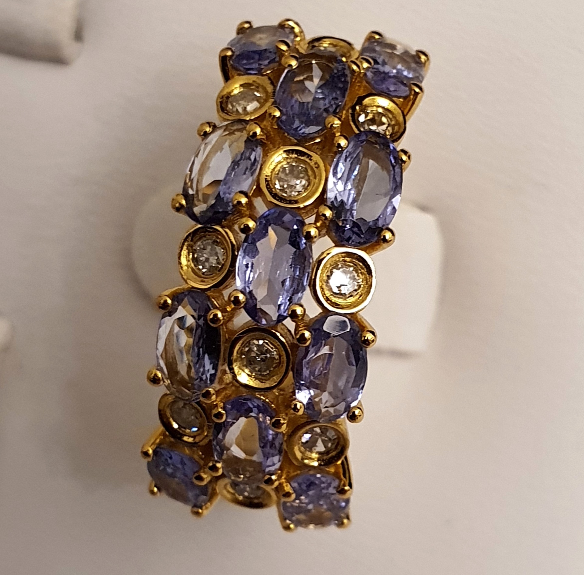 inel argint 925 vermeil aur galben 14k, 3.38grame, marimea 55.5-55.75, ornat cu 11 tanzanite naturale tratate termic, de aprox. 2.15ct, si 10 diamante naturale de 0.14ct, de culoare/claritate I/I; latimea monturii este de 9.41mm