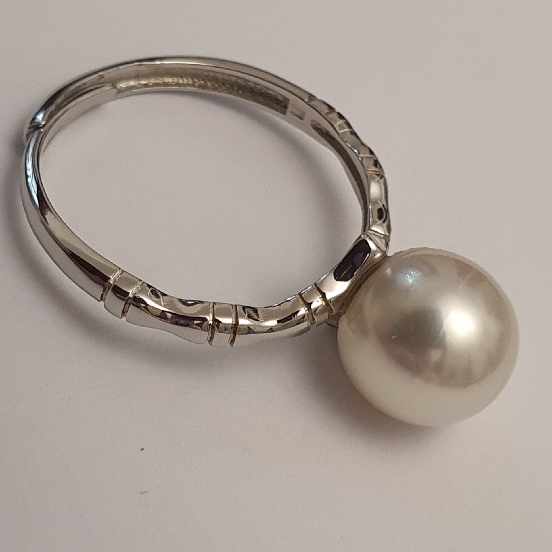 inel reglabil marimea 56, argint 925 vermeil aur alb 18k, 2.43 grame, ornat cu o frumoasa perla naturala alba South Sea, de 9.2mm