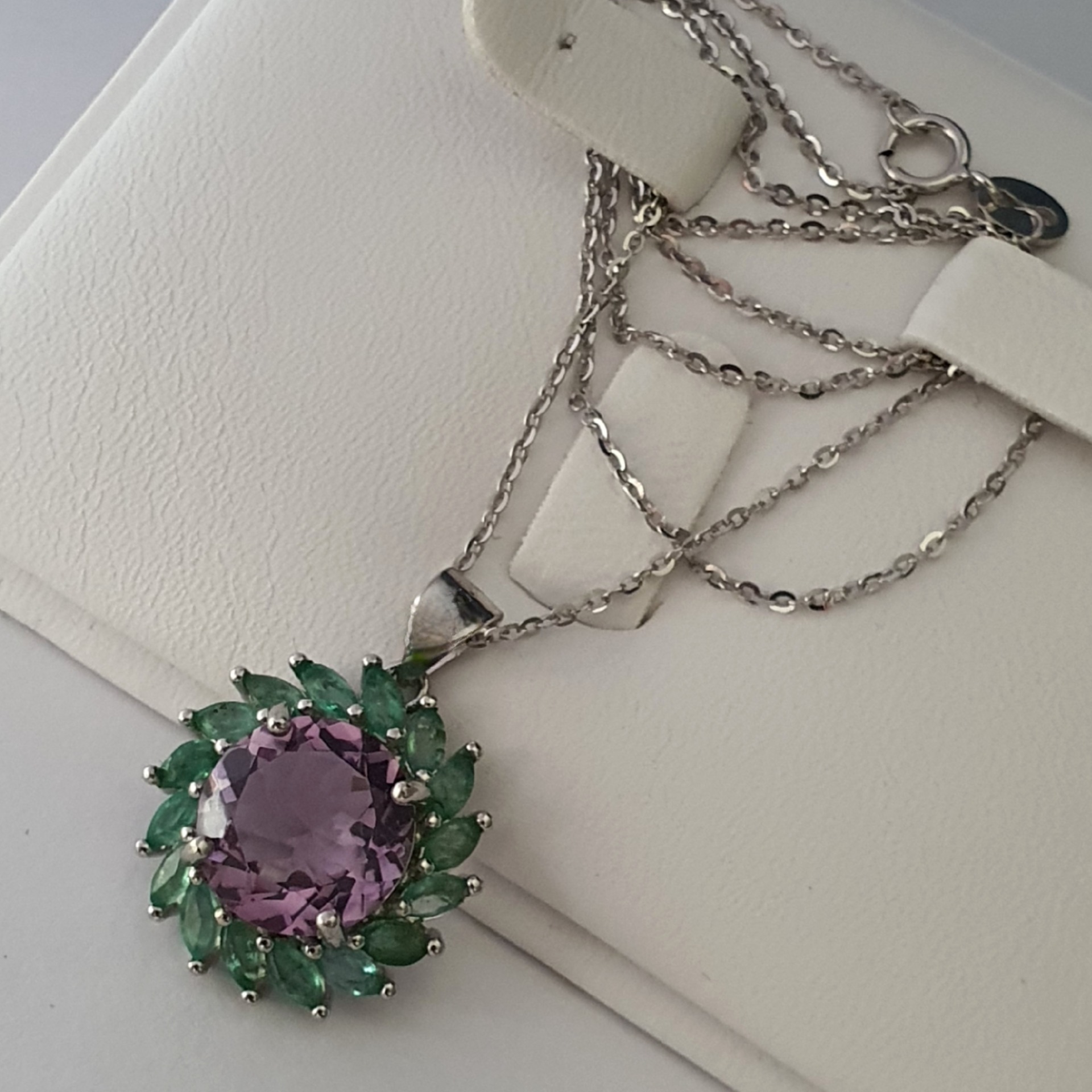 lant cu pandantiv, argint 925 vermeil aur alb 14k, cu ametist si smaralde