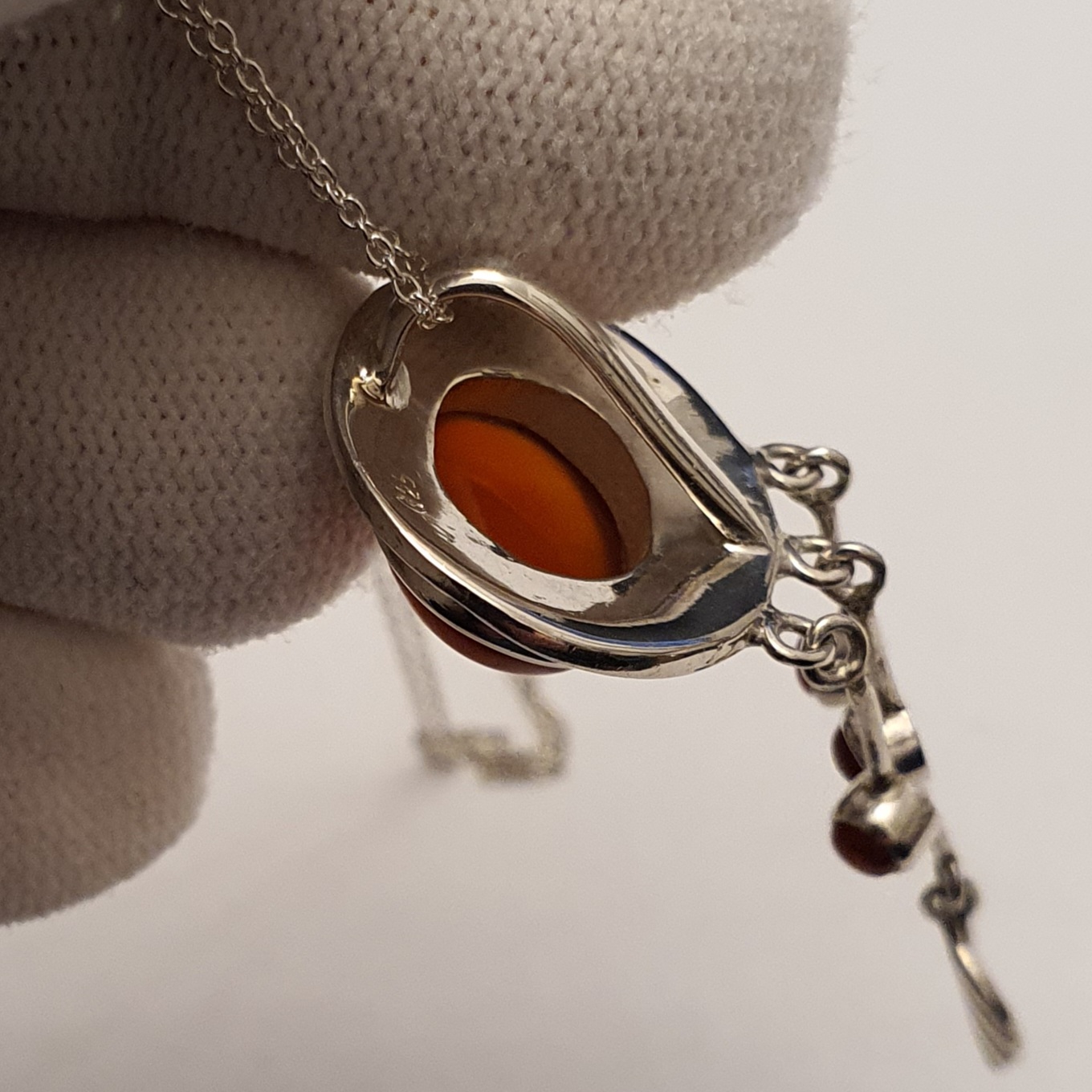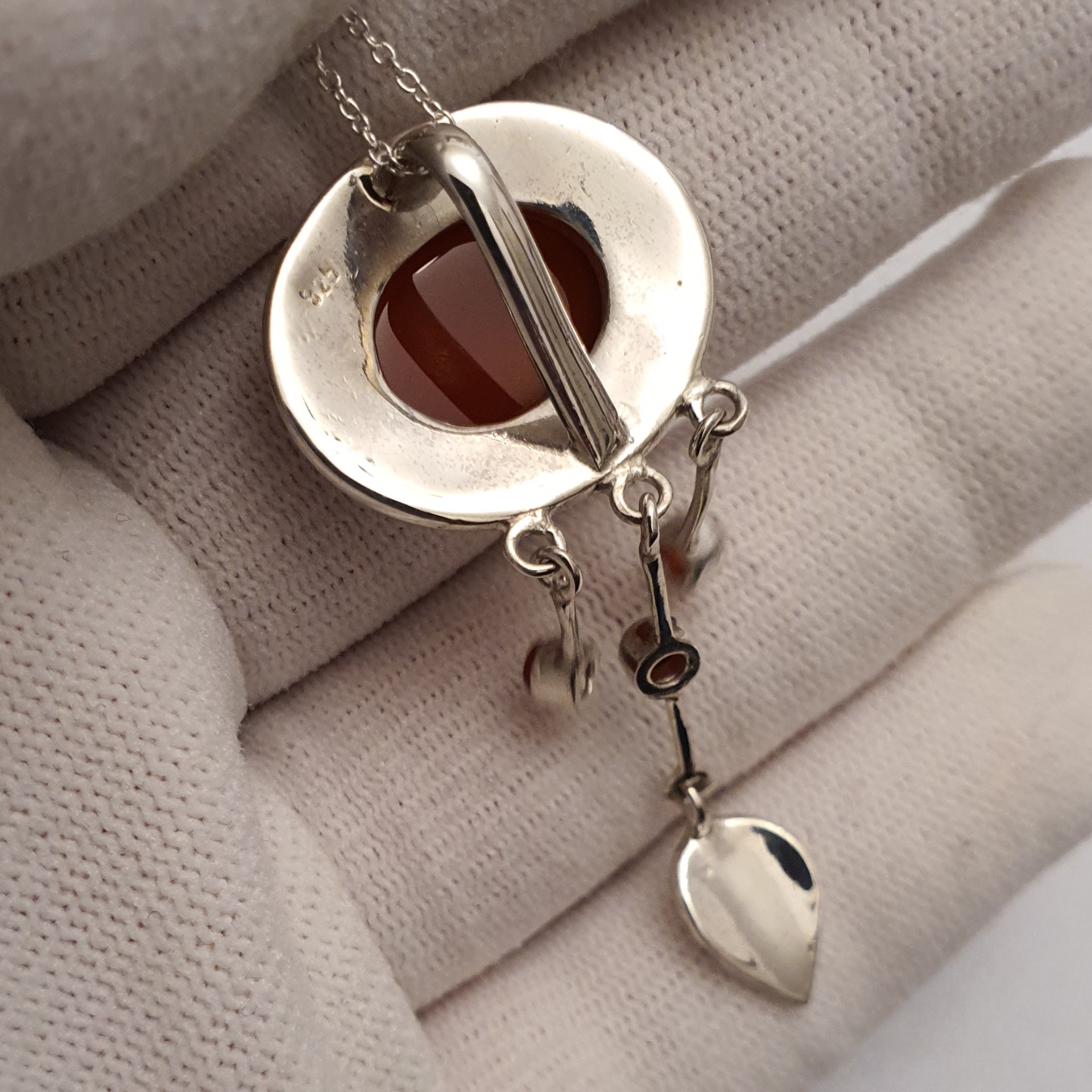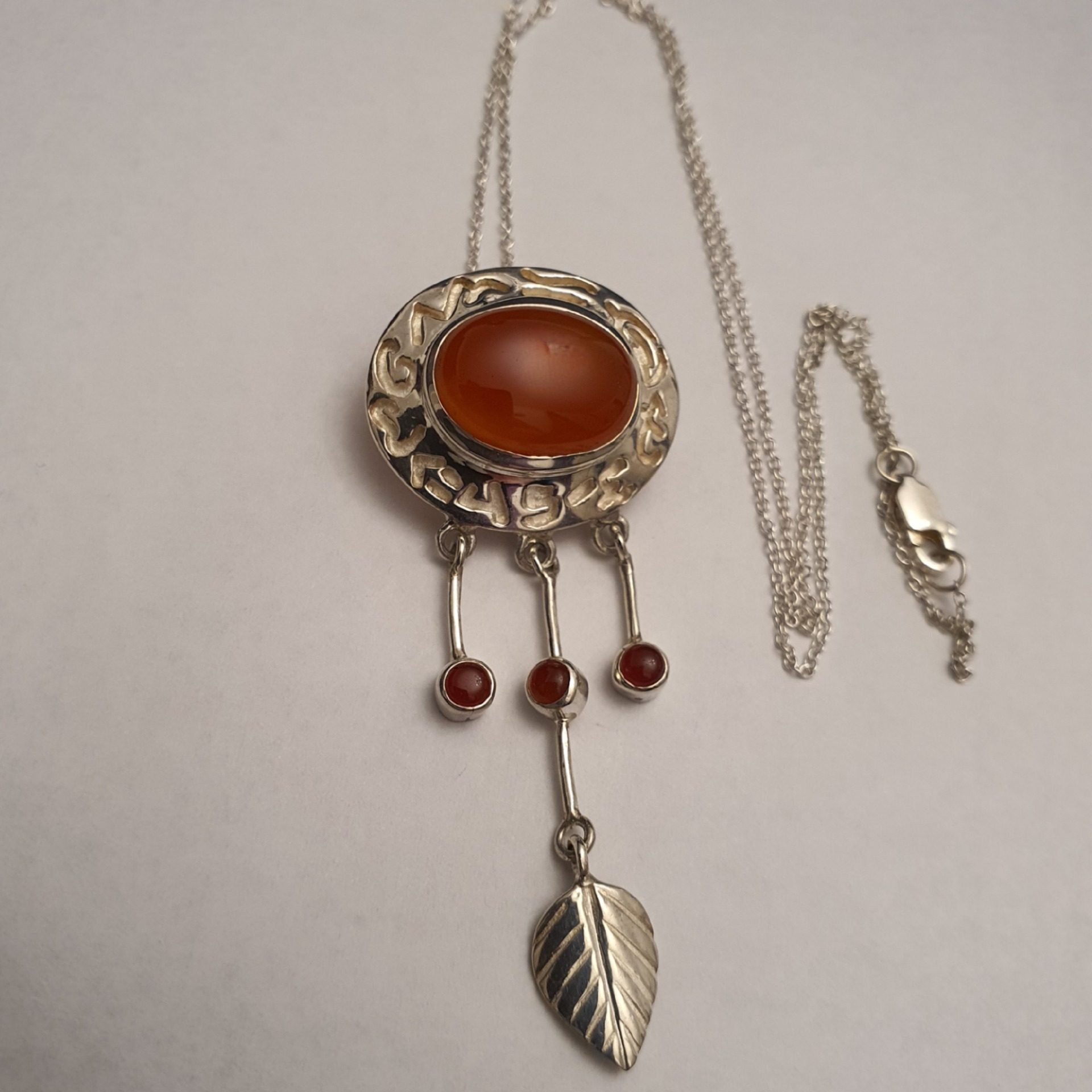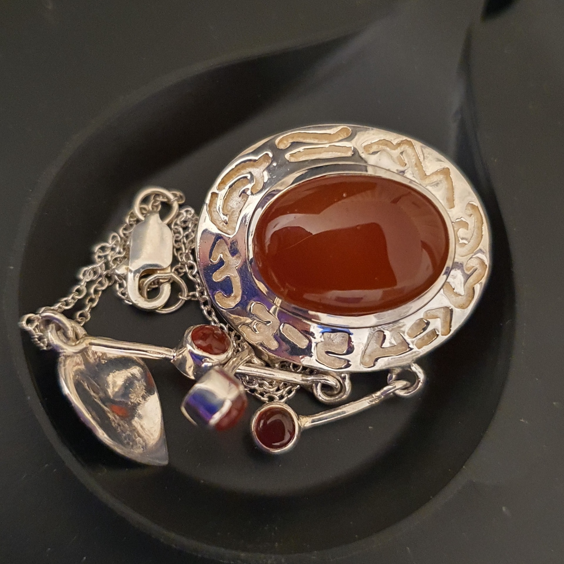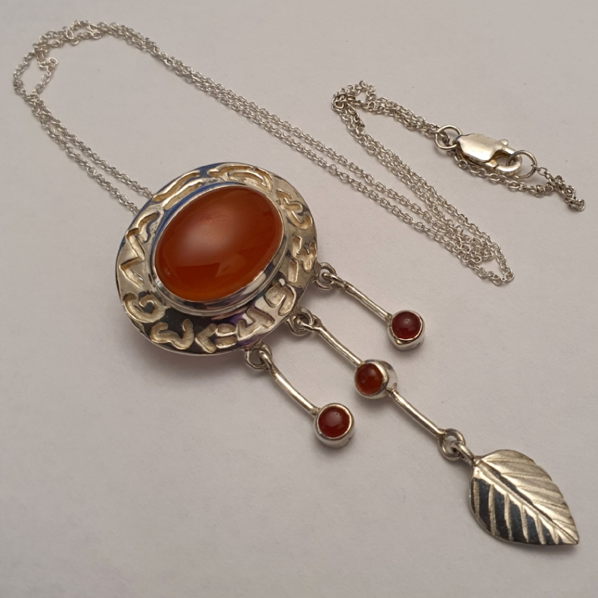 lant si pandantiv statement ornat cu un carneol natural, in greutate de 8.30 grame, realizate din argint 925; lantul masoara 40cm si pandantivul are 5,5cm, din care montura masoara 2.5x2cm