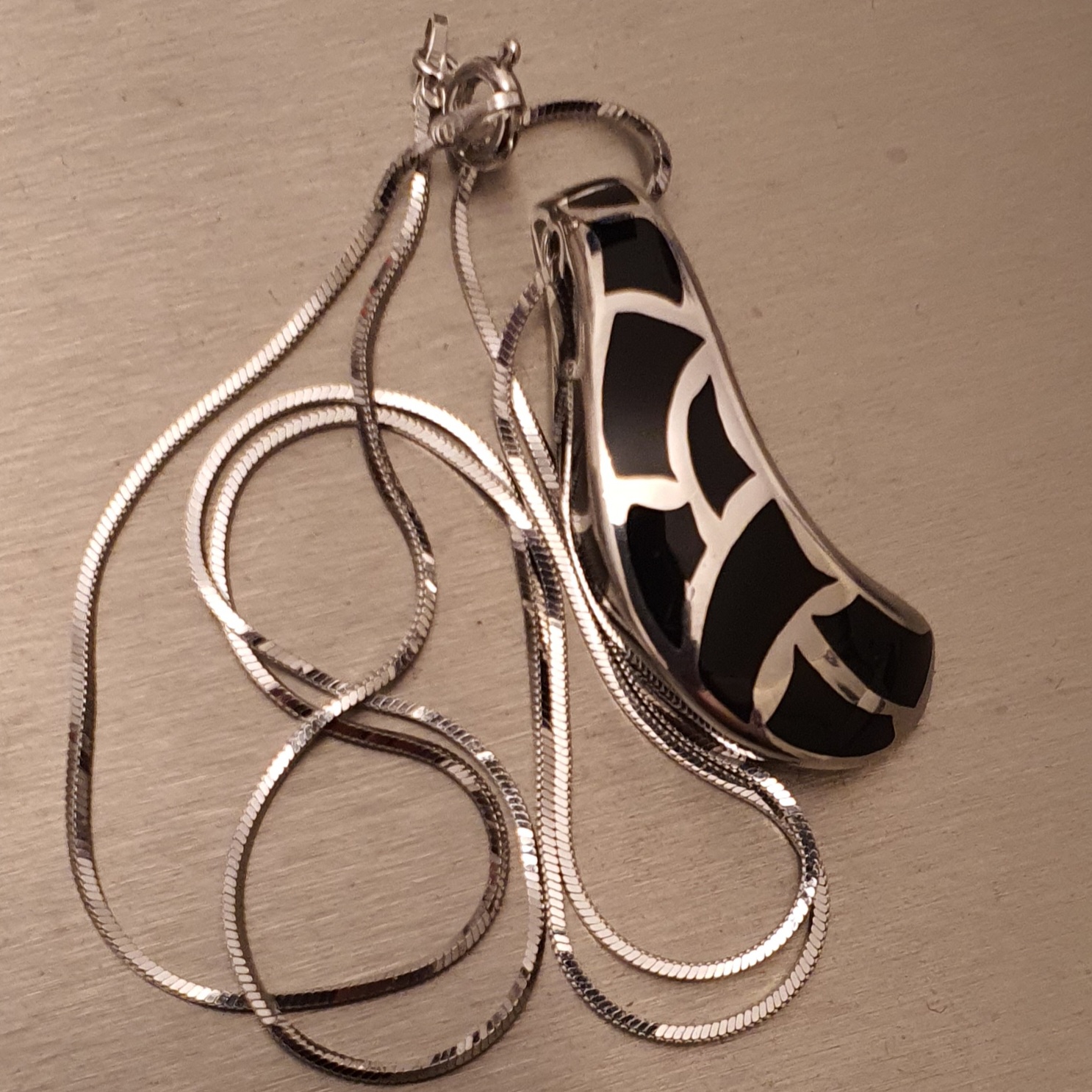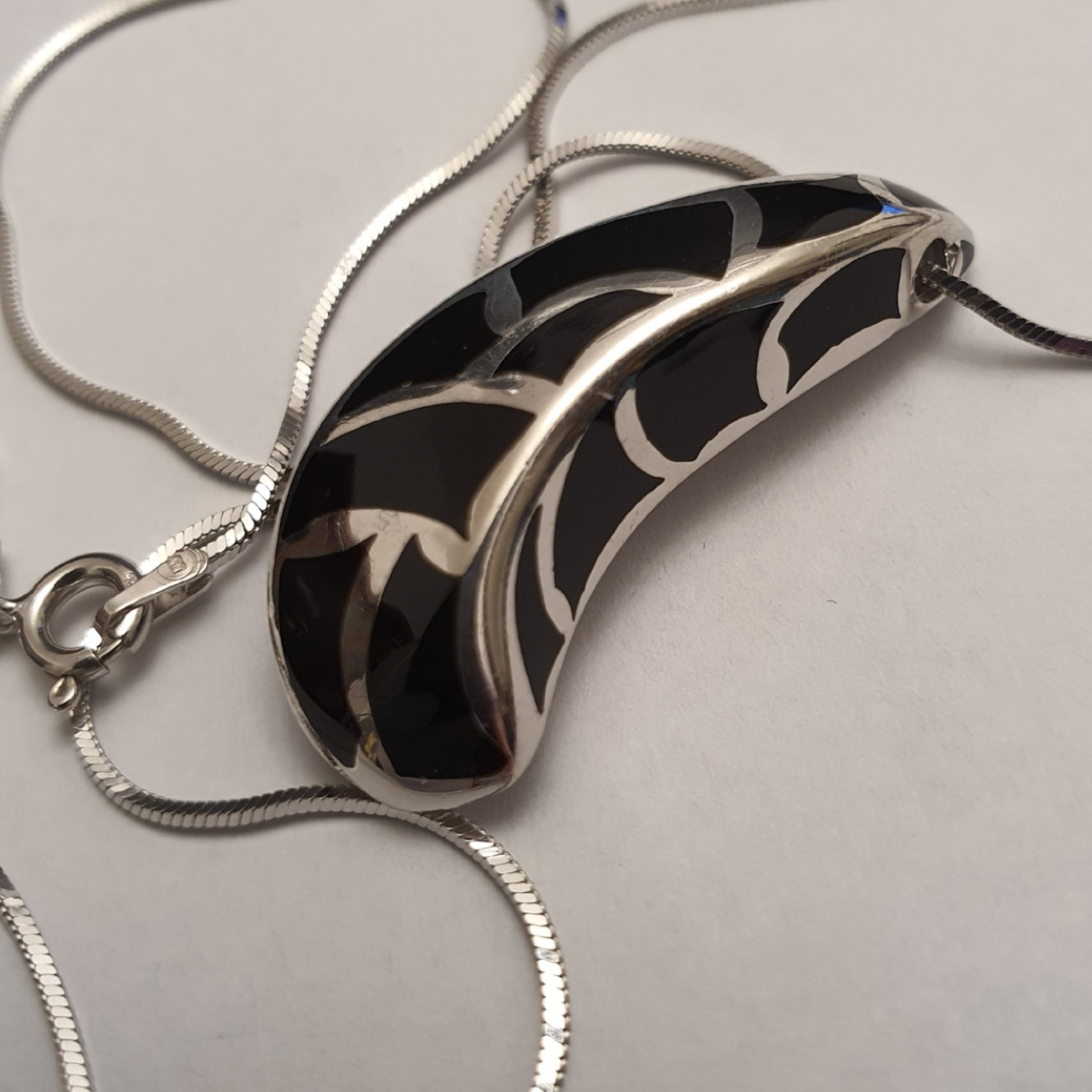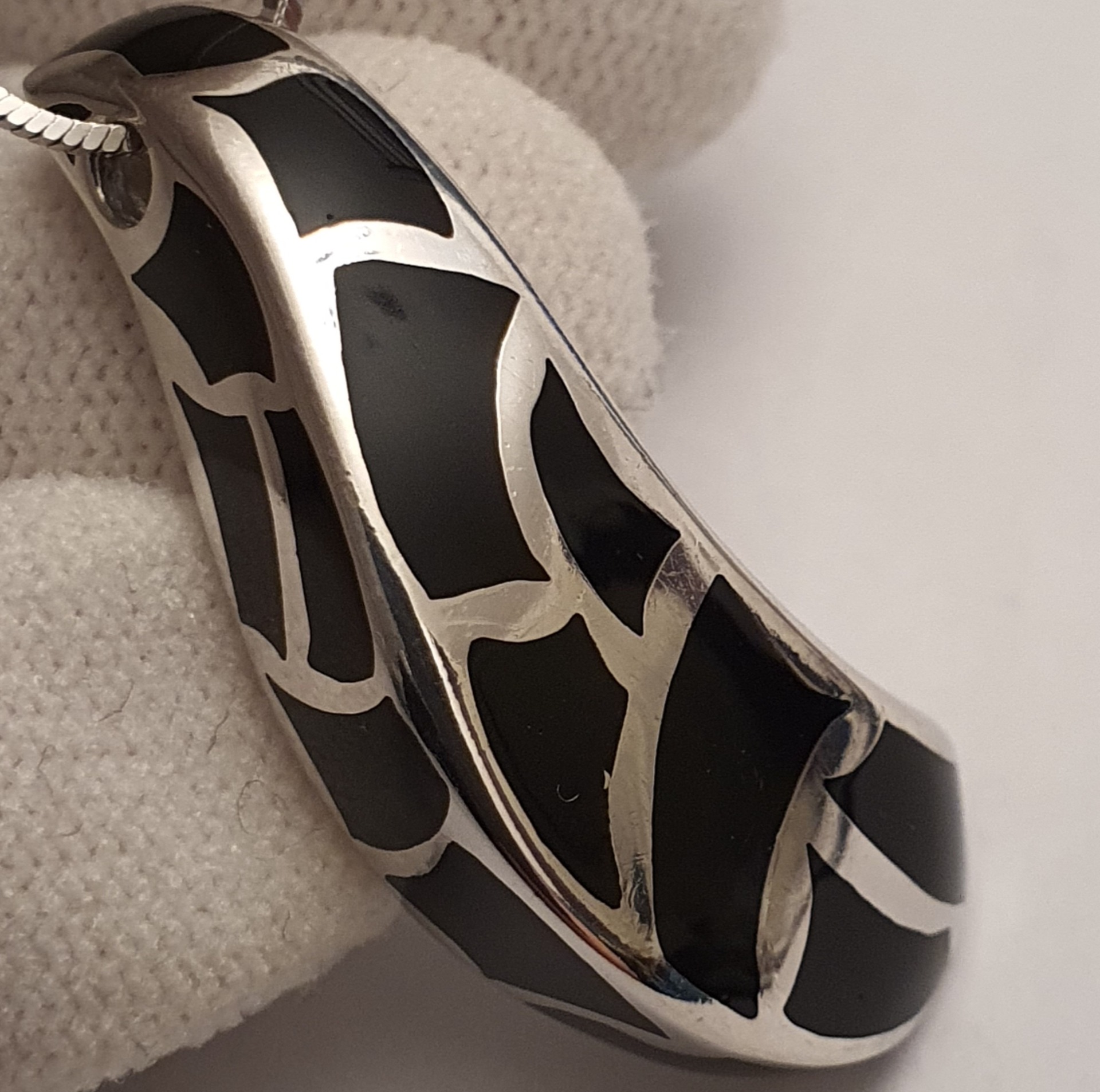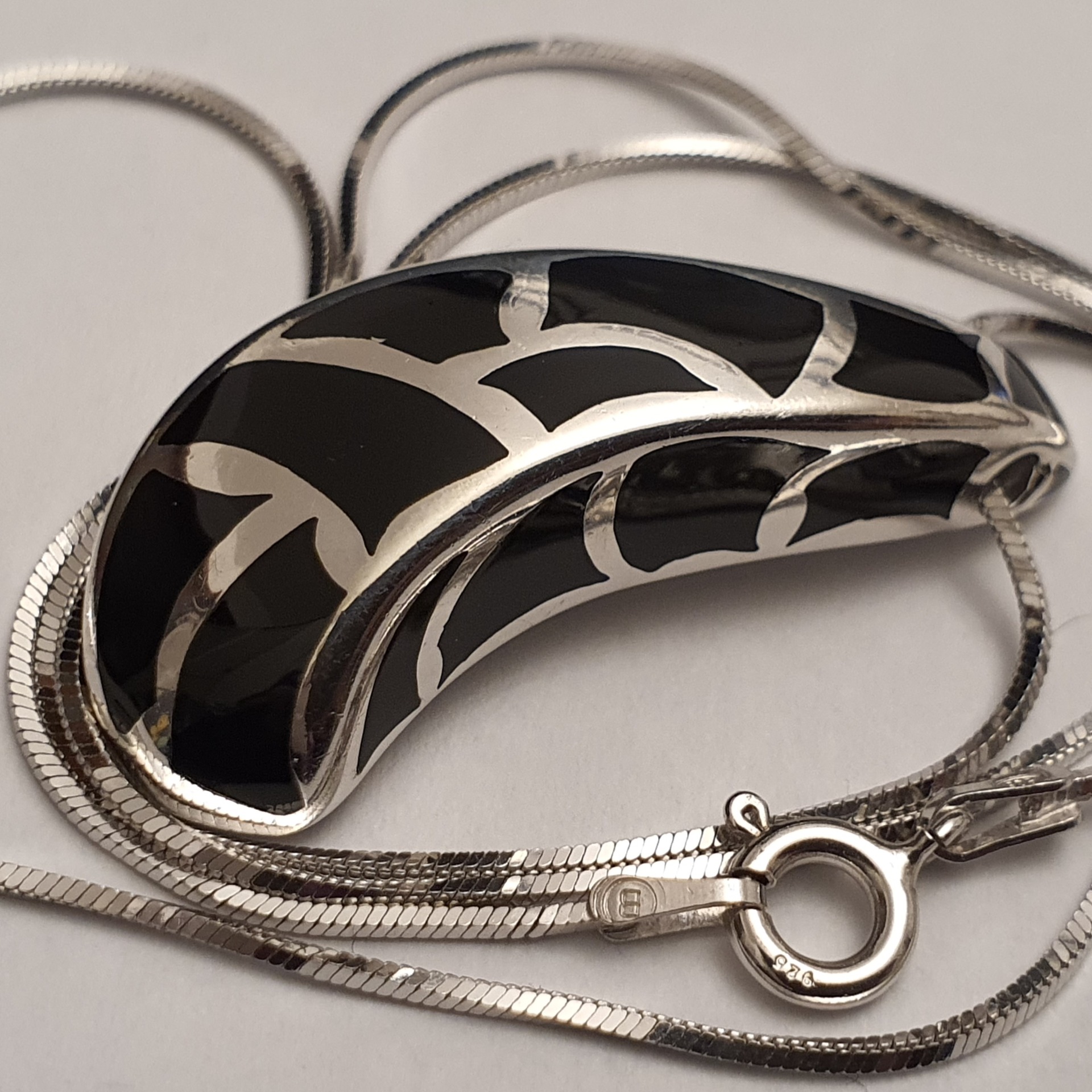 lant si pandantiv statement ornat cu email negru, in greutate de 12.95 grame, realizate din argint 925 placat cu rodiu; lantul masoara 45cm si pandantivul are 3,7cm; poate face un set cu cerceii de aici https://www.lovesilver.ro/p/cercei-omega-argint-925-cu-email-negru/