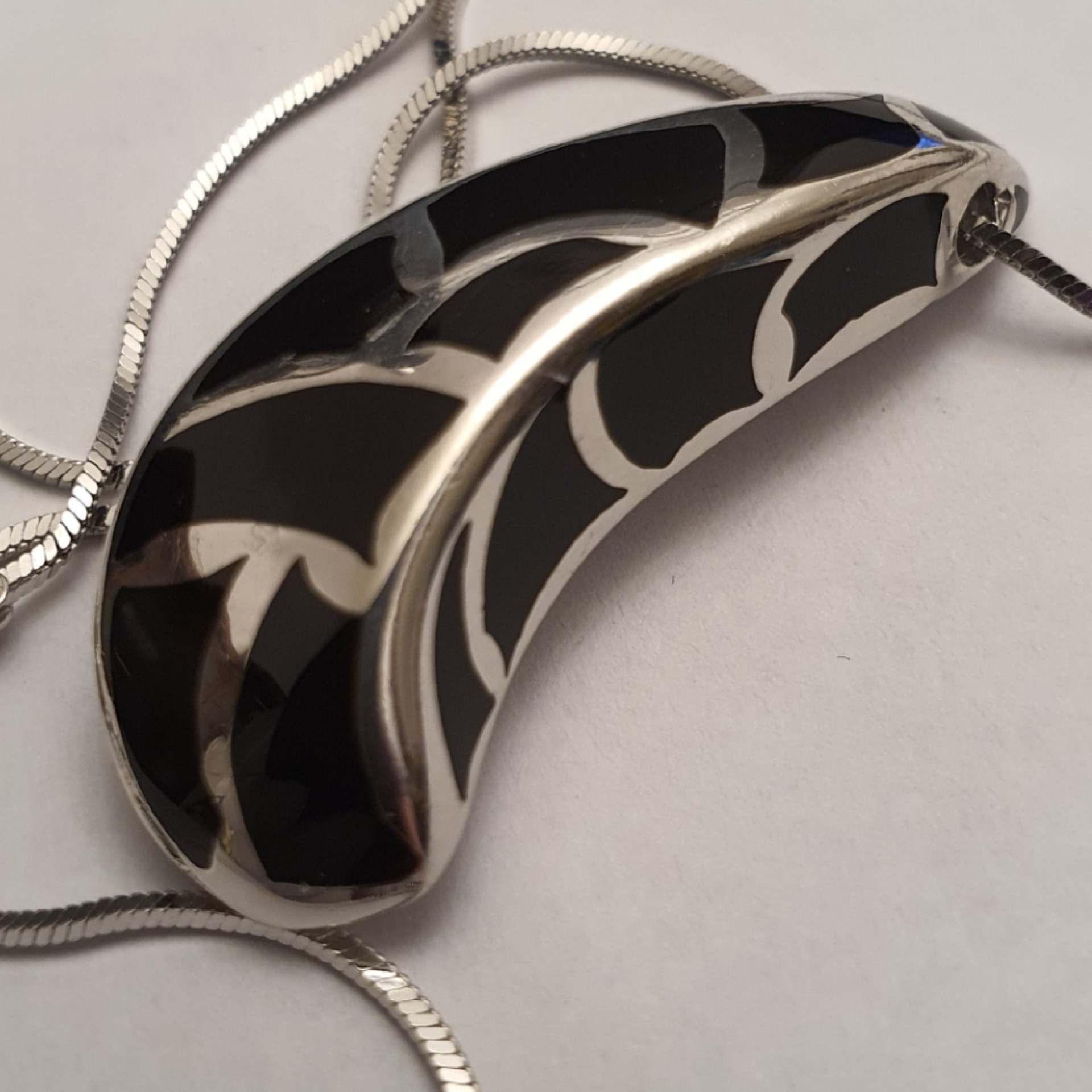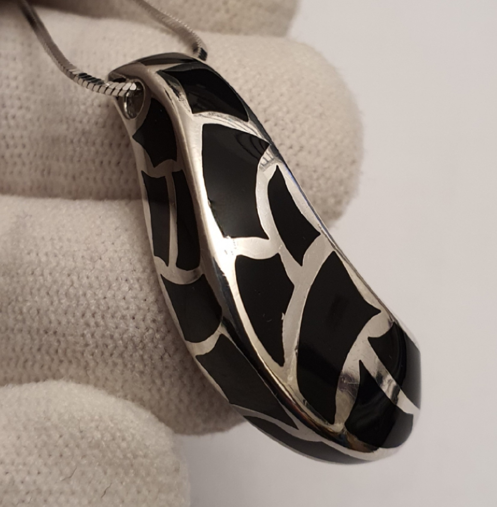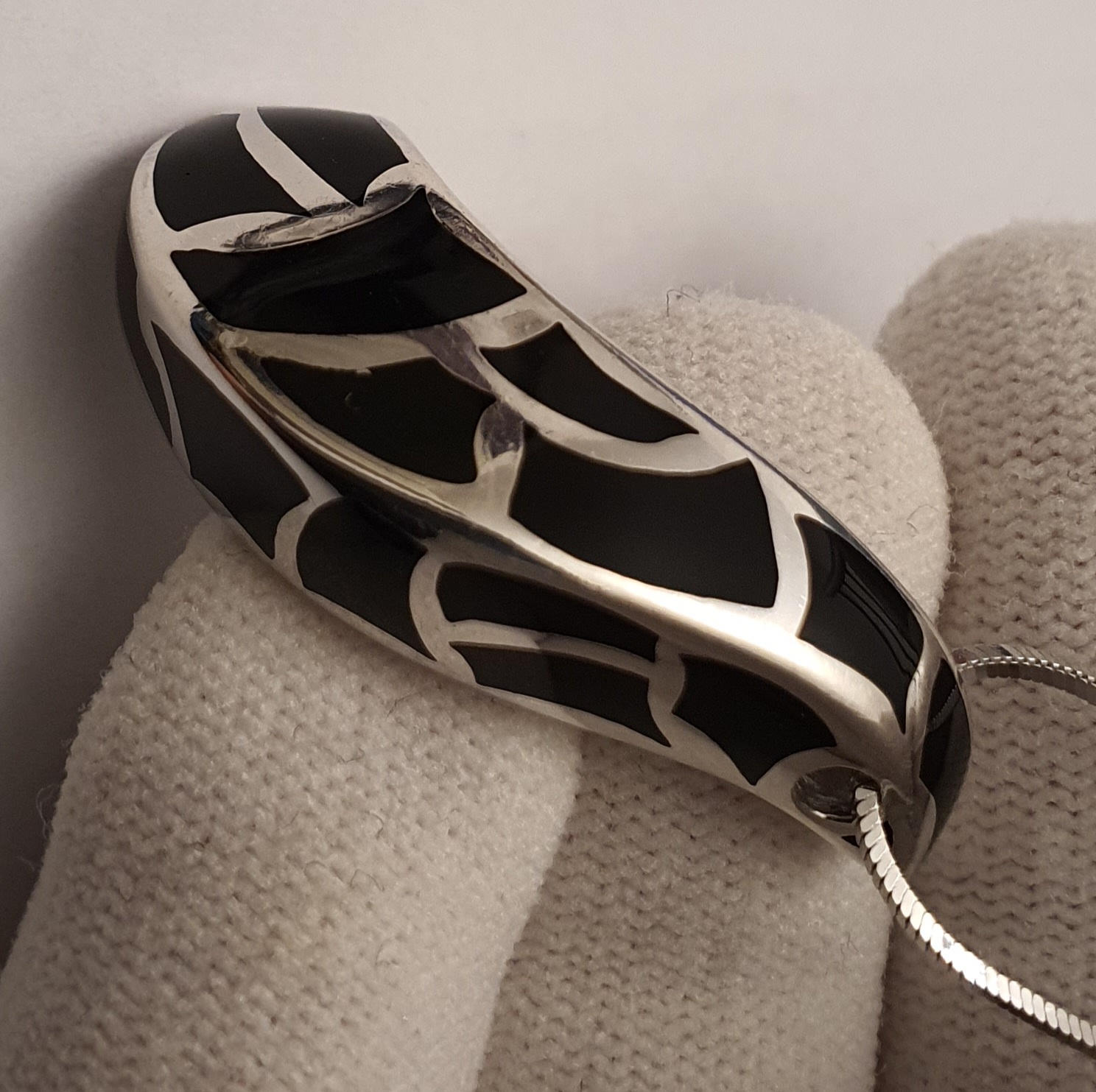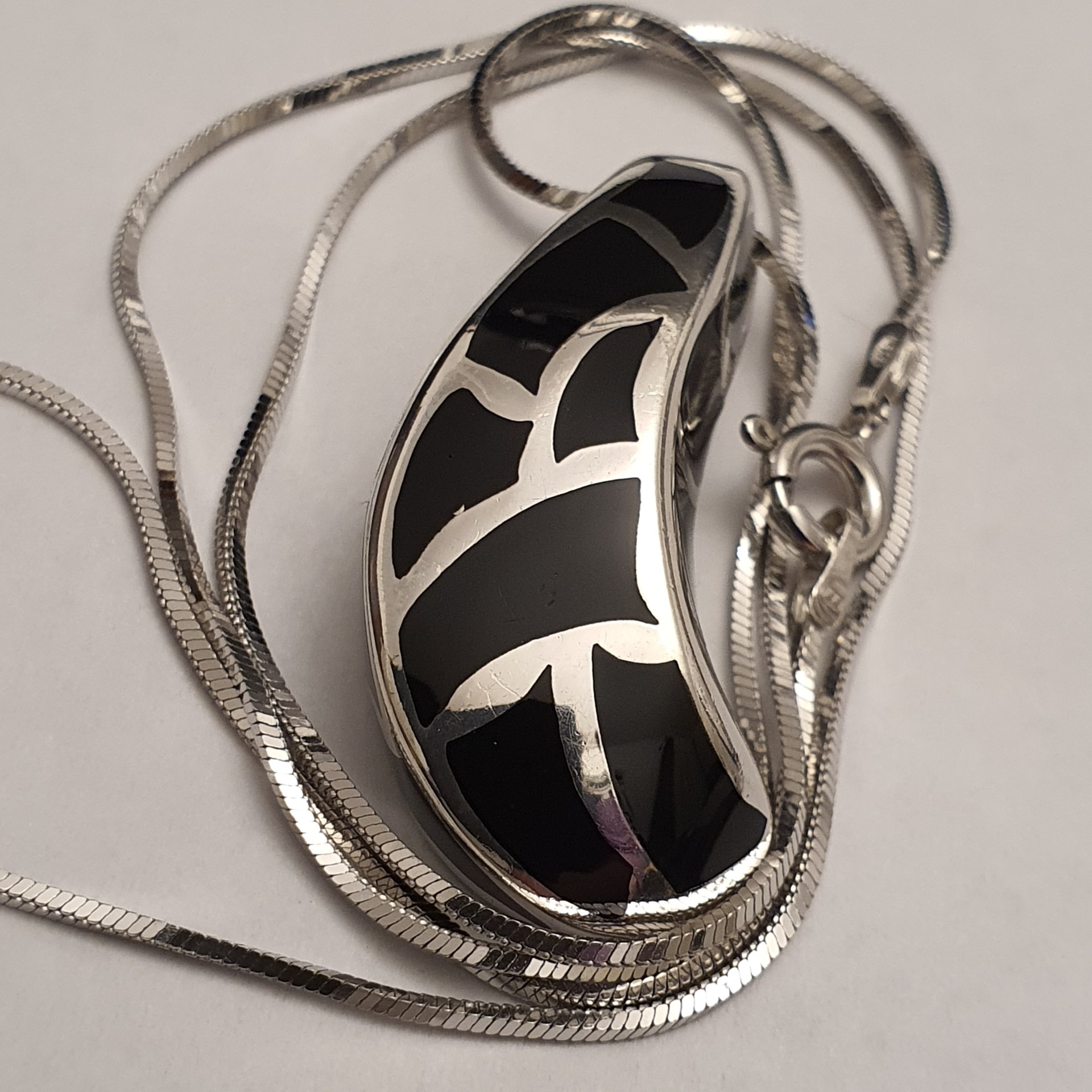 lant si pandantiv statement ornat cu email negru, in greutate de 12.95 grame, realizate din argint 925 placat cu rodiu; lantul masoara 45cm si pandantivul are 3,7cm; poate face un set cu cerceii de aici https://www.lovesilver.ro/p/cercei-omega-argint-925-cu-email-negru/