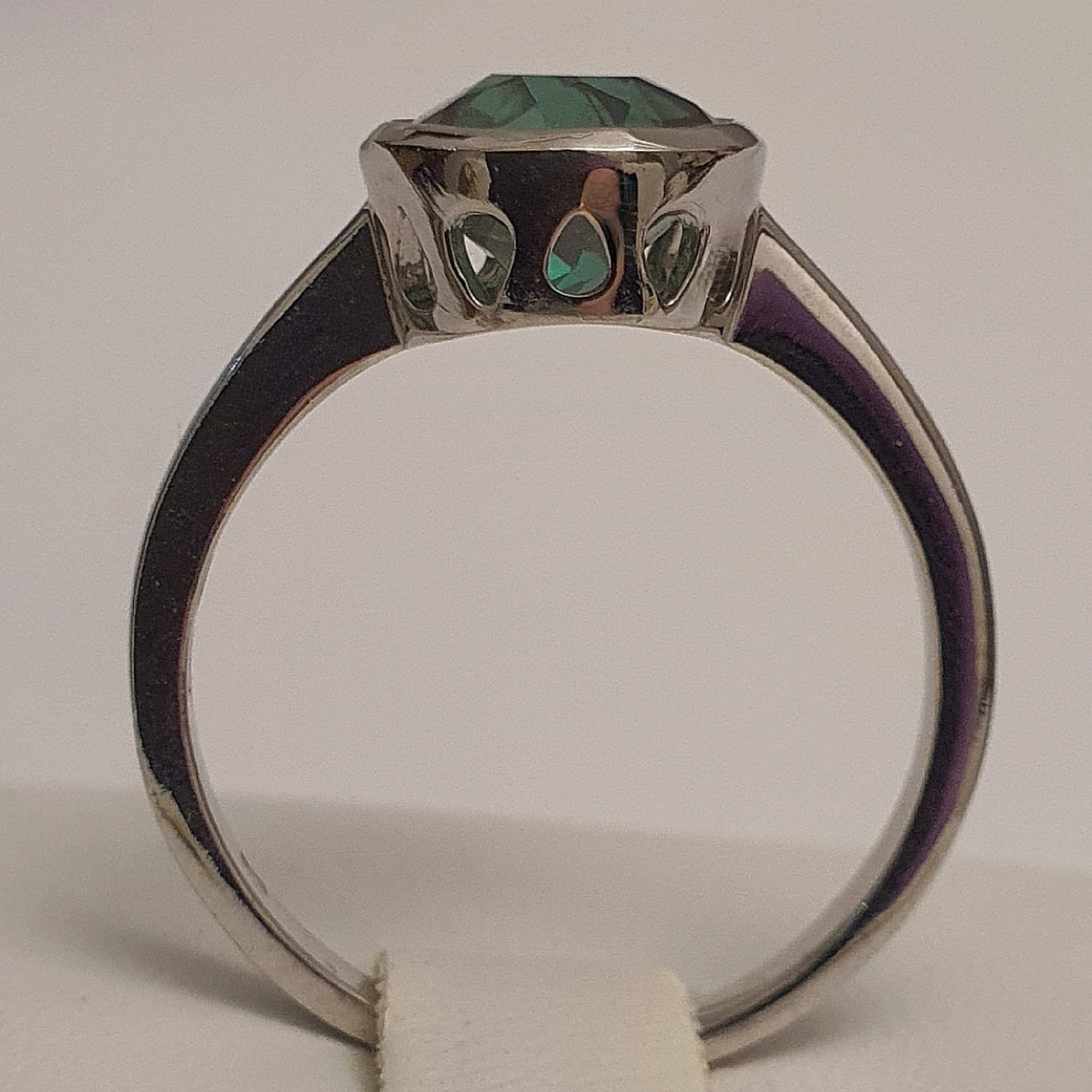 inel argint 925 vermeil aur alb 14k, 2.78 grame, marimea 56.5, ornat cu un frumos topaz verde-albastrui (siniliu) rotund de 8mm, tratat pentru culoare (difuziune); stil contemporan, integrabil in multe tinute