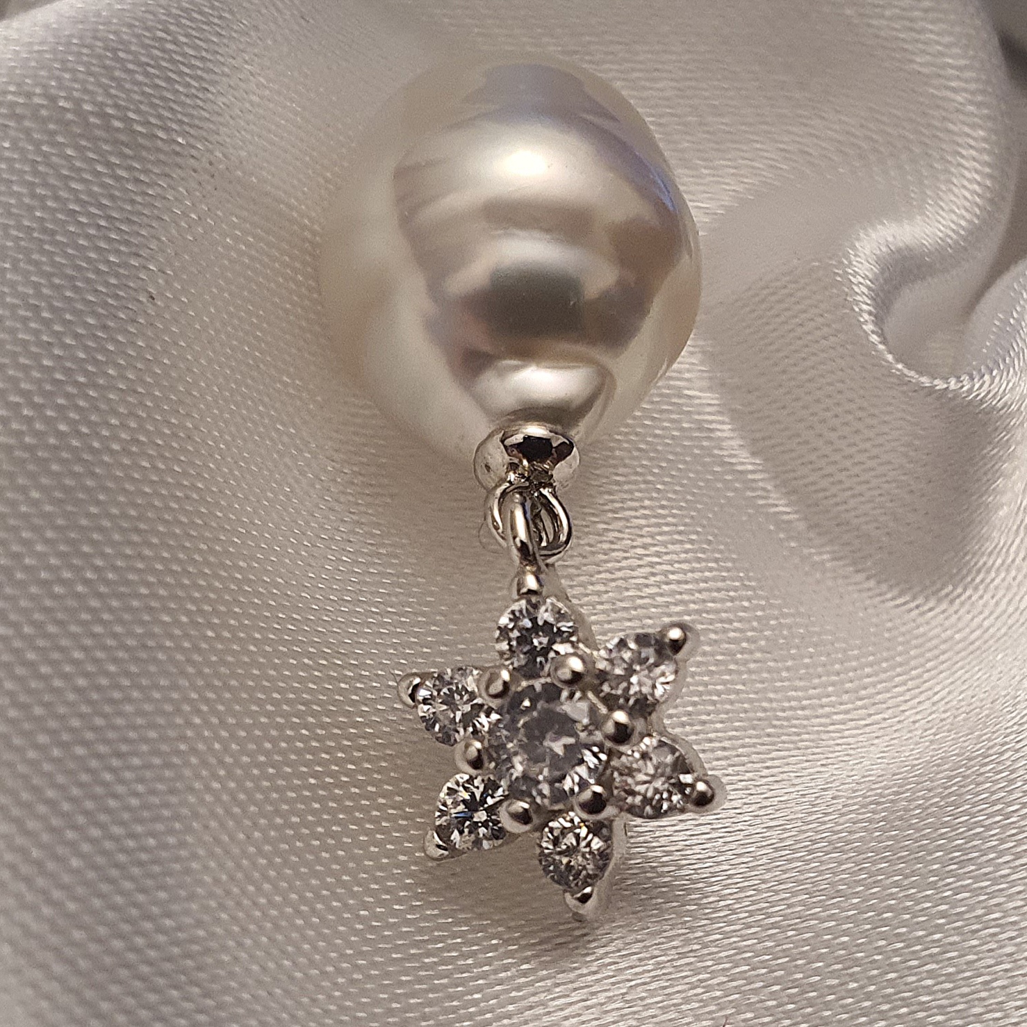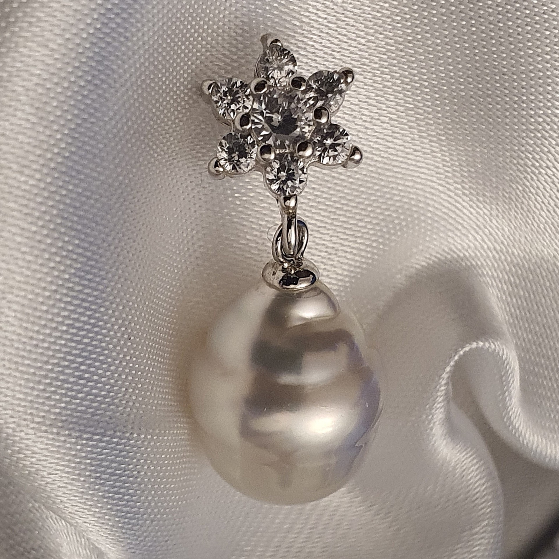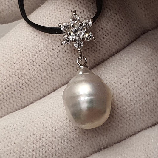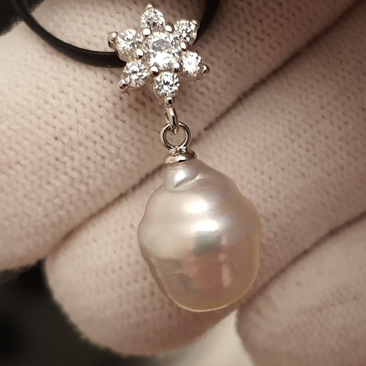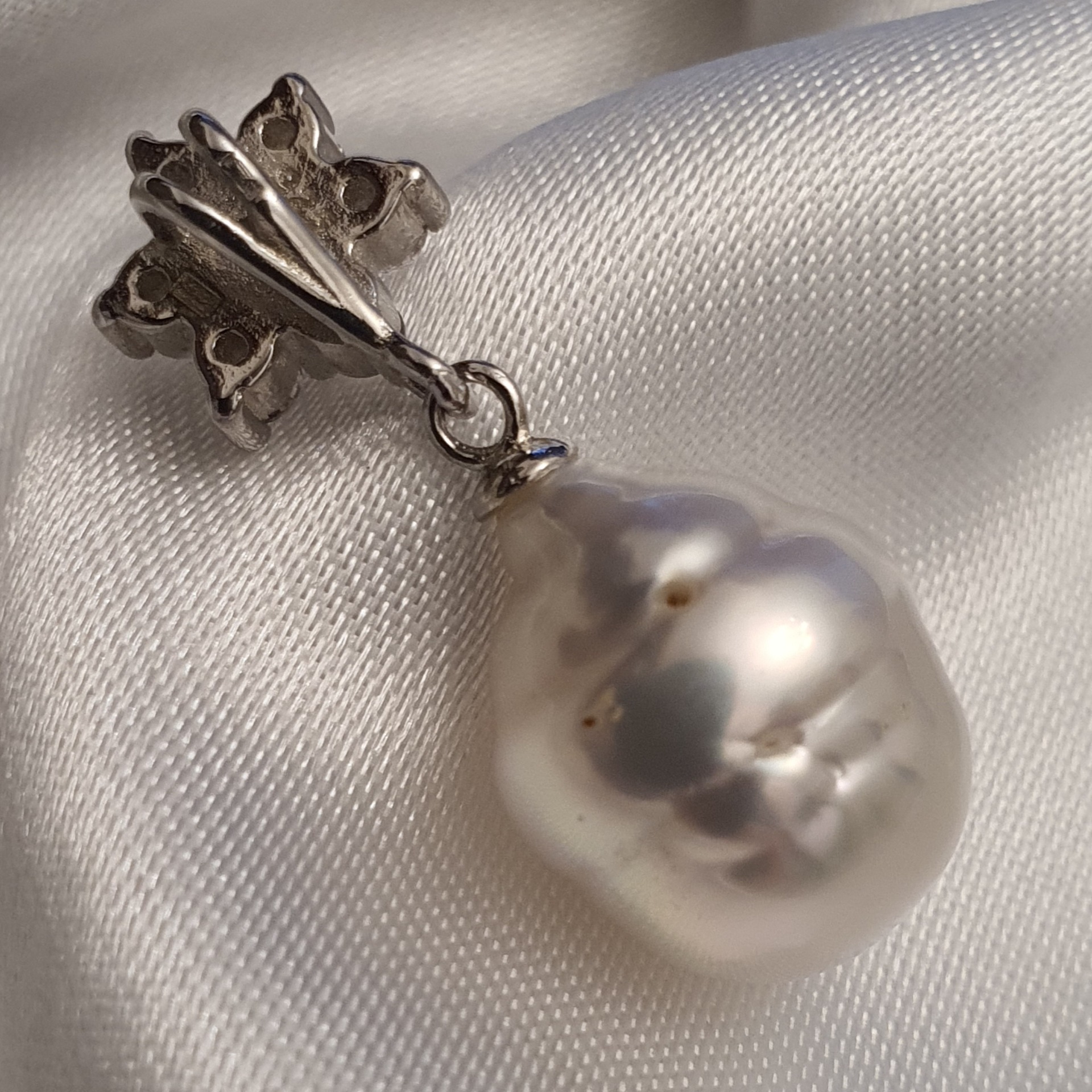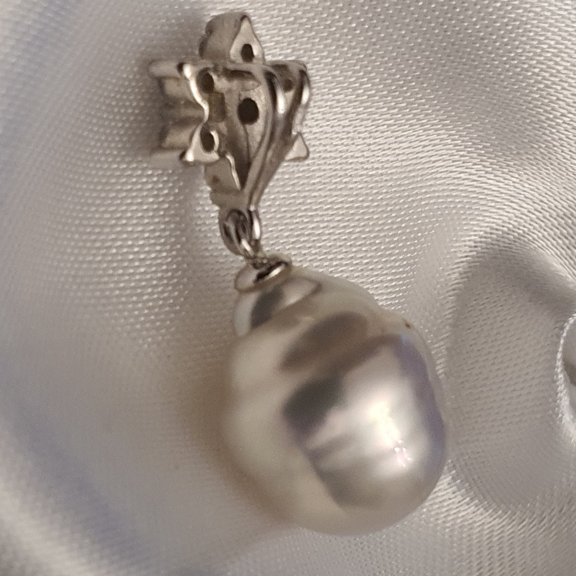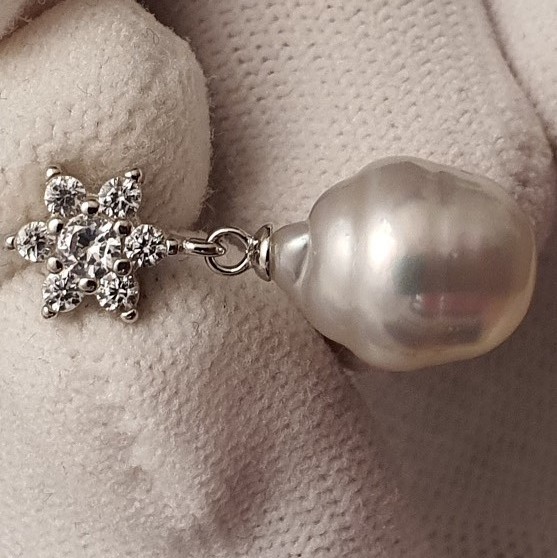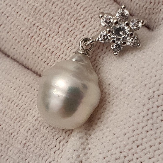 frumos pandantiv argint 925 vermeil aur alb 18k, 2.54gr, ornat cu o perla naturala South Sea, alba (silvery white), cu luciu excelent, cu imperfectiuni naturale (pe spate), forma baroc, de 13x10.33mm, si cristale incolore; pandantivul masoara 25.33x10.33mm