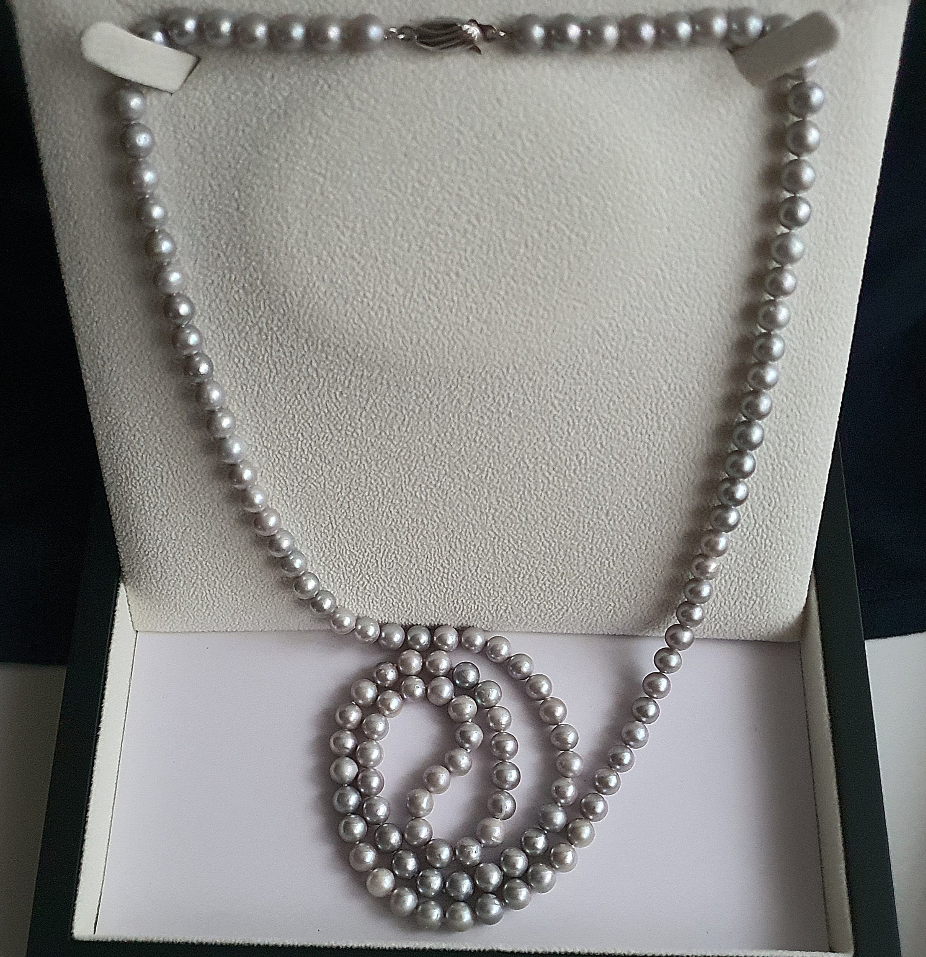 superb colier din perle naturale gri-argintii cu over-tonuri aurii si roz (cod 108.01), rotunde de 6,5 - 7mm , in greutate de 51,11 grame, cu luciu foarte frumos si cromatica naturala eleganta, cu inchizatoare din argint 925 vermeil aur alb 18k