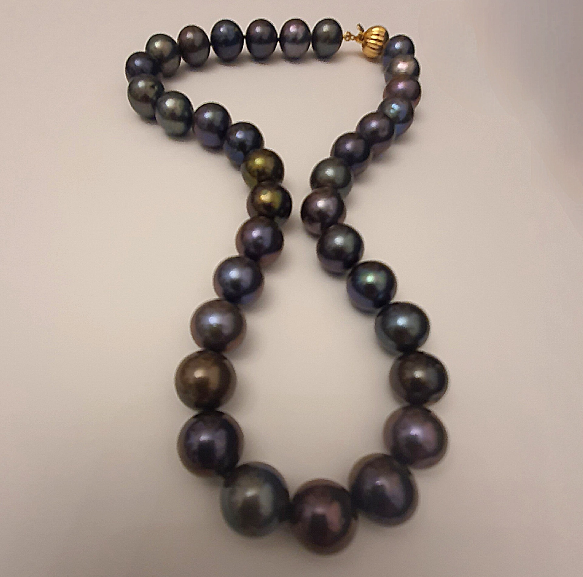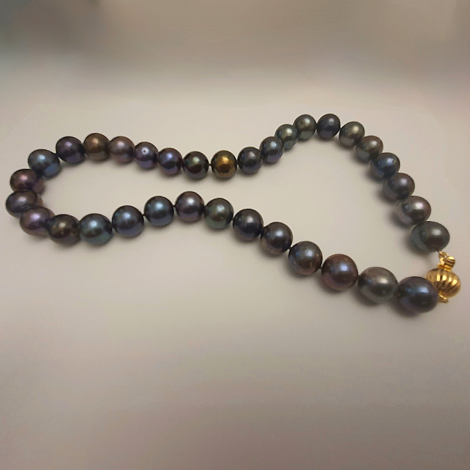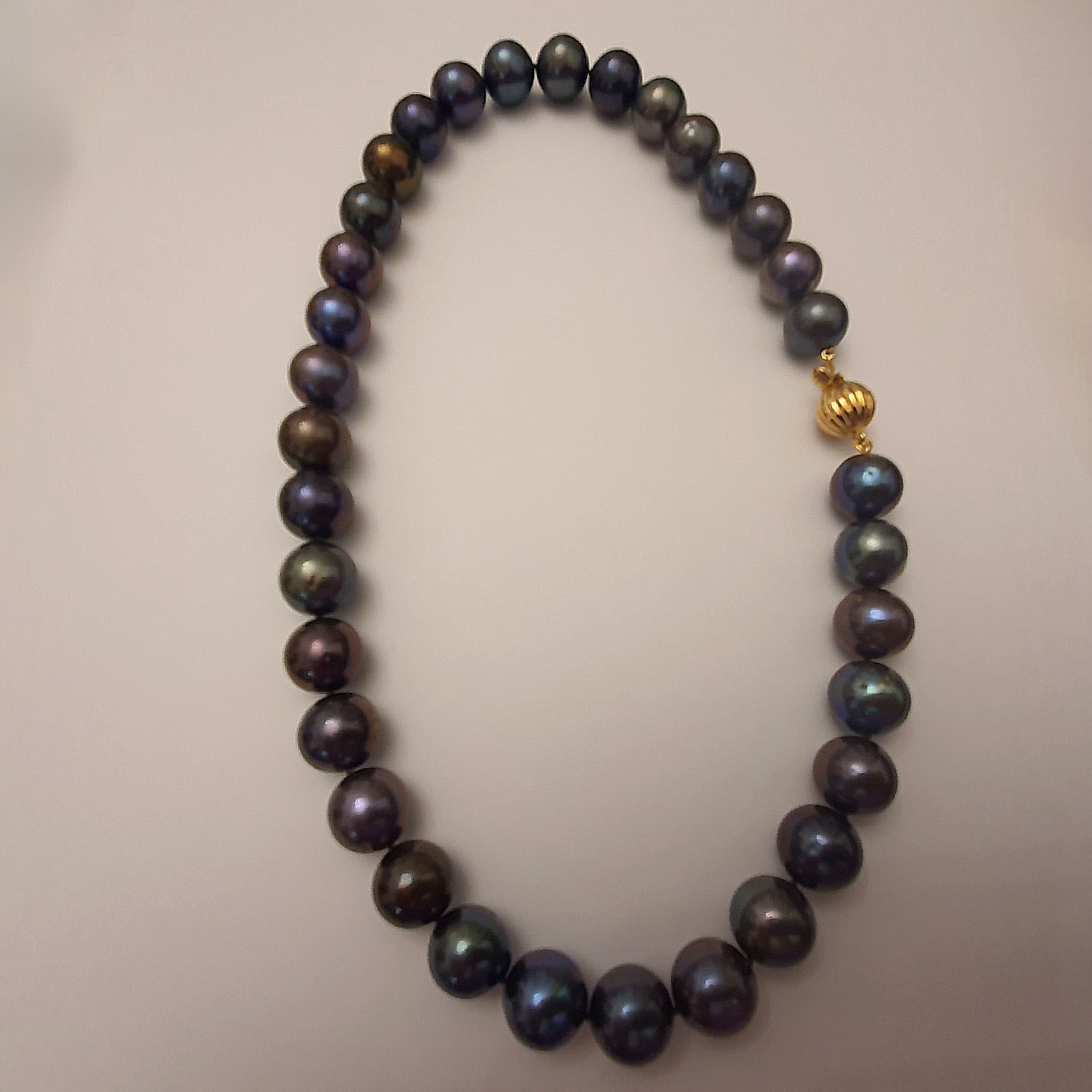 colier perle naturale edison cu luciu foarte bun si bun, rotunde de 11.5 - 12.5mm, cu mici imperfectiuni naturale cu impact nesemnificativ asupra imaginii de ansamblu, montate pe fir dublu de matase, cu inchizatoare de 10mm din argint 925 vermeil aur galben 18k, in greutate totala de 80,55 grame; culorile, induse in timpul cresterii, sunt deosebit de frumoase si elegante, cu tonuri de verde, bronz, aubergine, albastru si roz; lungimea este de 43.5cm cu tot cu inchizatoare; culorile dimenziunile si lungimea il fac potrivit pentru tinutele office si sport/casual-elegant