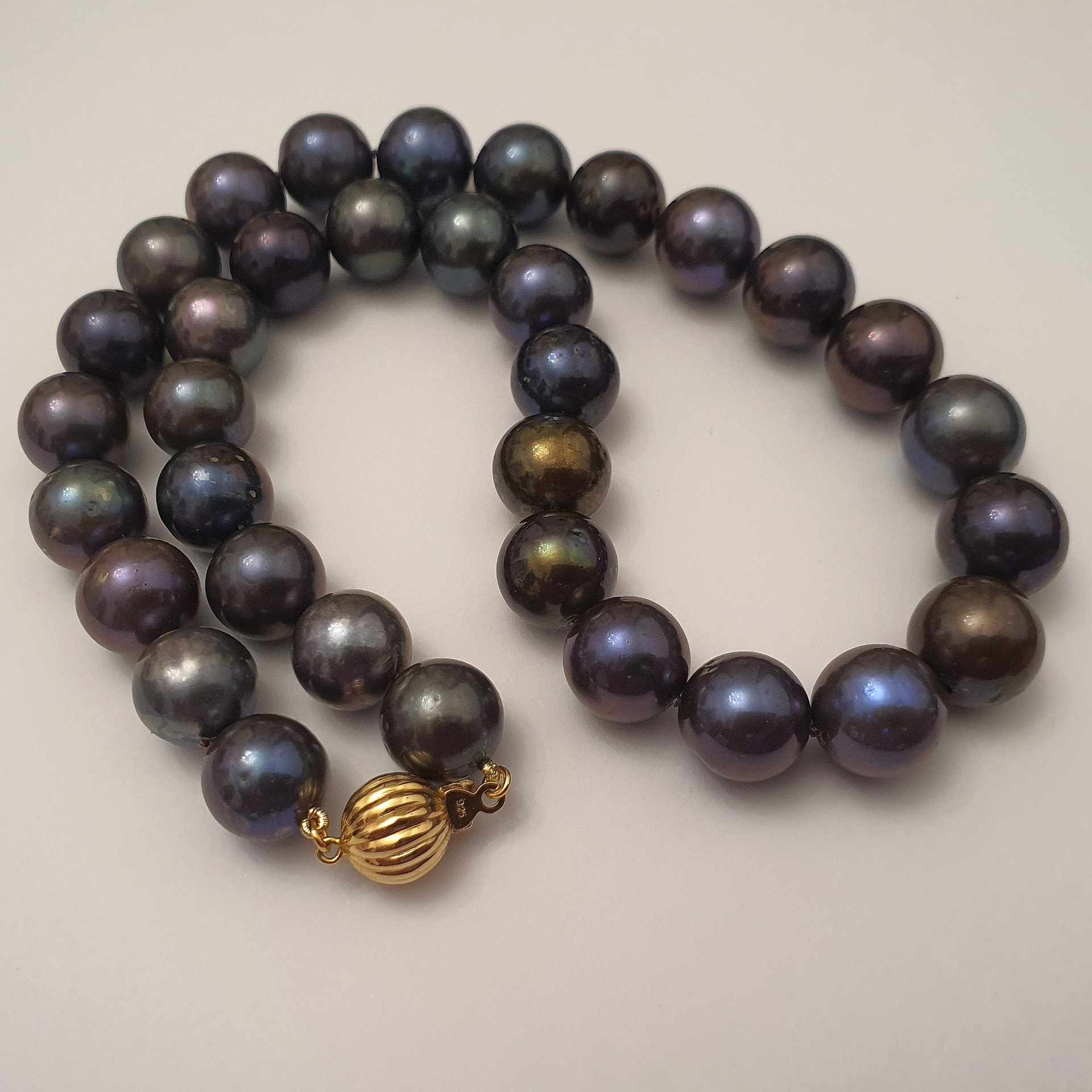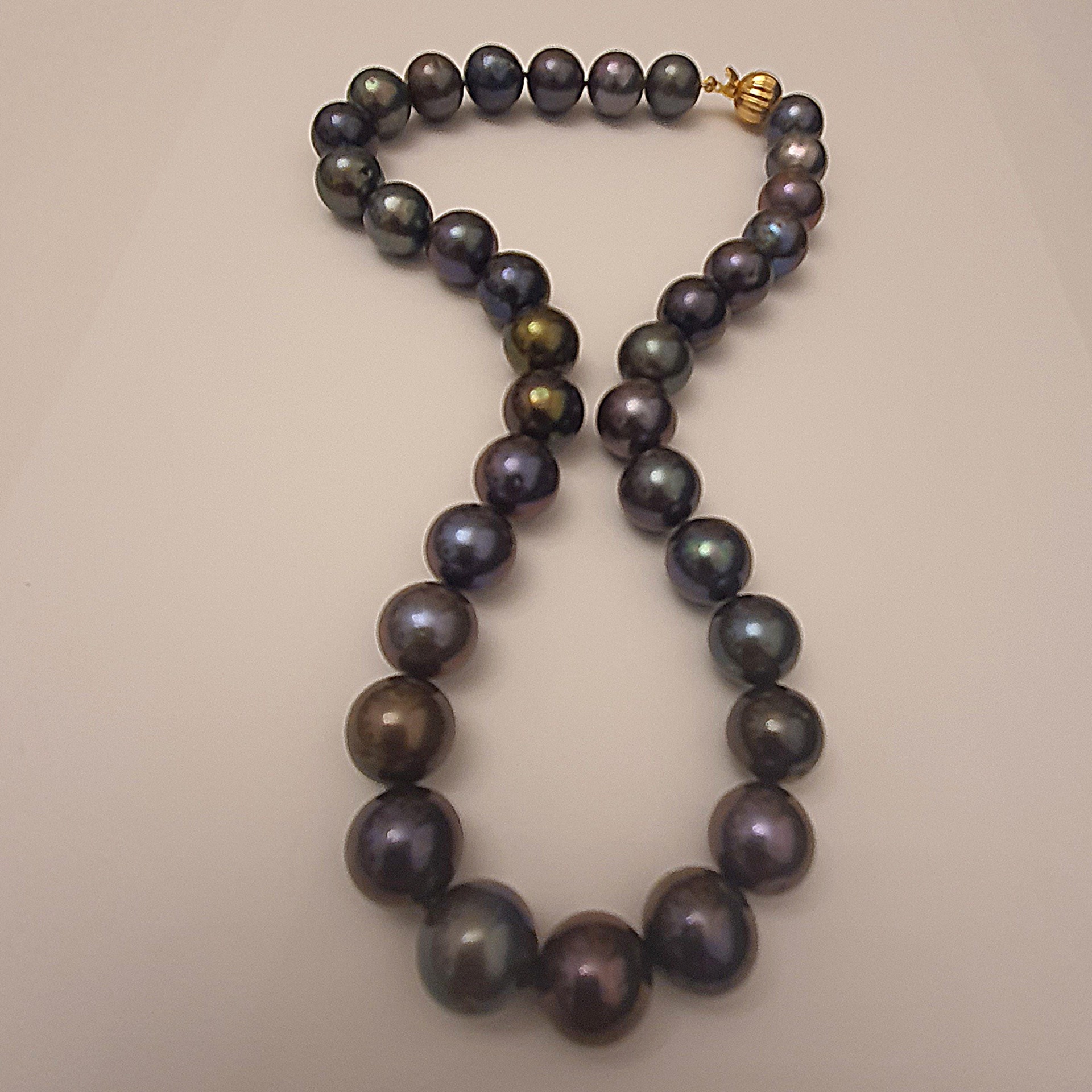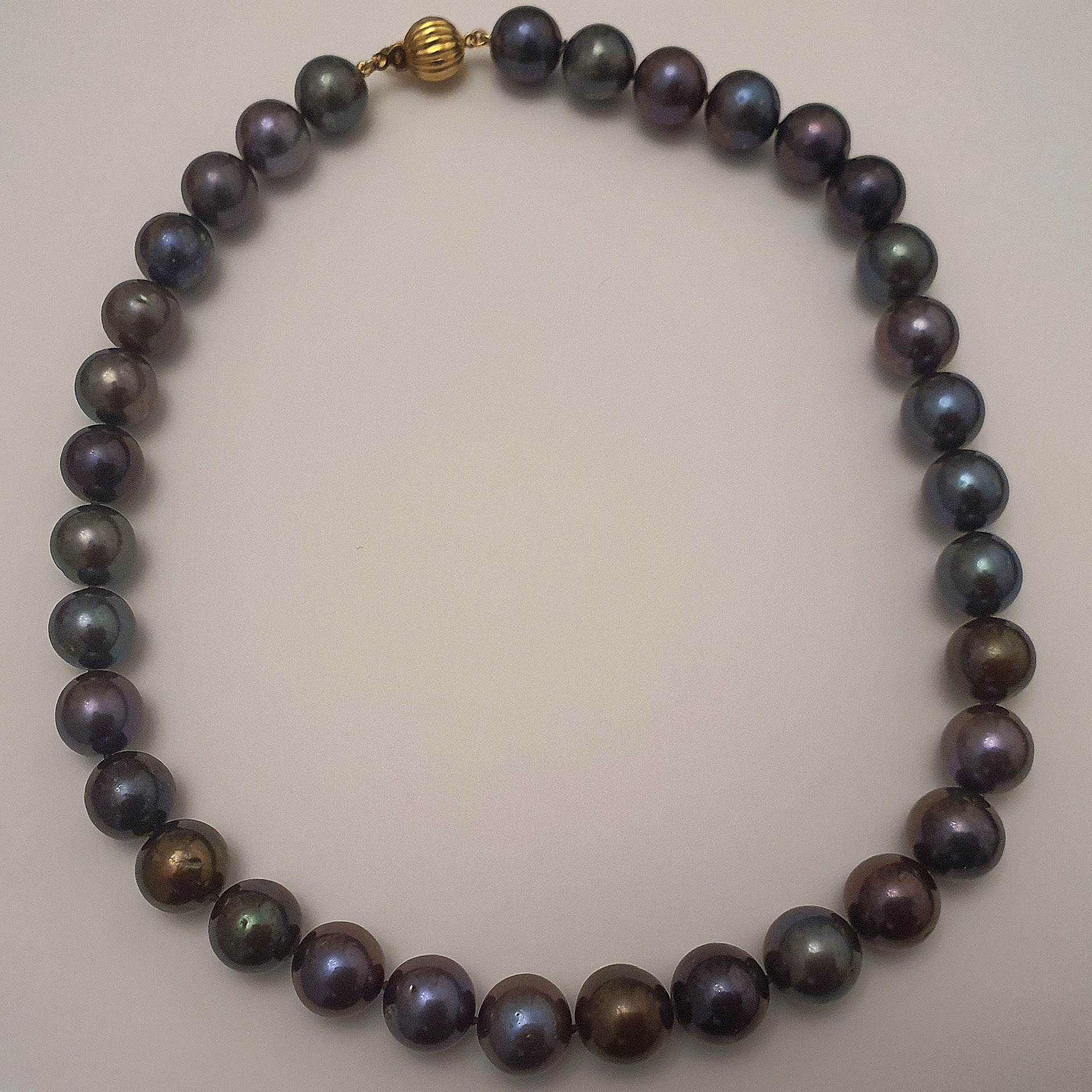 colier perle naturale edison cu luciu foarte bun si bun, rotunde de 11.5 - 12.5mm, cu mici imperfectiuni naturale cu impact nesemnificativ asupra imaginii de ansamblu, montate pe fir dublu de matase, cu inchizatoare de 10mm din argint 925 vermeil aur galben 18k, in greutate totala de 80,55 grame; culorile, induse in timpul cresterii, sunt deosebit de frumoase si elegante, cu tonuri de verde, bronz, aubergine, albastru si roz; lungimea este de 43.5cm cu tot cu inchizatoare; culorile dimenziunile si lungimea il fac potrivit pentru tinutele office si sport/casual-elegant