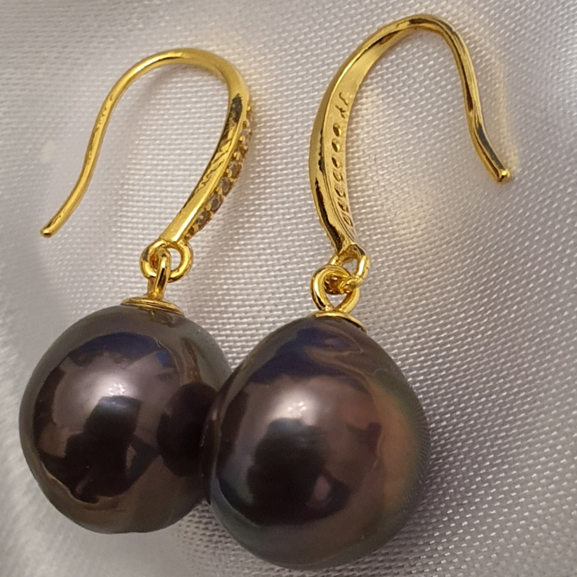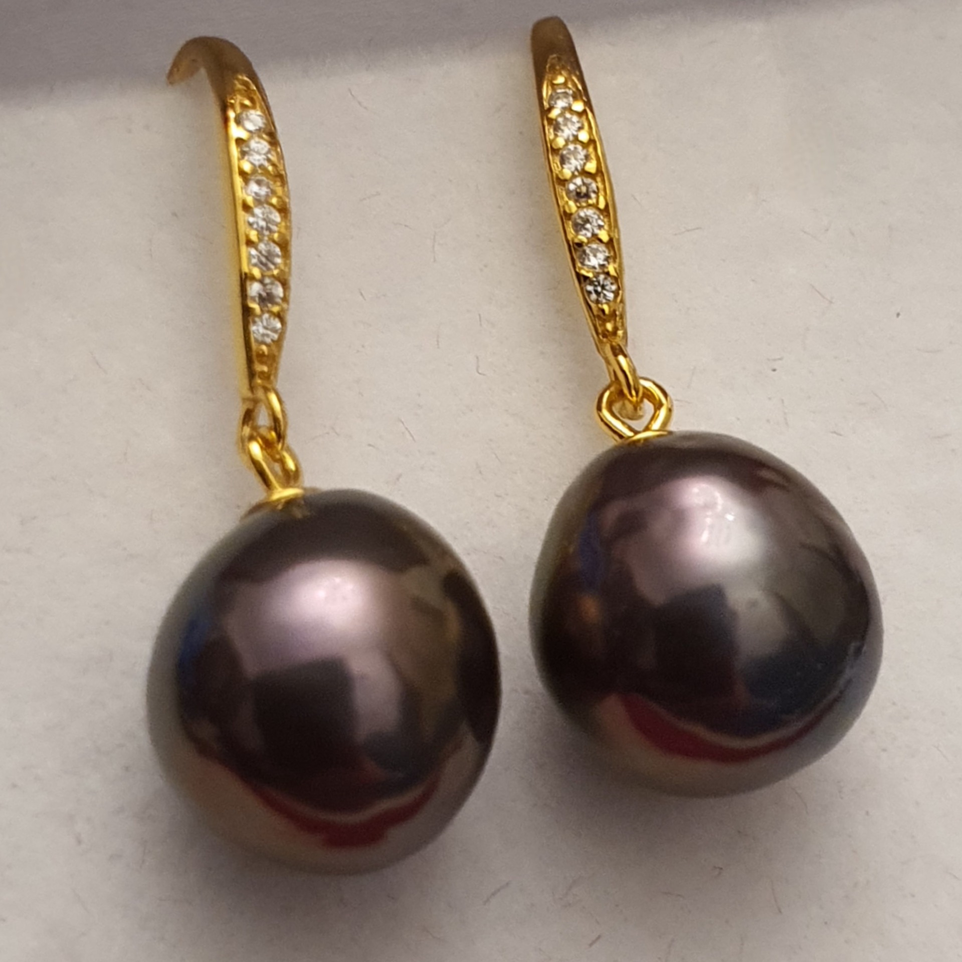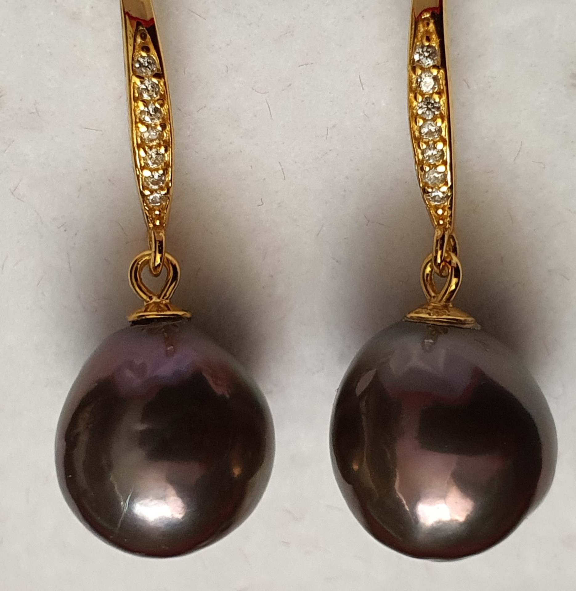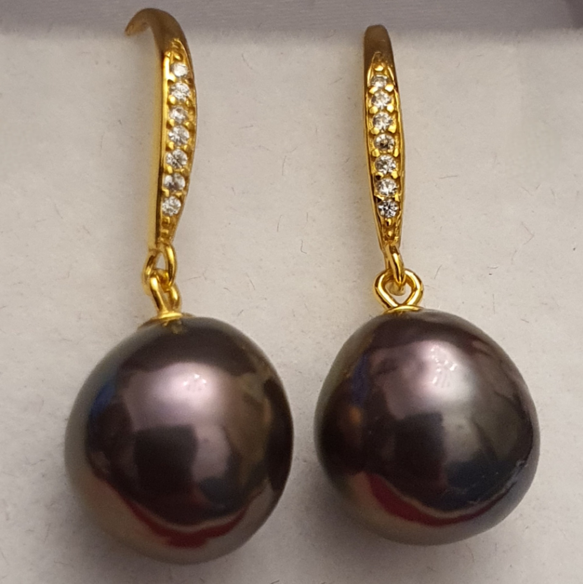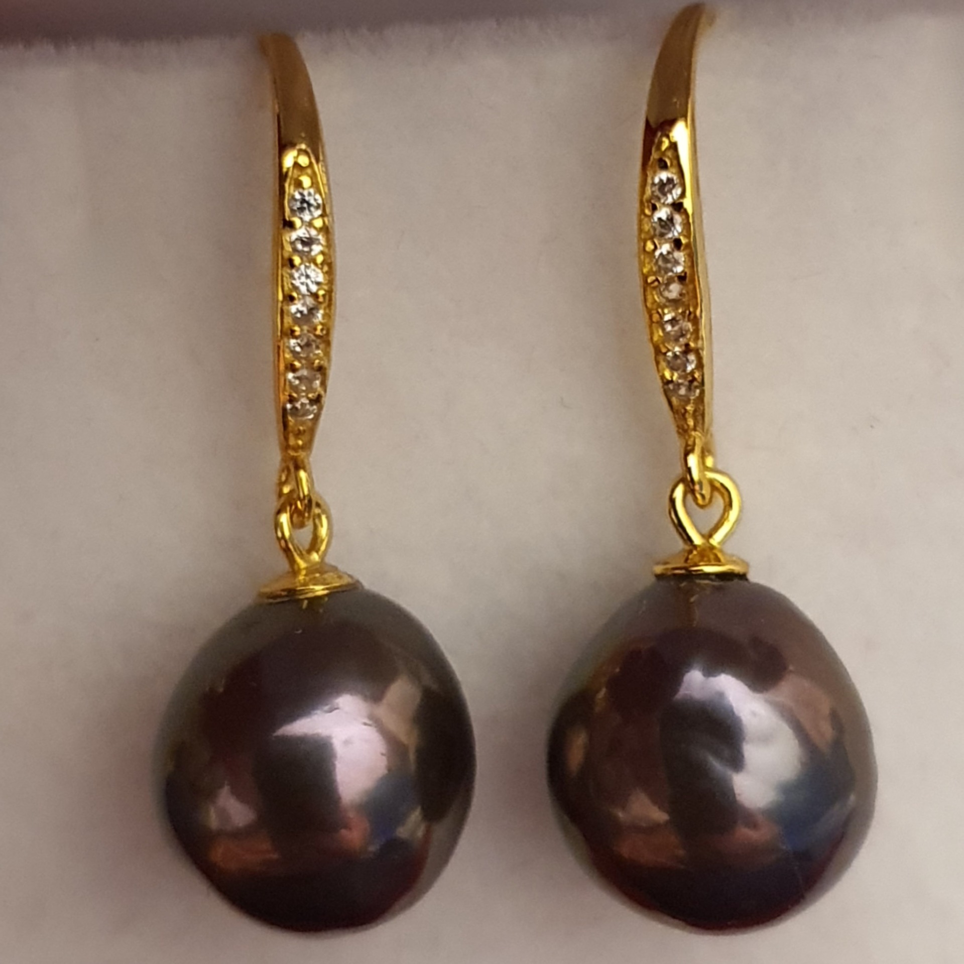 cercei argint 925 vermeil aur galben 18k, in greutate de 3.67 grame, ornati cu cristale incolore si perle naturale Edison negre-aubergine-verzui, cu luciu foarte bun, cu cateva imperfectiuni naturale, de 11 x 10.5mm; cerceii au lungimea de aprox. 2.8cm
